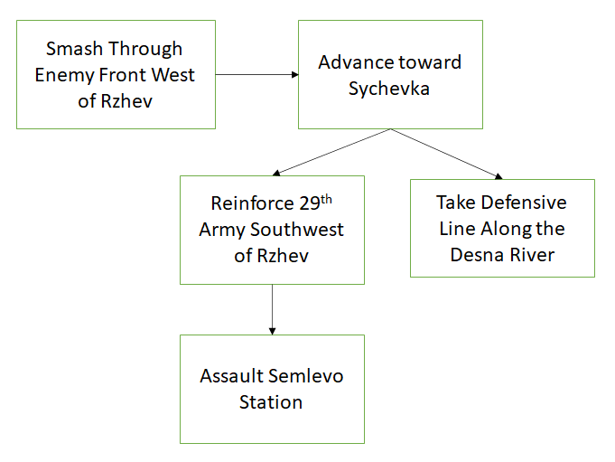 - The commander of the Kalinin Front is to detach part of its force in order to smash the enemy’s Rzhev grouping and to occupy Rzhev, and with a shock grouping in strength of two armies consisting of fourteen-fifteen rifle divisions, a cavalry corps and a large number of tanks, to attack in the general direction of Sychevka, Viaz’ma with the task, having seized the railroad and major Gzhatsk – Smolensk road west of the railroad, to deprive the enemy of his main communications. Next, encircle and then capture or destroy the enemy’s entire Mozhaisk – Gzhatsk – Viaz’ma grouping jointly with the Western Front.