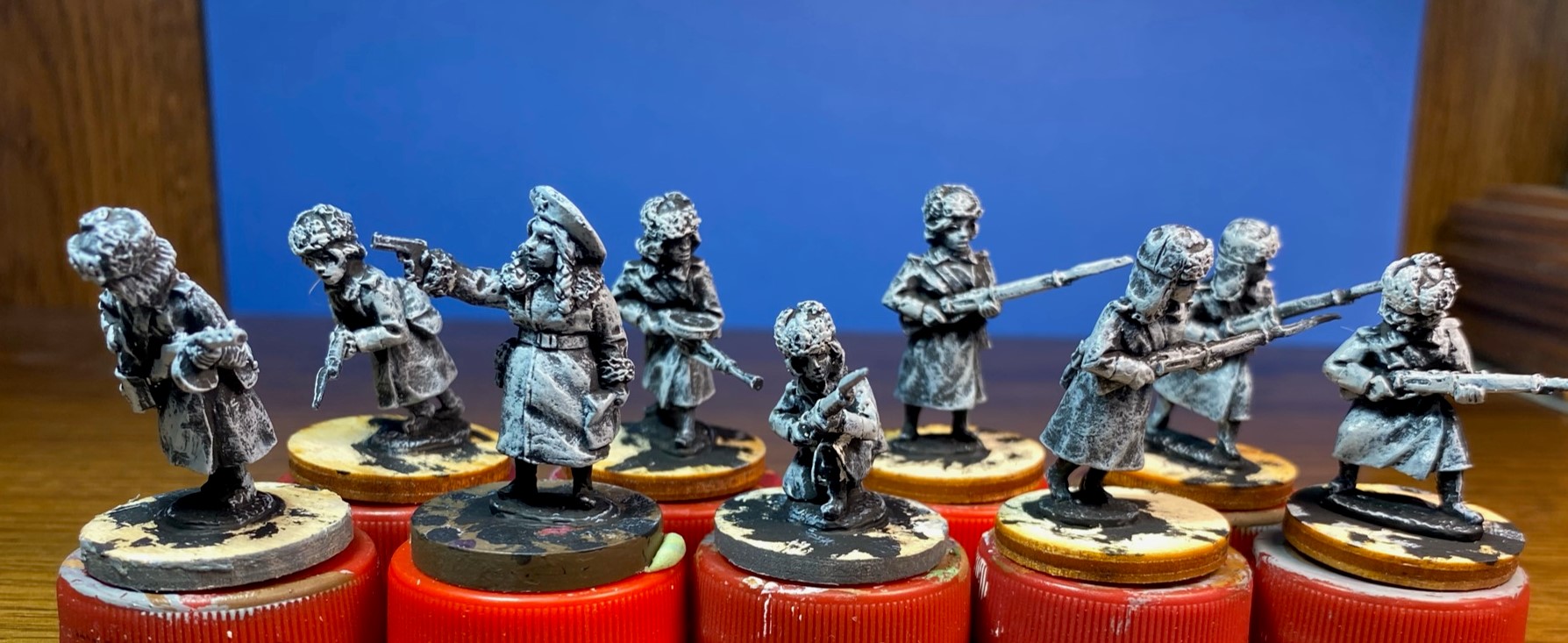 I’ve grouped the miniatures I received from the Bad Squiddo Games Kickstarter into small batches for painting. In the first batch is the officer, the LMG team, and the six riflewomen in greatcoats.