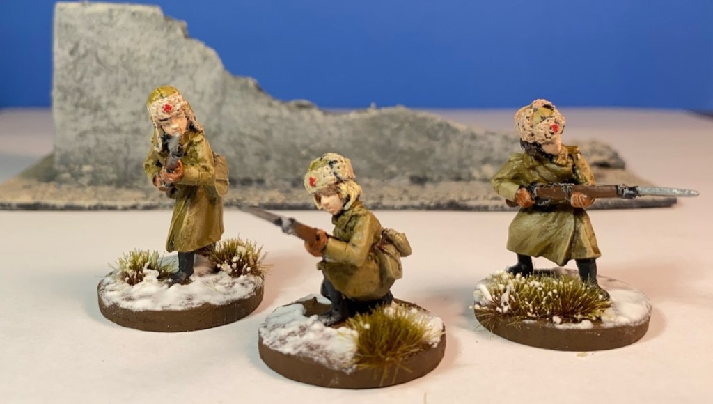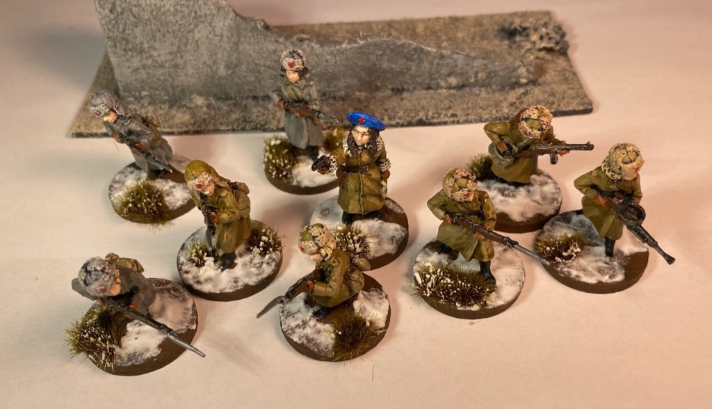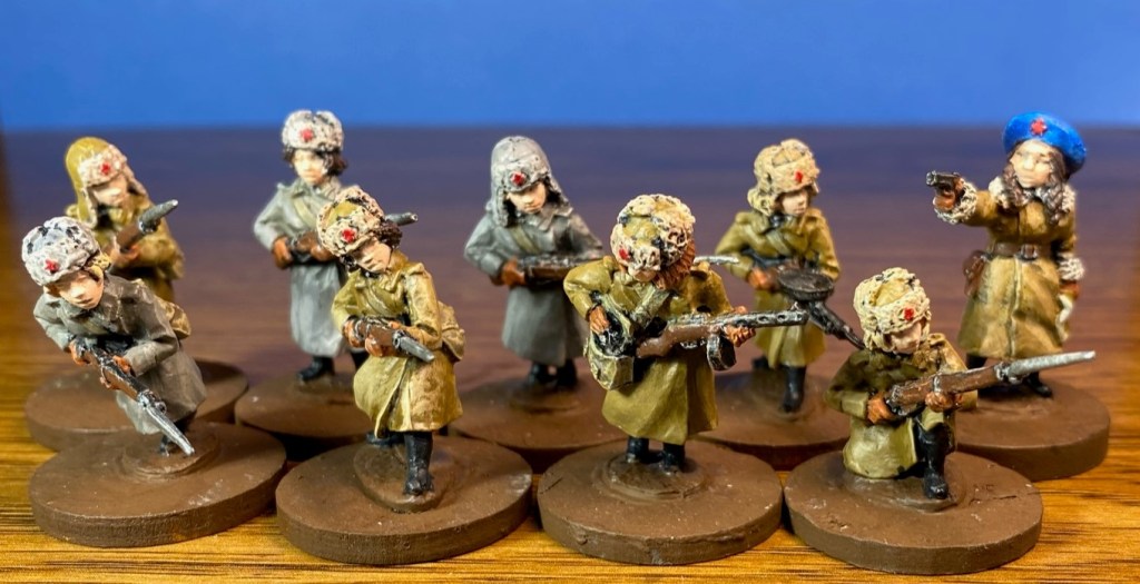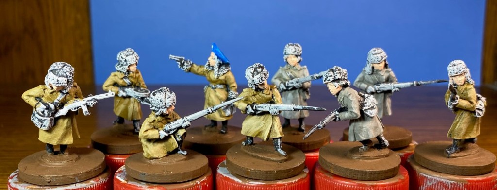 I opted to go with Reaper Walnut Brown for for the boots, highlighted with a dust color (can’t remember what, which is bad since more Soviets are on the table for November!) because I was concerned that pure black would contrast too strongly with their uniforms. Your black boots look good, though. Maybe I should try that next month. I like your approach that not everybody got coats from the same factory/dye lot.