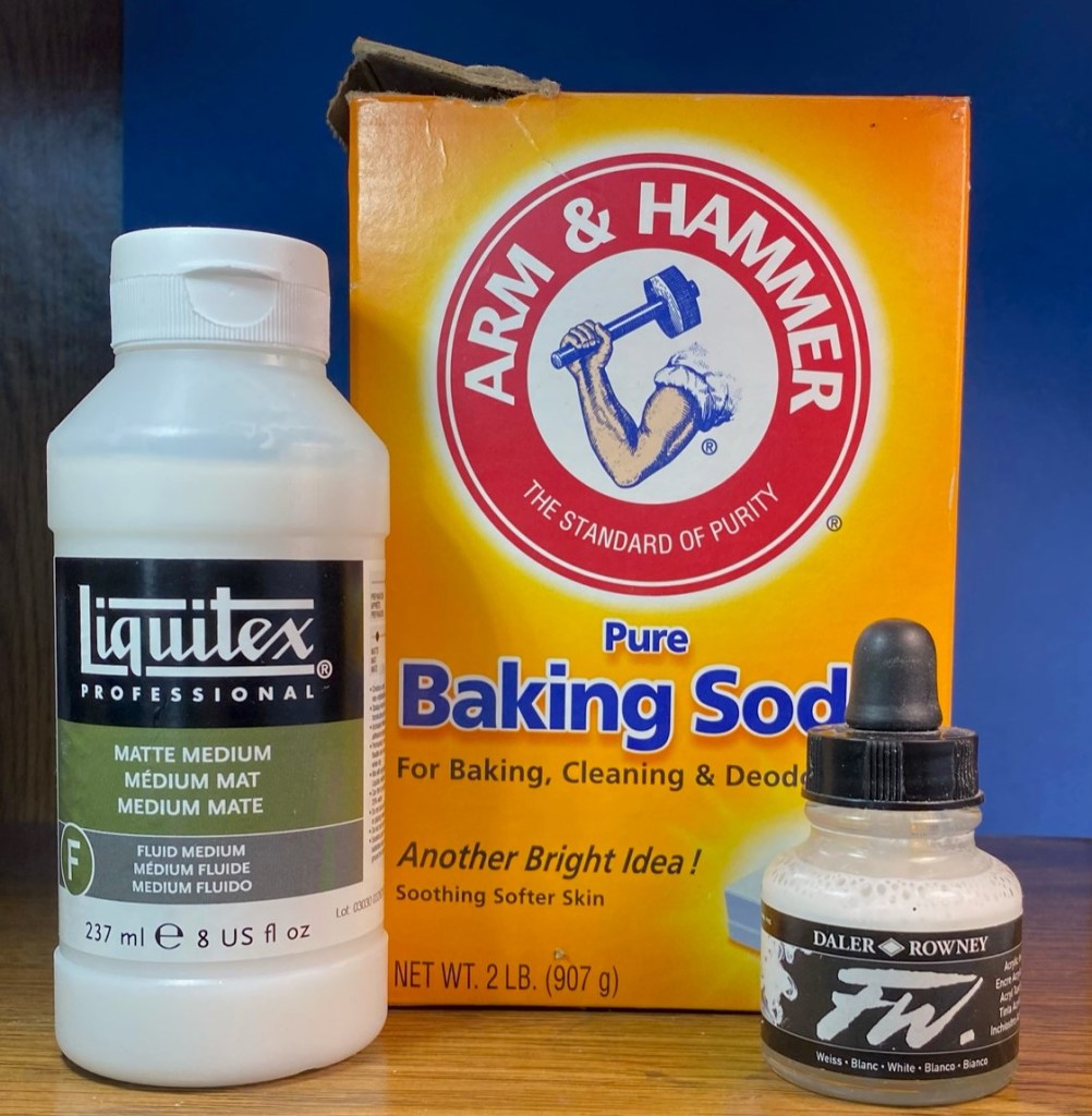 I started with equal amounts of baking soda, matte medium and white ink. Then I added more baking soda until I got the consistency I wanted. Using an old brush, I spread the “snow” mixture on the bases taking care to sprinkle some onto the grass tufts.