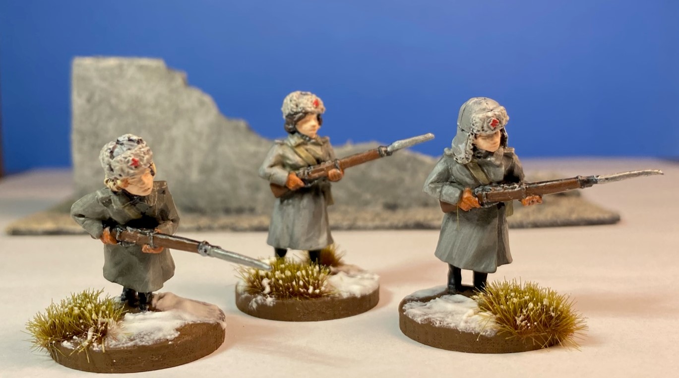 The brown ushankas were painted Vallejo Khaki Grey with Khaki highlights. The fur was painted with a mix of Reaper Creamy Ivory mixed with a small amount of Reaper Chestnut Brown. The gray ushankas were painted with Vallejo Medium Sea Grey and highlighted with a mix of Vallejo Medium Sea Grey and Reaper Creamy Ivory. The fur for the gray caps was painted with the Medium Sea Grey and Creamy Ivory color I used for the highlight. Finally, all of the fur was given a light dry brushing of Reaper Creamy Ivory.