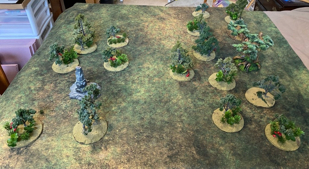 I guess I’m mentioning this alternative method for those who might dismiss this wonderful game because they don’t have the space for a 3’x3′ playing area, or they can’t keep a 3’x3′ area set up for gaming for the time it would take to play a game, OR (and this is a big one for some gamers) they don’t have enough terrain for an entire table. For these people, the game can be played with a sheet of paper and a 12″x12″ surface.