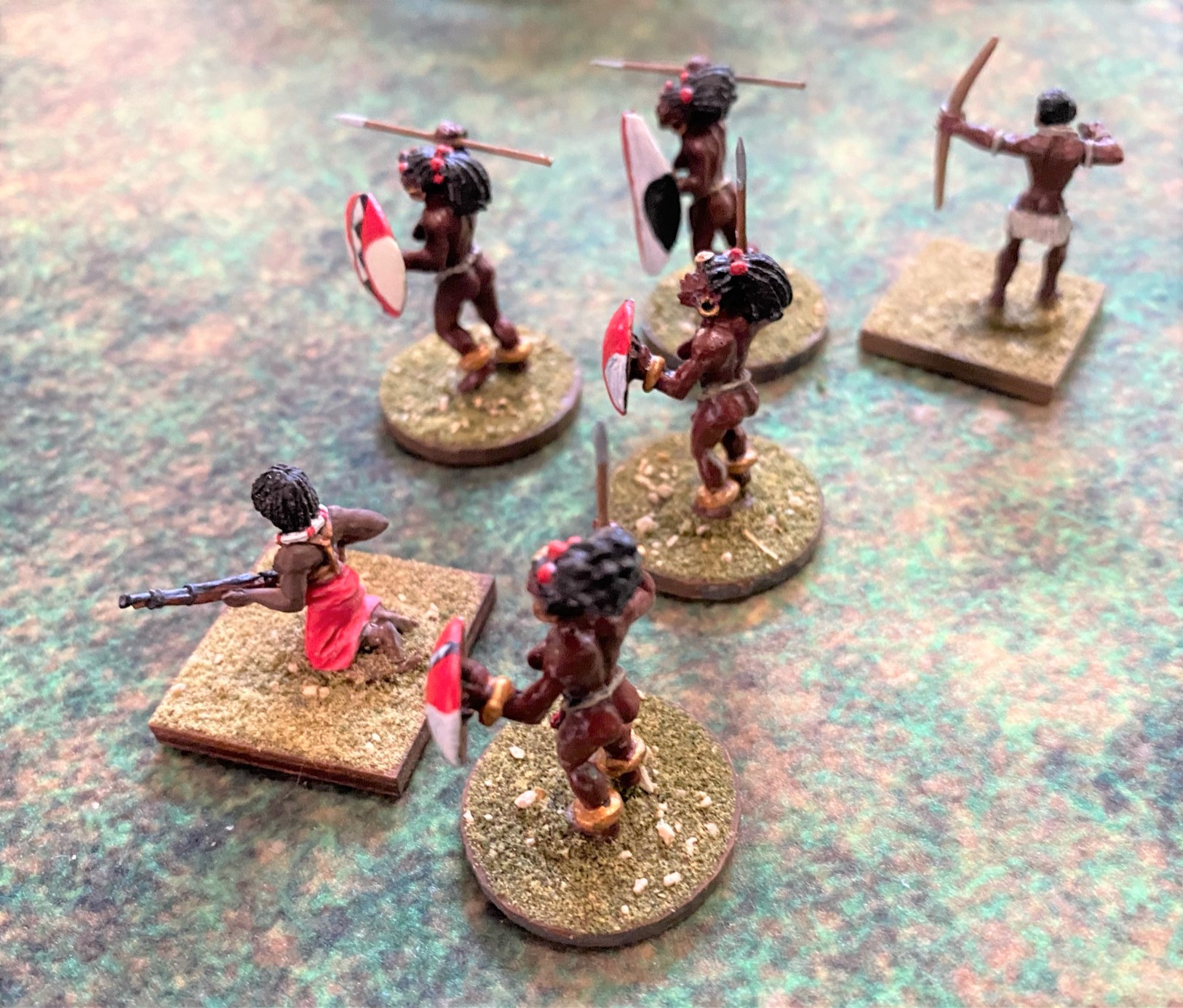 While I enjoy the rule mechanics of Fortunes Won and Lost, I find the army lists don’t quite fit the games I want to play. In making the lists fit generic tropes, the lists are too restrictive in reflecting the period. Fortunately, all of the character types needed are scattered through the lists, so it is not hard at all to build a custom list for the groups I want to play. For example, the guide in the European Adventurers list is armed with a European Rifle, but the figure I want to use is a Ruga Ruga armed with a rifled musket who can be found in the Tribal Natives list. Suppose I want my adventurers to hire a bearer, instead of using the Rep 3 Local armed with a melee weapon in the Adventurers list, I can use an unarmed Rep 3 Civilian from the Civilians List. So it is possible to build your band with figures you already own with what is represented on the figure.