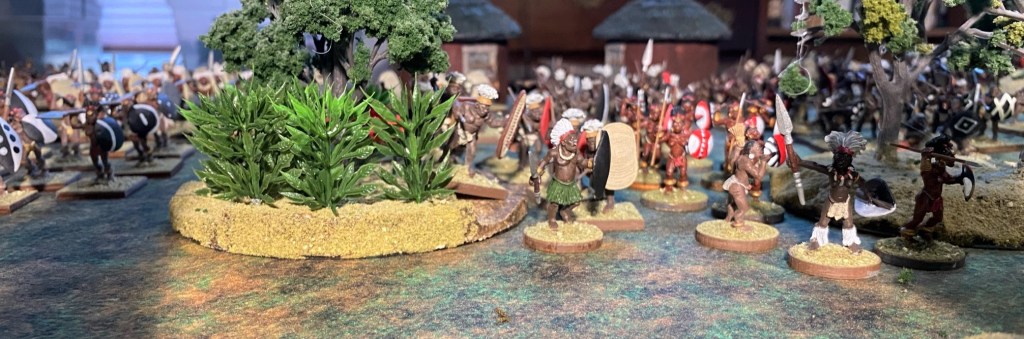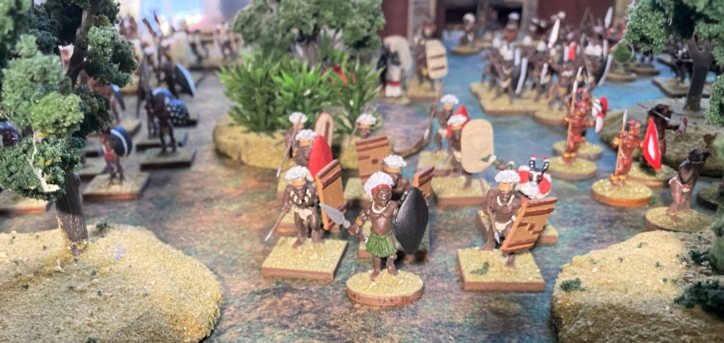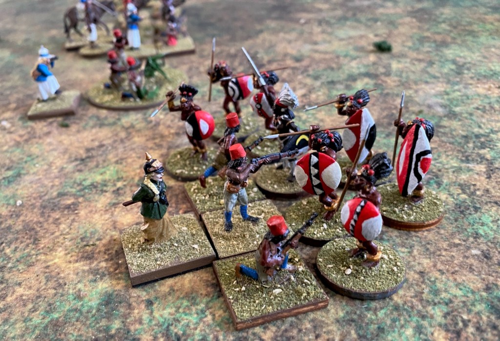 Unlike the tribal armies, European or European trained armies get to perform two actions when active. For its first action, the Third Platoon completes its melee with the Charging Bulls Bendi, destroying the unit. It uses its second action to fire a volley at the Red Shield Bendi causing a casualty and forcing the unit to halt in place.