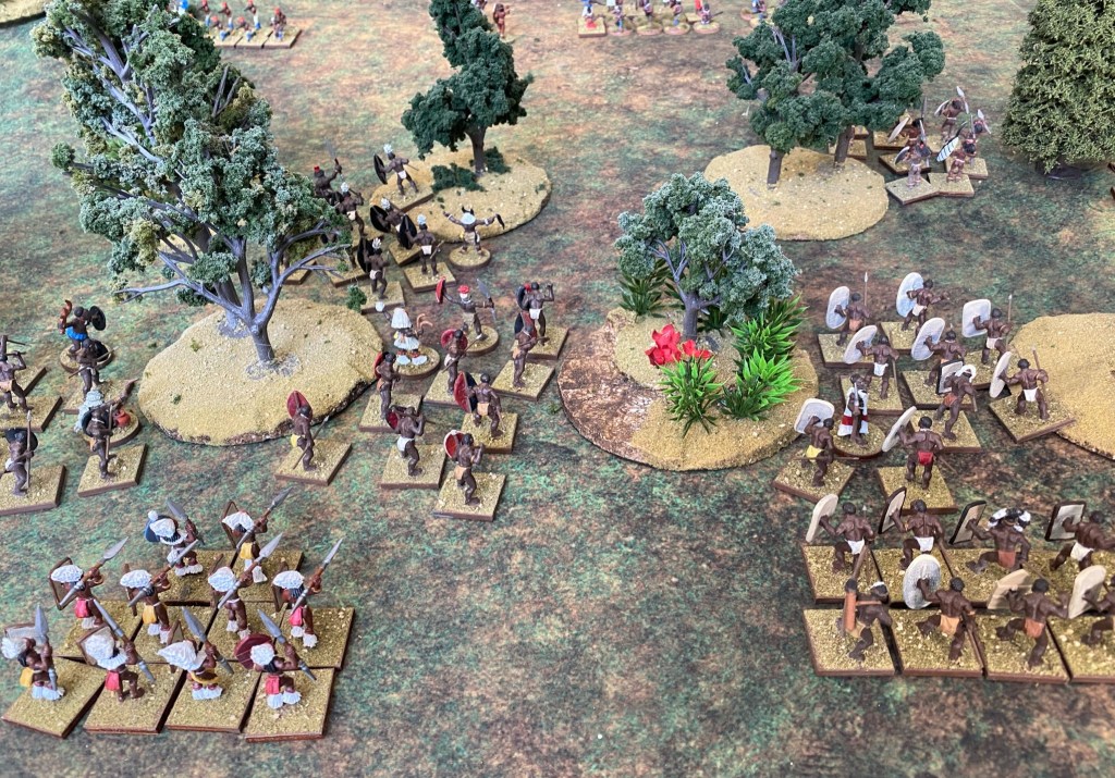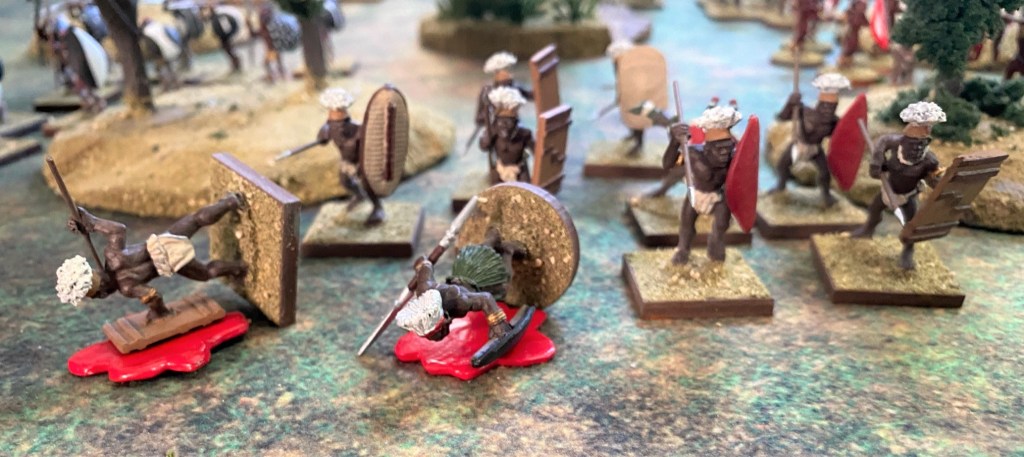 The Fourth Platoon also fires at volley and the Forest Song Bendi causing the warrior women to also halt in place. The halt doesn’t last long, when the Rebels activate, the Forest Song charges the Fourth Platoon, which fires again, but fails to halt the charge. In the melee, Forest Song receives two casualties and one runs away.