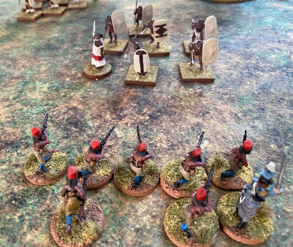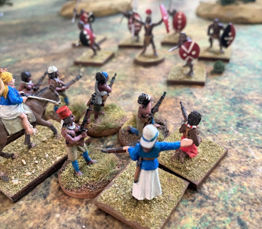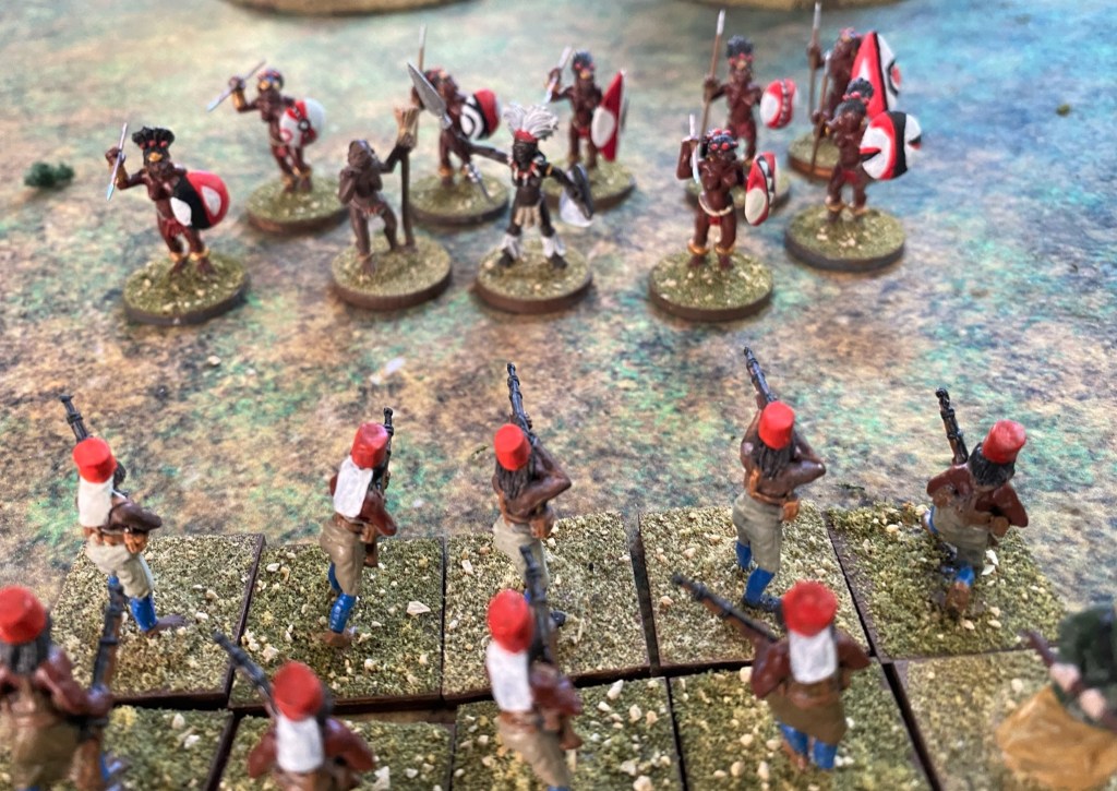 In this turn one of the Rebels’ elite units, Swift Snake Bendi Shujaa (Bendi Shujaa means “band of warriors”), moves close enough to the Third Platoon to trigger a Test of Will. As a result, Third Platoon volley fires, which causes Swift Snake to move closer. This action in turn triggers a Test of Will from the Fourth Platoon which also volley fires at the rebel unit. The Swift Snake Bendi Shujaa takes two casualties including its leader. Swift Snake fails the Lost Leader Test by rolling double sixes causing the entire unit to flee.