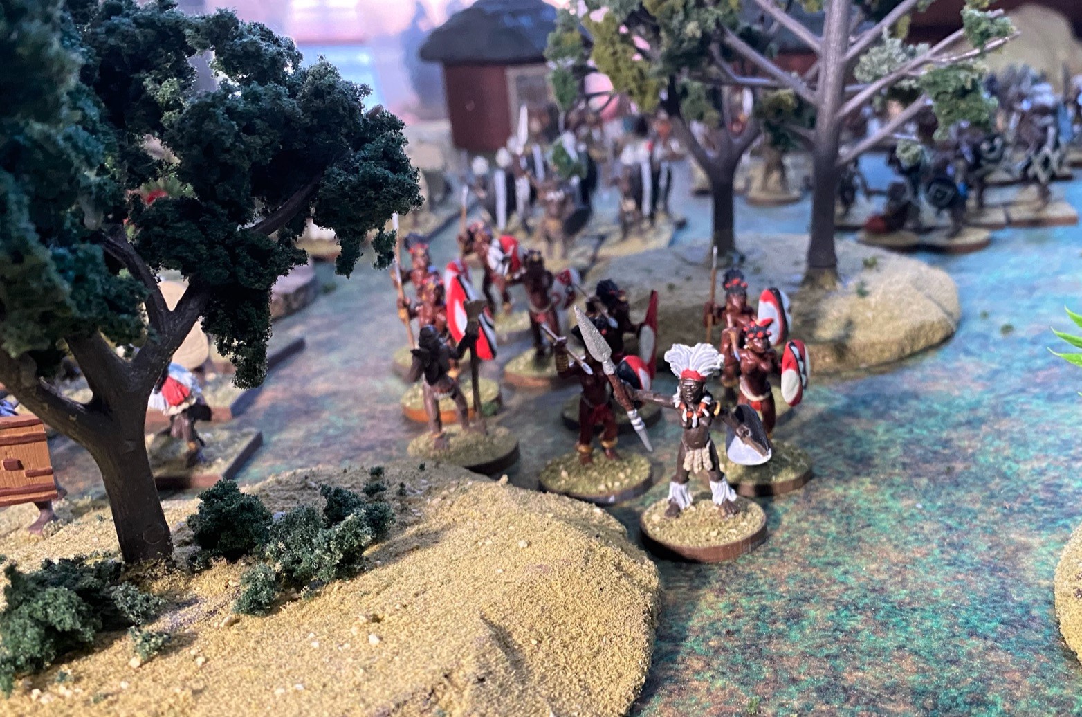 Unlike the tribal armies, European or European trained armies get to perform two actions when active. For its first action, the Third Platoon completes its melee with the Charging Bulls Bendi, destroying the unit. It uses its second action to fire a volley at the Red Shield Bendi causing a casualty and forcing the unit to halt in place.