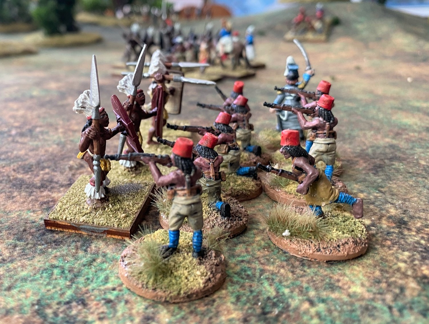 In this turn one of the Rebels’ elite units, Swift Snake Bendi Shujaa (Bendi Shujaa means “band of warriors”), moves close enough to the Third Platoon to trigger a Test of Will. As a result, Third Platoon volley fires, which causes Swift Snake to move closer. This action in turn triggers a Test of Will from the Fourth Platoon which also volley fires at the rebel unit. The Swift Snake Bendi Shujaa takes two casualties including its leader. Swift Snake fails the Lost Leader Test by rolling double sixes causing the entire unit to flee.