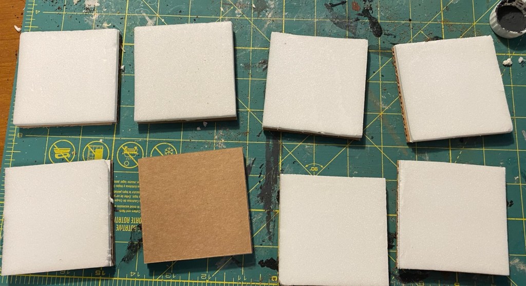 Just as in my Dungeon Tiles post, you first use your T-square or framing square to cut 3″ squares out of the foam board and cardboard. Then you glue them together and set them aside to dry.