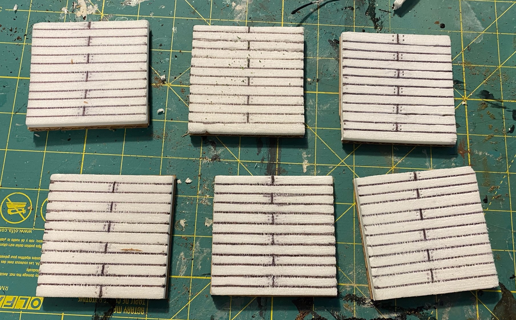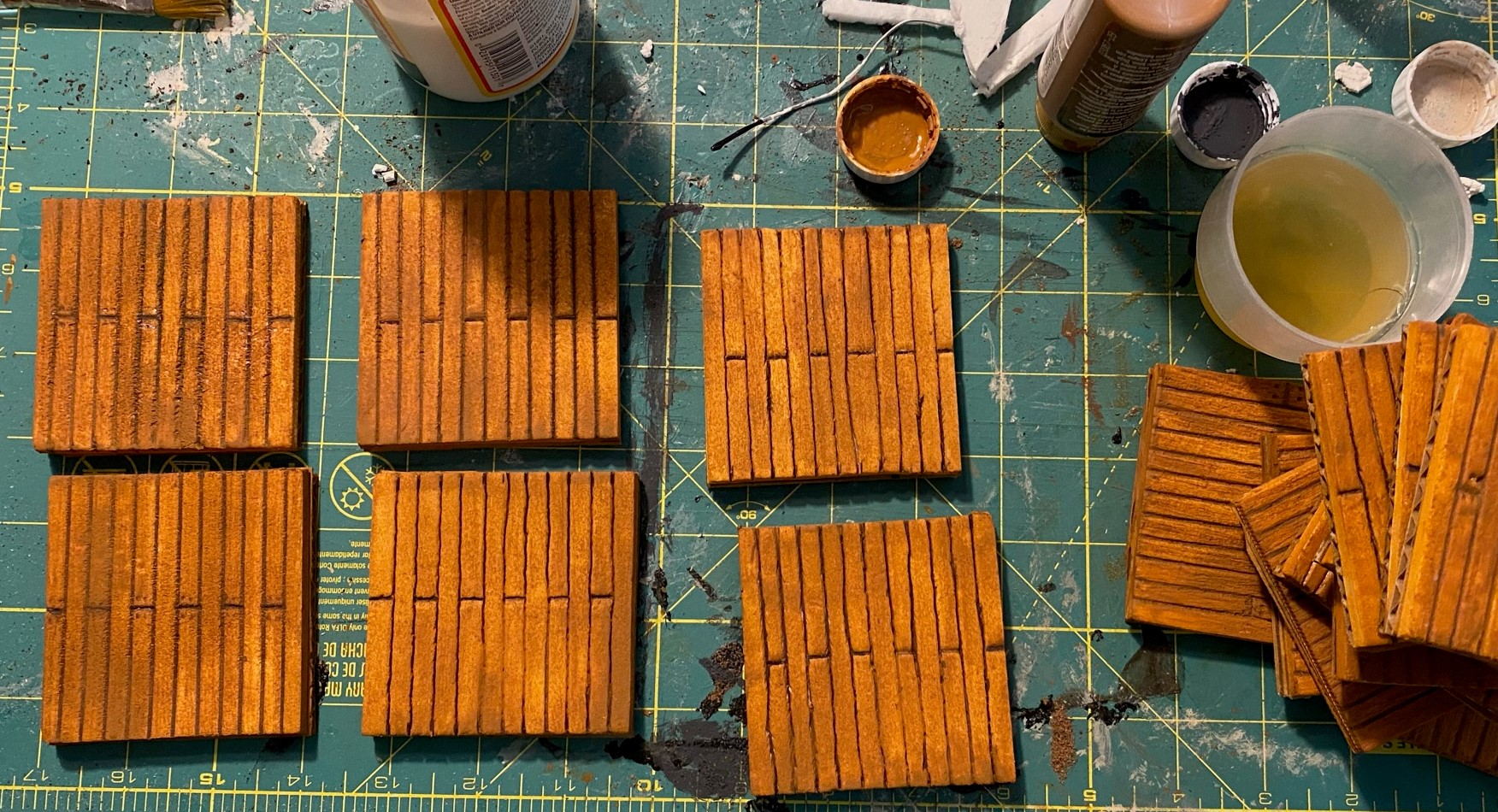 Anyway, between the time I cut the tiles and finished them, Brent of Goobertown Hobbies showed a method of making tavern floors using “popsicle” sticks on Paint Bravely the Podcast. In this method you trim craft sticks, or wooden coffee stirrer sticks to size and then glue them to foam board.