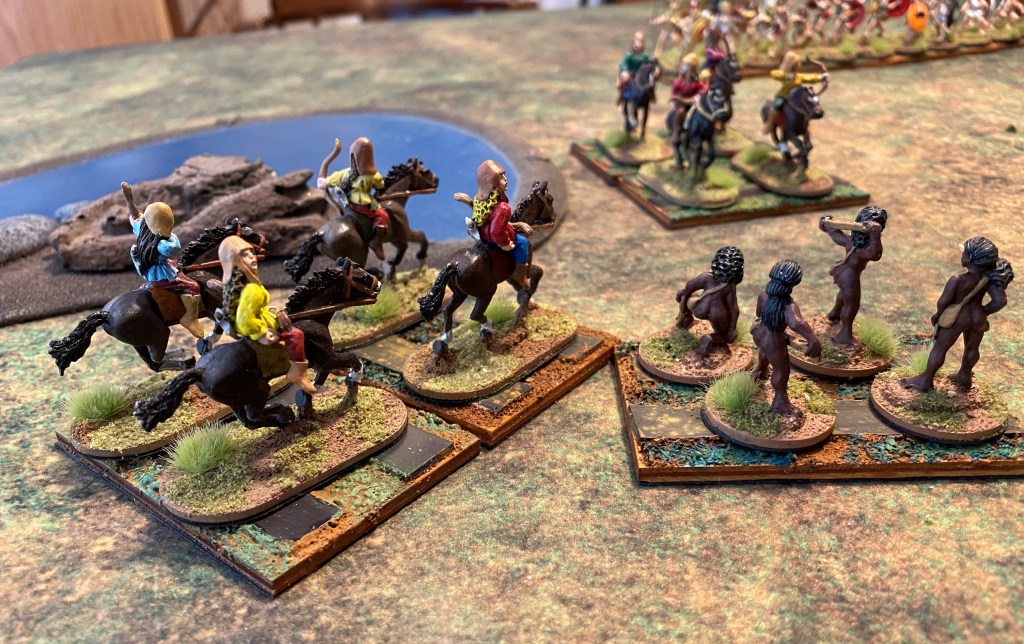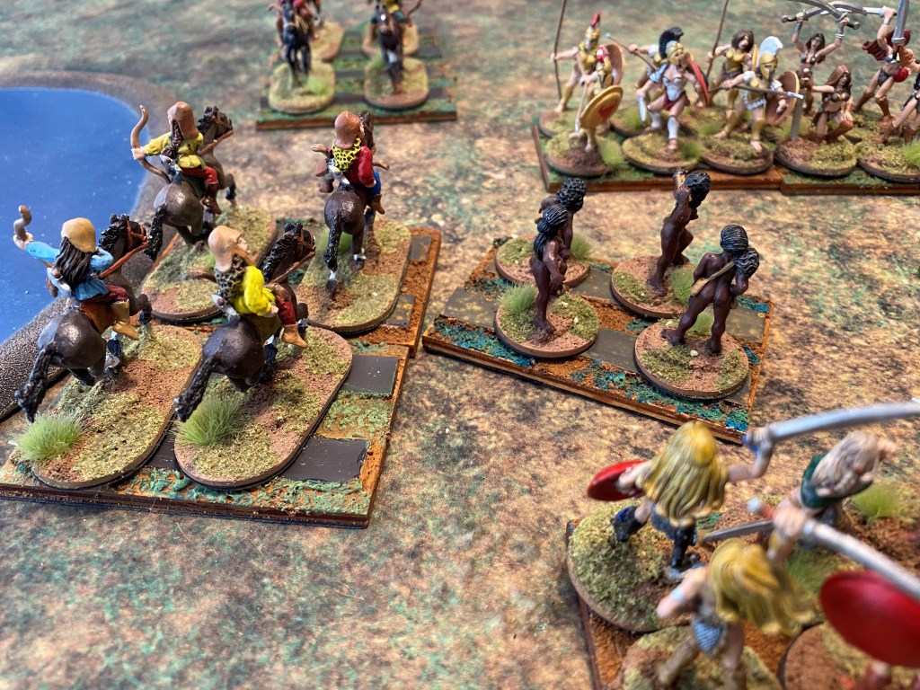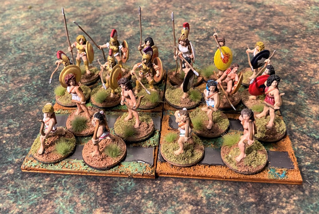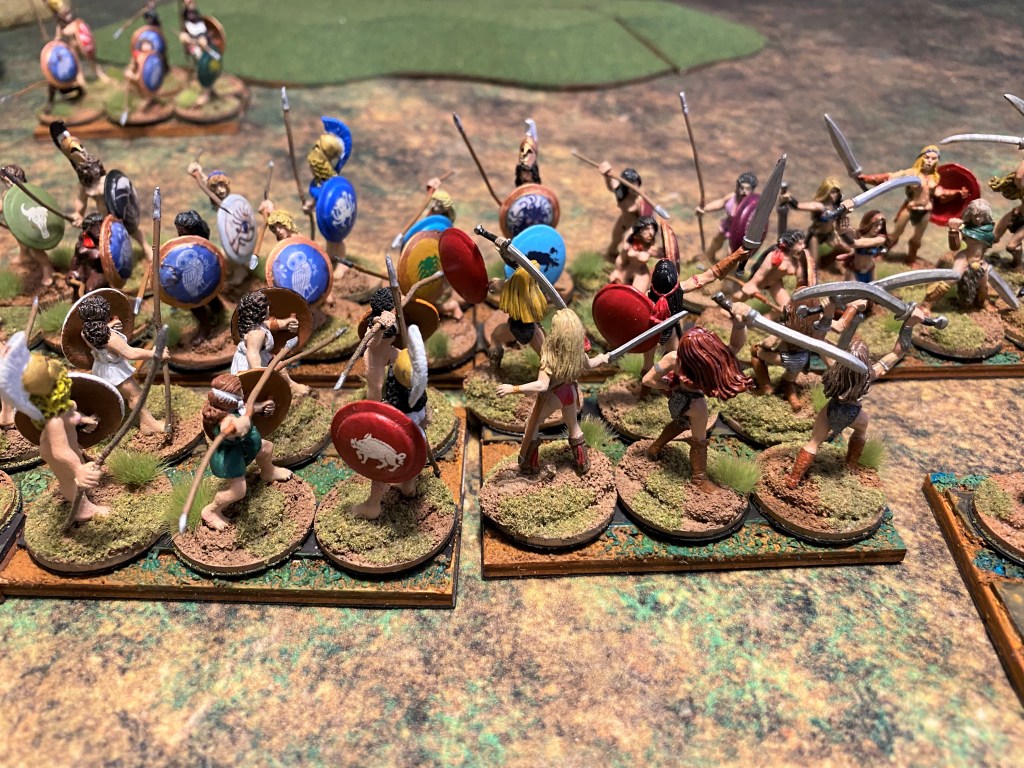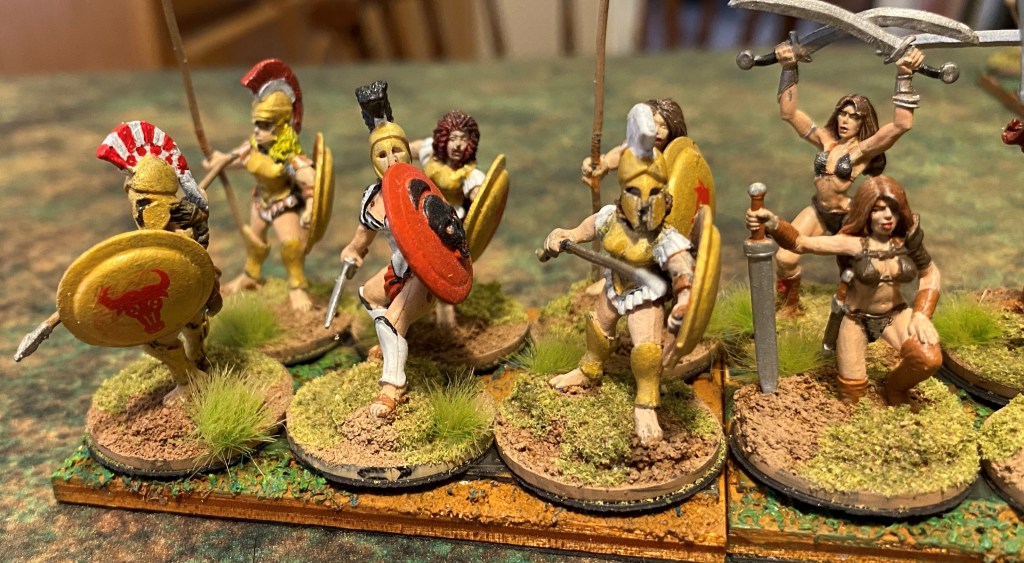 The first thing I have to address is the basing of figures. Both RRtK and WHtBK use the WRG/DBx basing conventions. Many ancients and fantasy rule sets use these conventions, it’s probably the closest thing to an industry standard. However, these base sizes are over forty years old. They were created when miniatures were actually 15mm and 25mm in size. Today’s 15mm figures are close to 18mm in size and 25mm gave way to heroic 28mm, which is closer to 32mm today. So, even from the very beginning, I used a different base size to fit my larger figures on. Also, having only three figures on a stand for a unit makes the unit look naked, and with some of the Amazons being nude, they look naked naked.