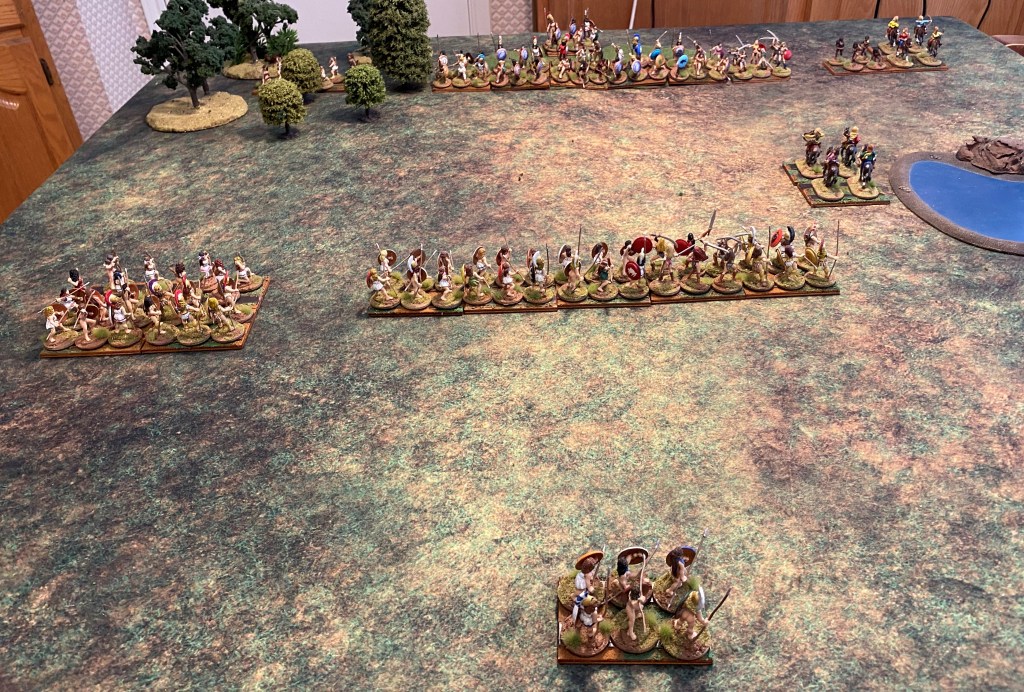 The “belos” is the missile fire of a hoplite battle. As the hoplites advance, the skirmishers are doing their best to disrupt the advance with arrows, sling shot, and javelins. It began in turn one, I drew first blood, but the Nycenaean army appeared unfazed. My Robot Wife frowns when she discovers she doesn’t have enough movement to charge, but then smiles when she realizes that I also lack the movement to charge.