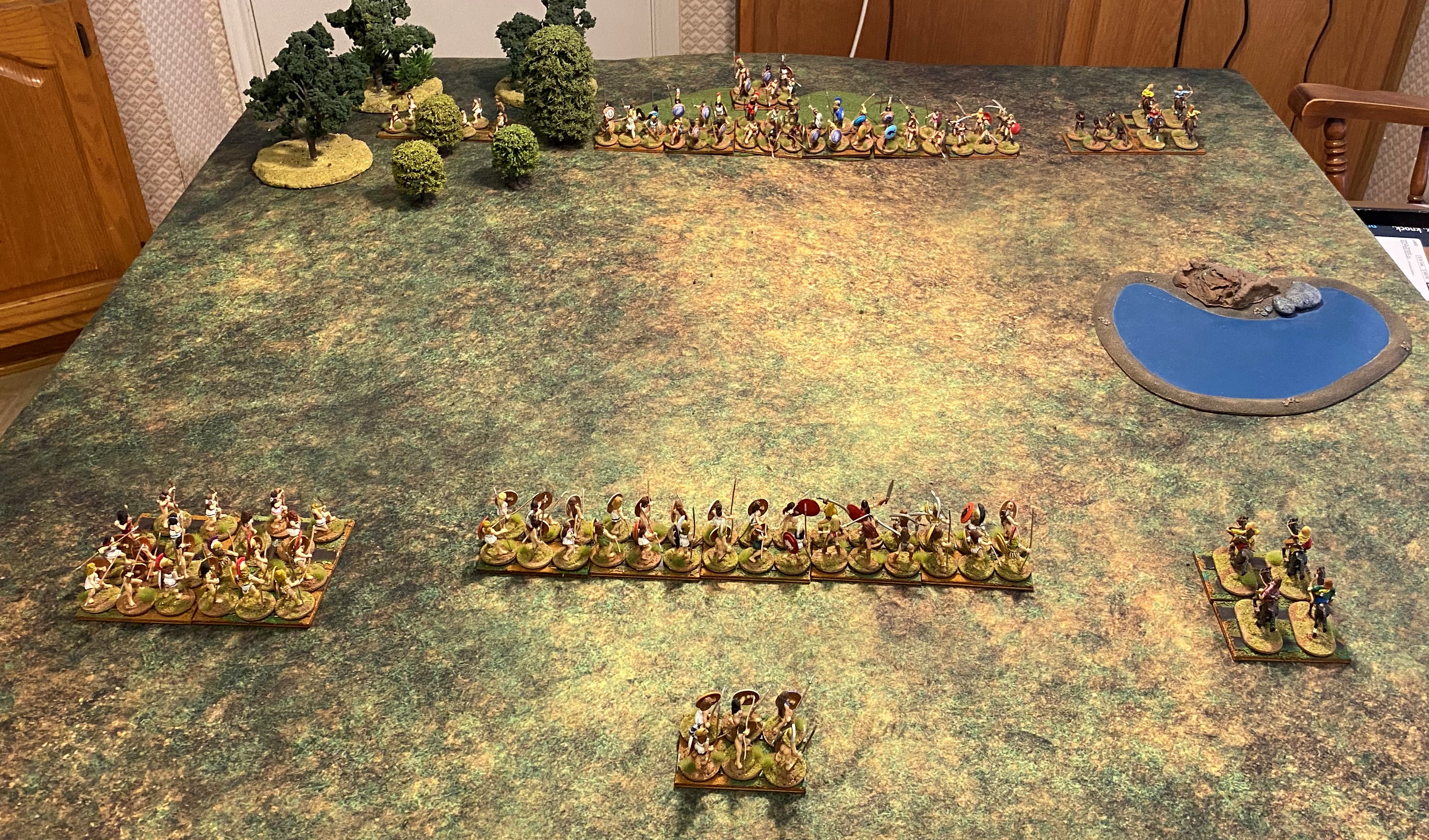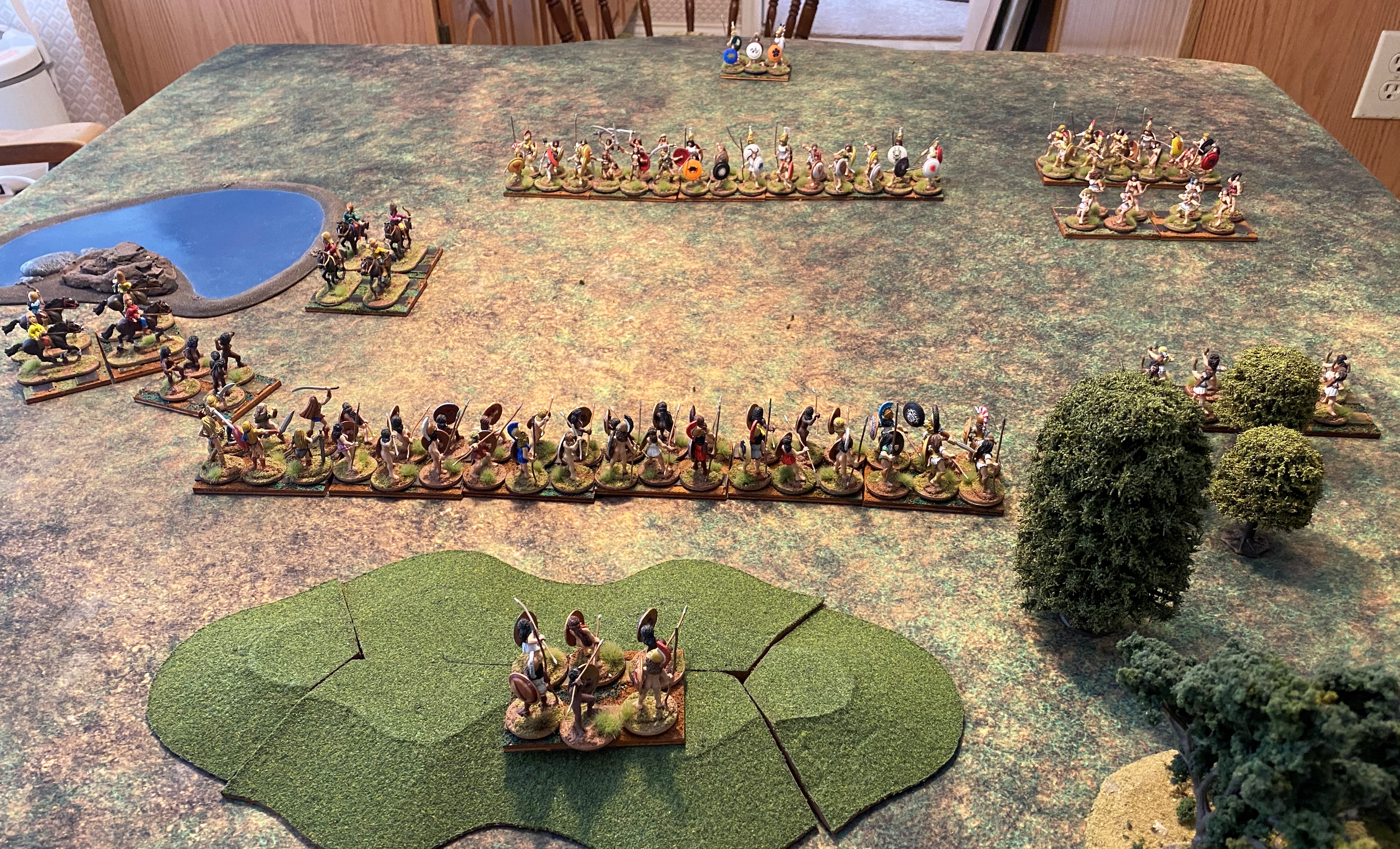 The attacker, the Nycenaean Amazons, will use the “Hammer and Anvil” tactic. She will have a strong center, a large left wing, a small right wing, and a small reserve. Normally, the Hammer and Anvil tactic will have a large right wing, but on her right side is a small lake, impassable terrain.