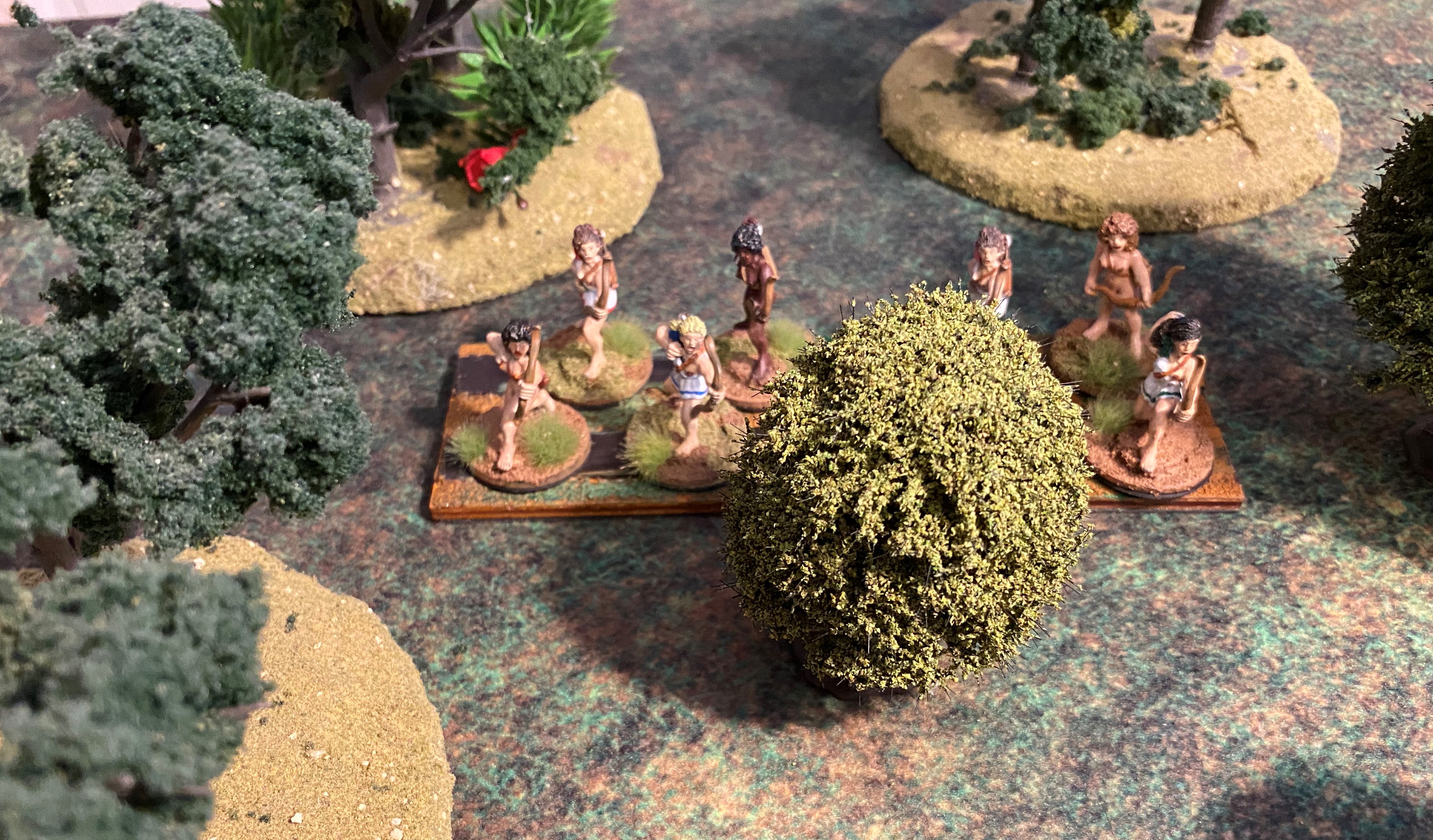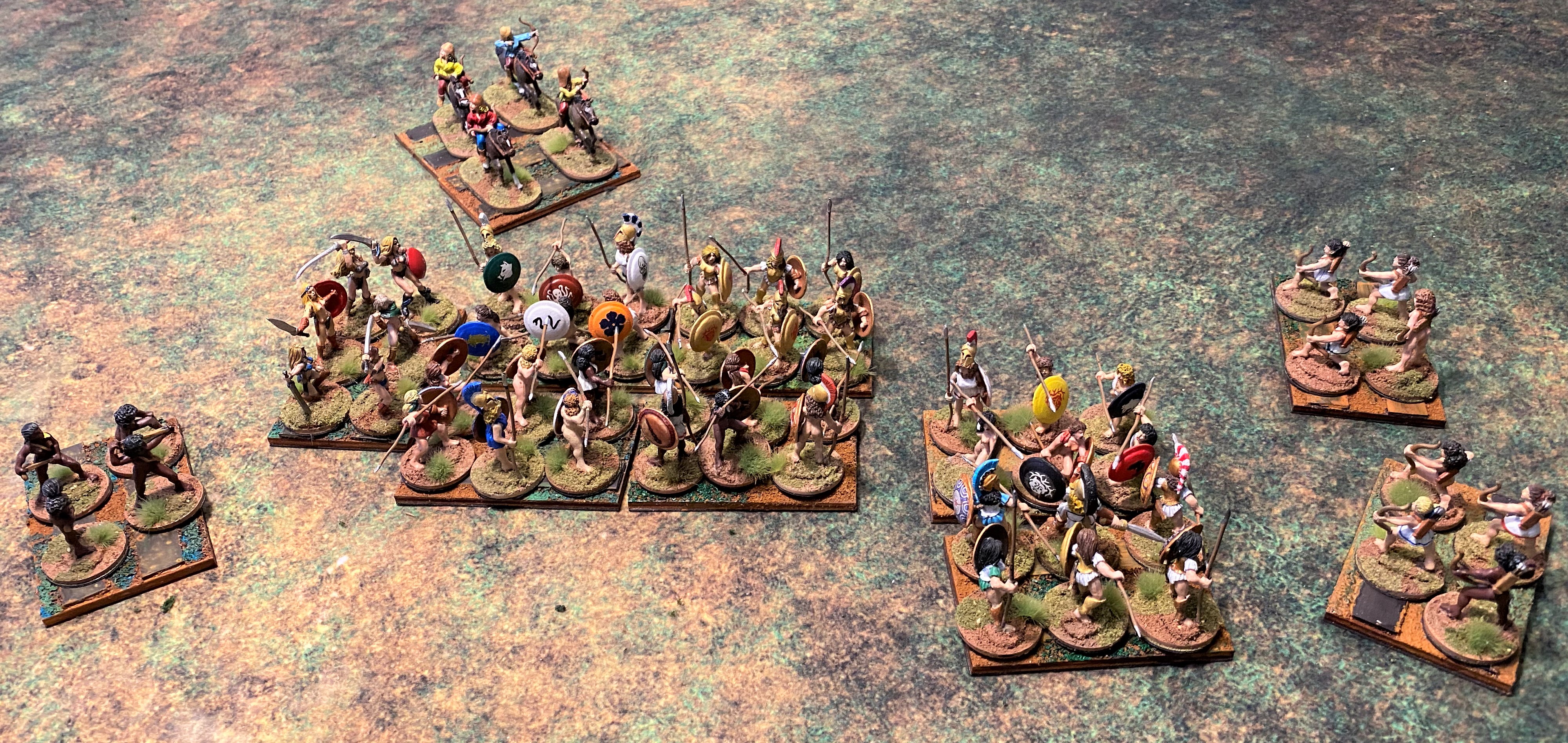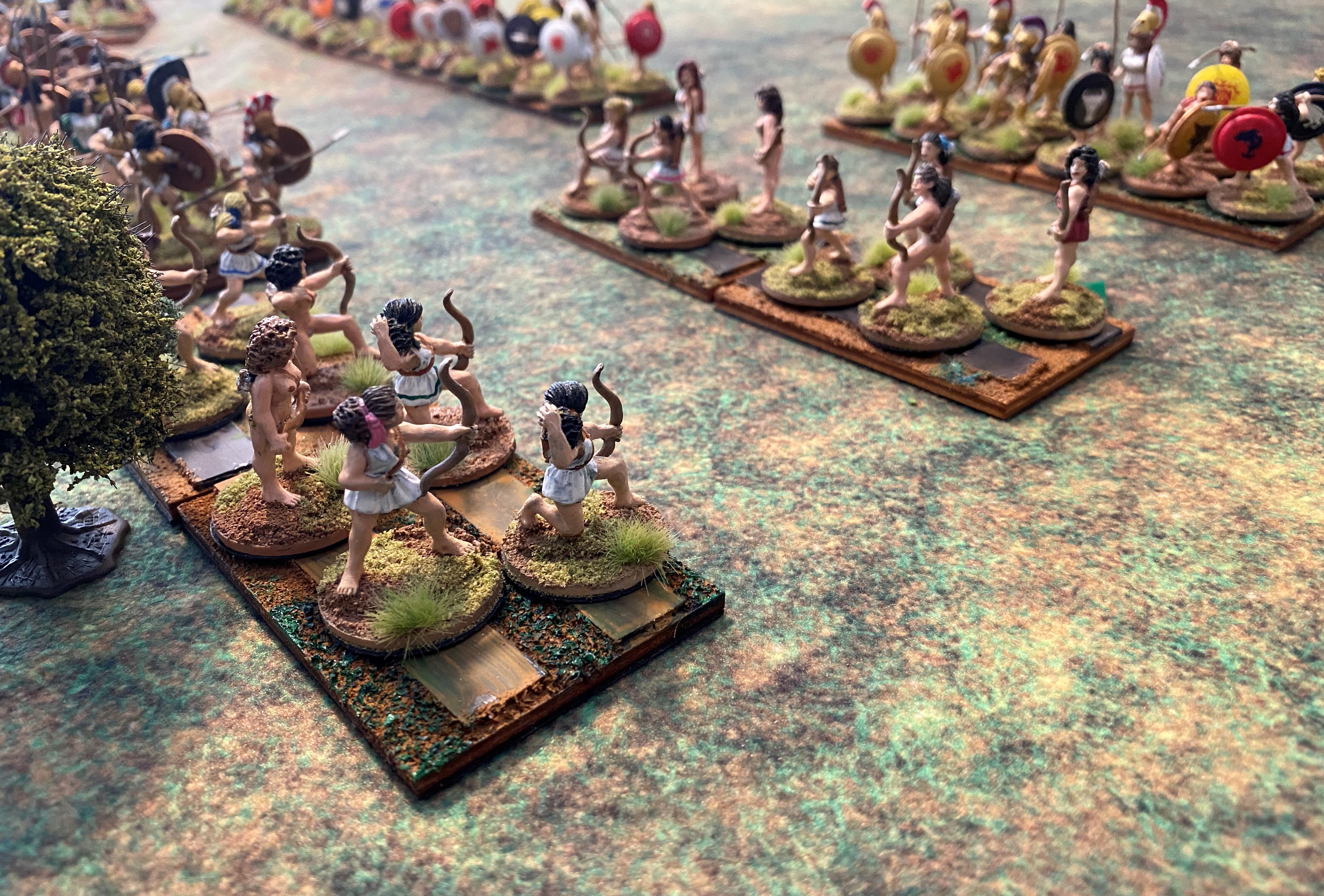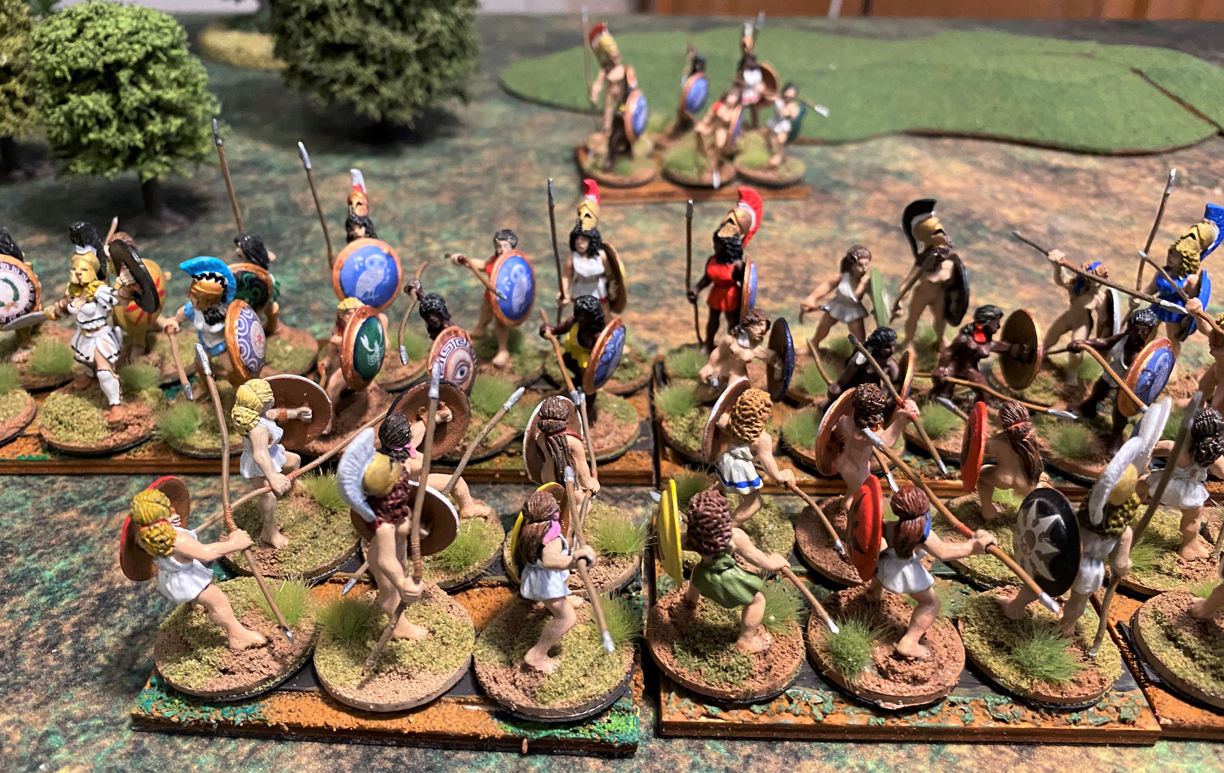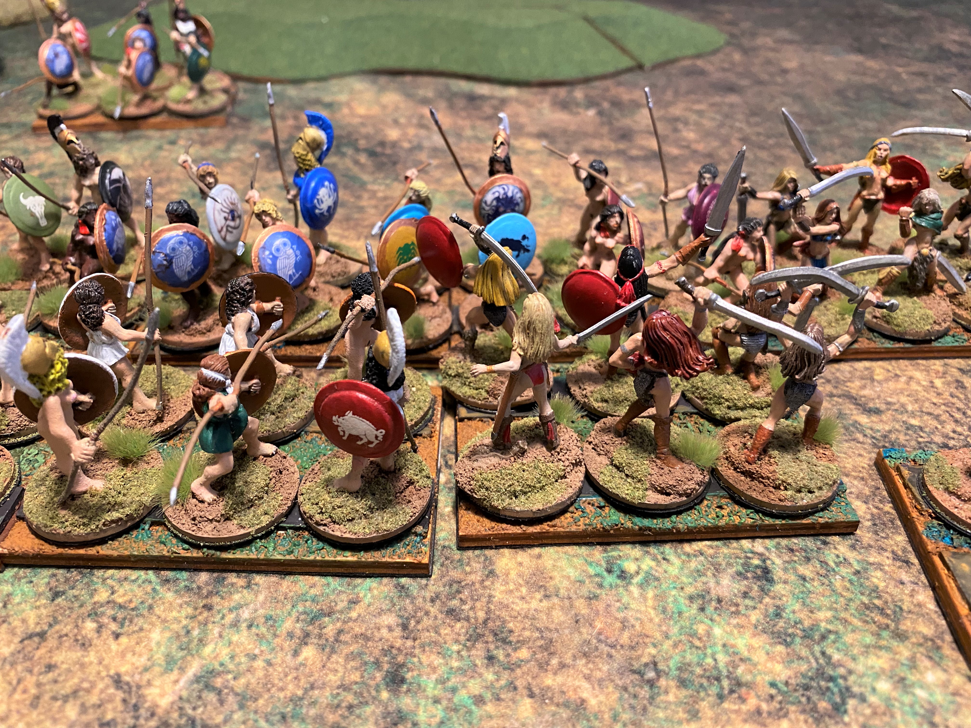 The first thing I have to address is the basing of figures. Both RRtK and WHtBK use the WRG/DBx basing conventions. Many ancients and fantasy rule sets use these conventions, it’s probably the closest thing to an industry standard. However, these base sizes are over forty years old. They were created when miniatures were actually 15mm and 25mm in size. Today’s 15mm figures are close to 18mm in size and 25mm gave way to heroic 28mm, which is closer to 32mm today. So, even from the very beginning, I used a different base size to fit my larger figures on. Also, having only three figures on a stand for a unit makes the unit look naked, and with some of the Amazons being nude, they look naked naked.