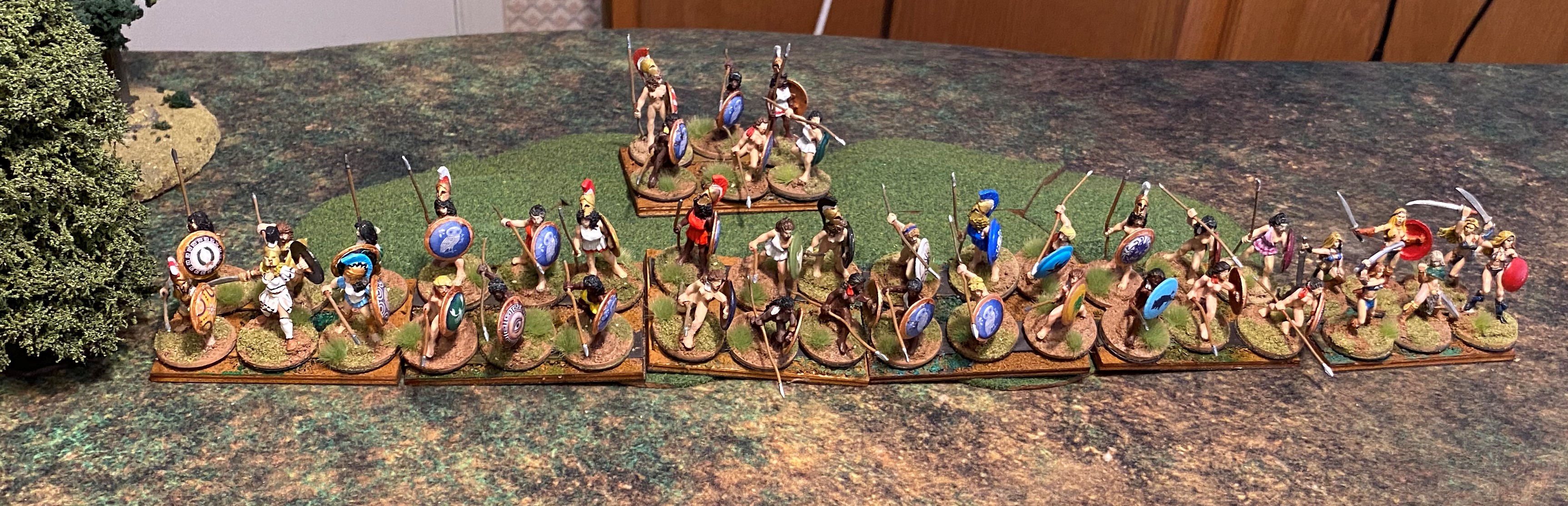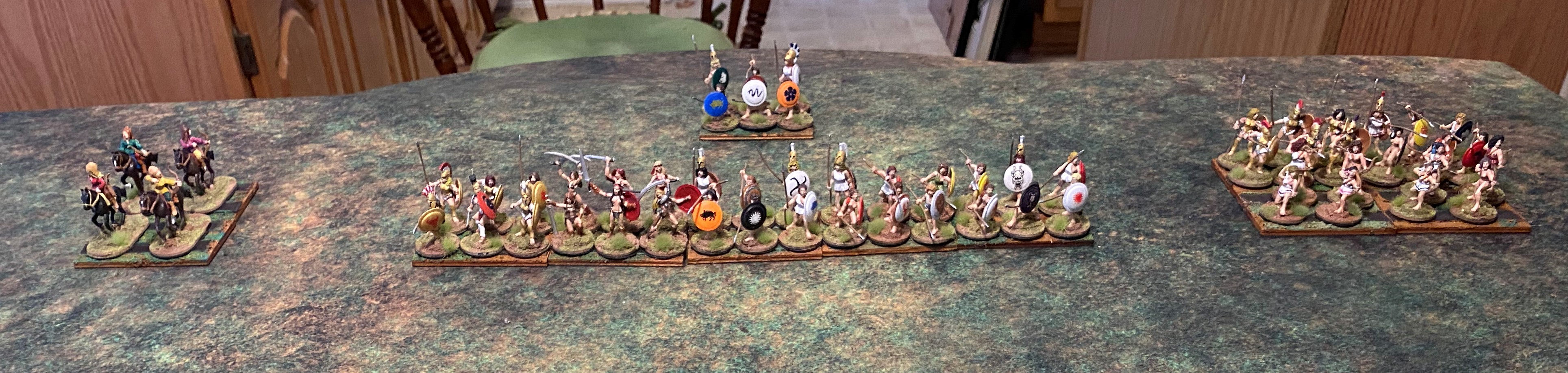 Since the Valkae Amazons are modeled on Classical Greek armies, I will place the Commander-in-Chief – the “Strategos” of ancient Greece, in the customary position of honor. In a Greek phalanx, the position of honor is in the rightmost unit. You see, the Greek phalanx was designed so that a soldier’s shield protected the person to his left, so the soldier would get as close as possible to the person on his right to get as much protection as possible. As a result, the phalanx tended to drift to the right as it moved forward. In hoplite warfare, being able to make contact with the enemy in front of you was important, drift too far to the right and many of your soldiers wouldn’t be able to contact the enemy and worse, the enemy would be able to wrap around your flank. So, the strongest leaders were placed on the far right of the line to keep the line from drifting.