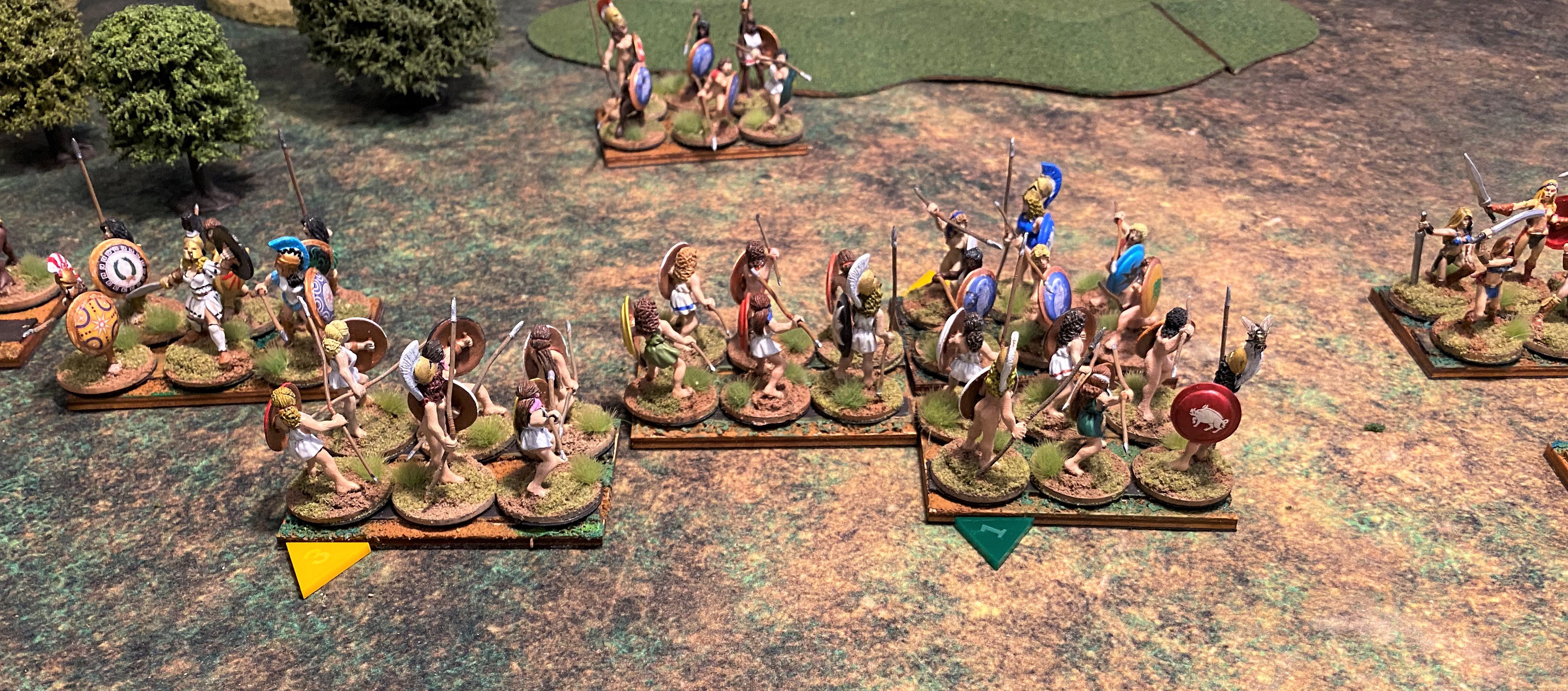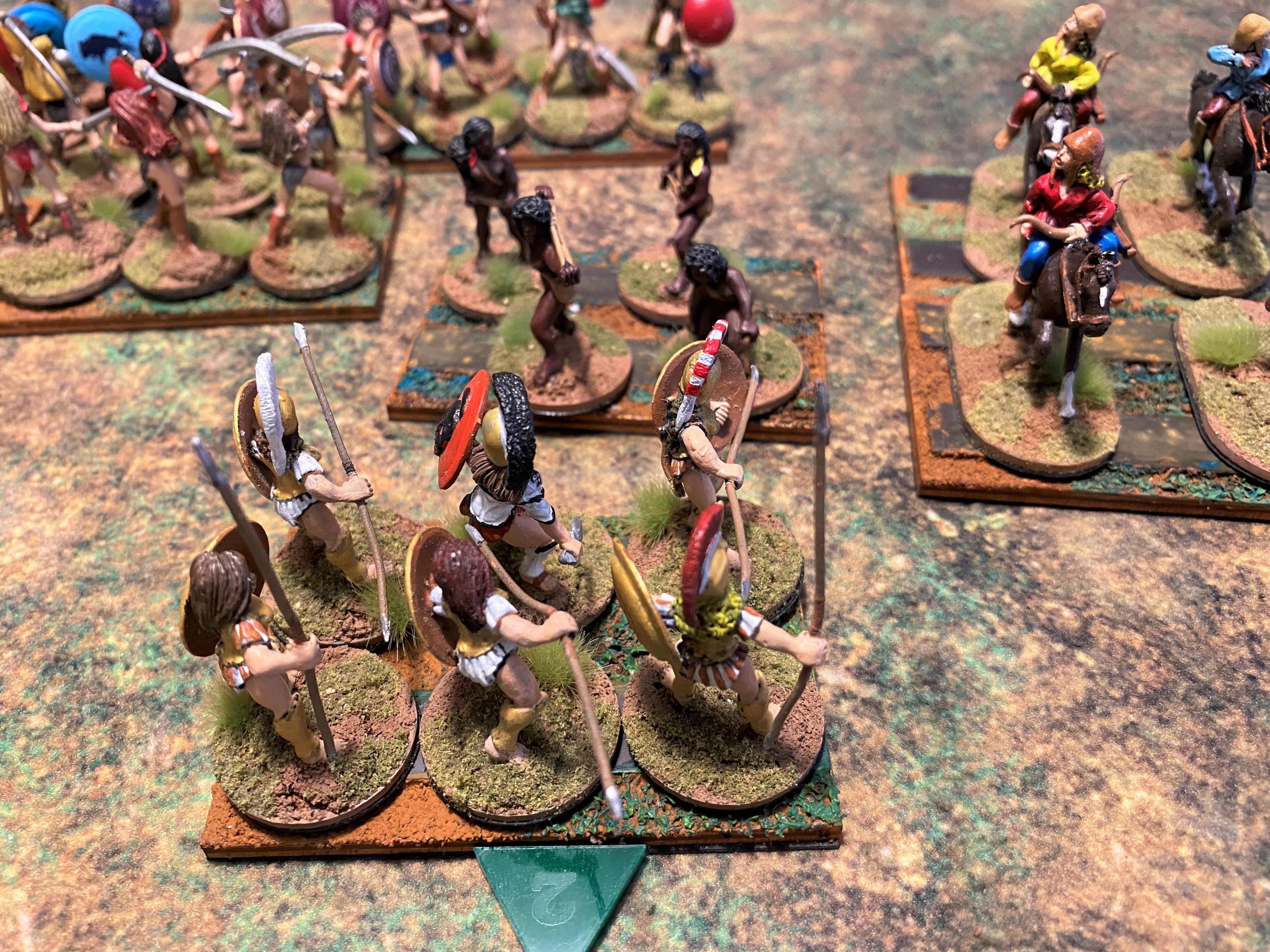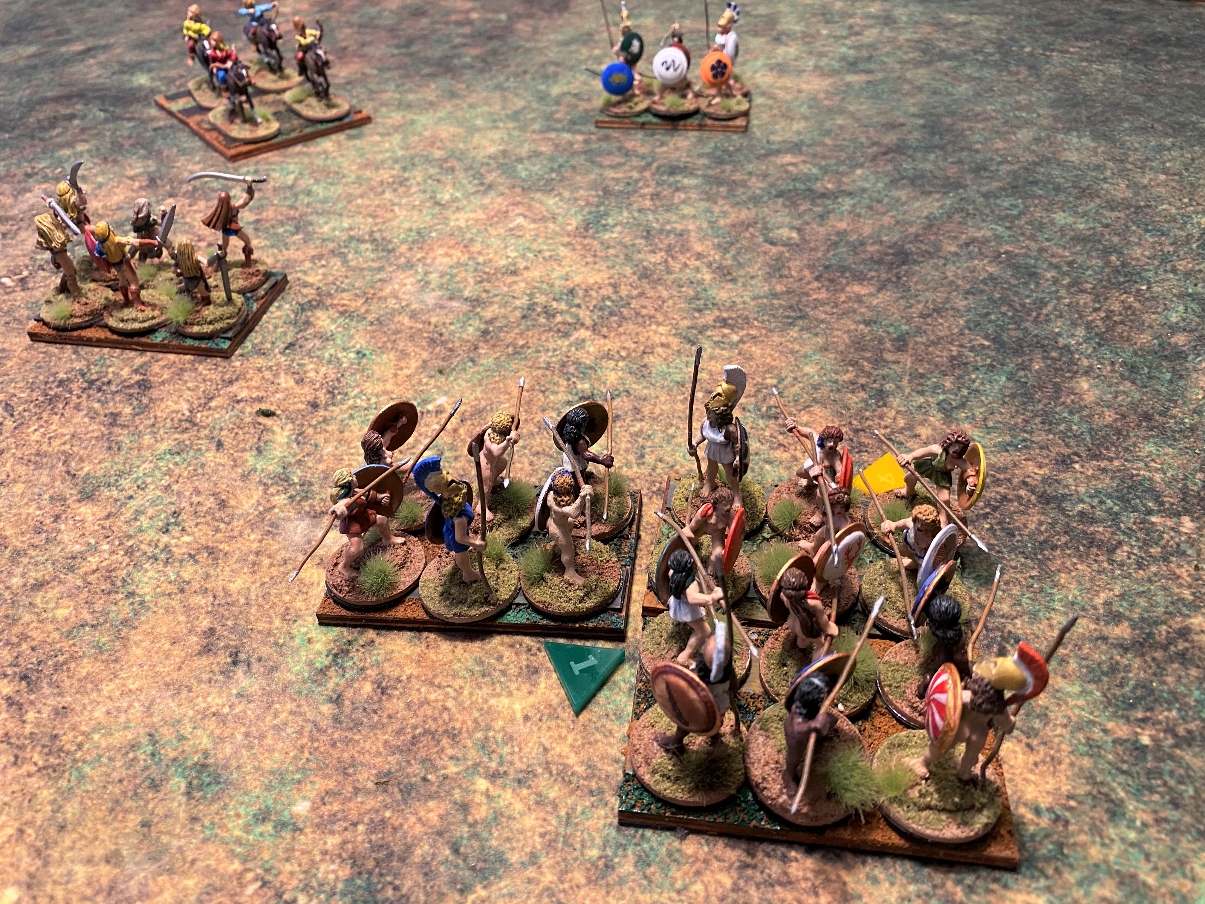 The “belos” is the missile fire of a hoplite battle. As the hoplites advance, the skirmishers are doing their best to disrupt the advance with arrows, sling shot, and javelins. It began in turn one, I drew first blood, but the Nycenaean army appeared unfazed. My Robot Wife frowns when she discovers she doesn’t have enough movement to charge, but then smiles when she realizes that I also lack the movement to charge.