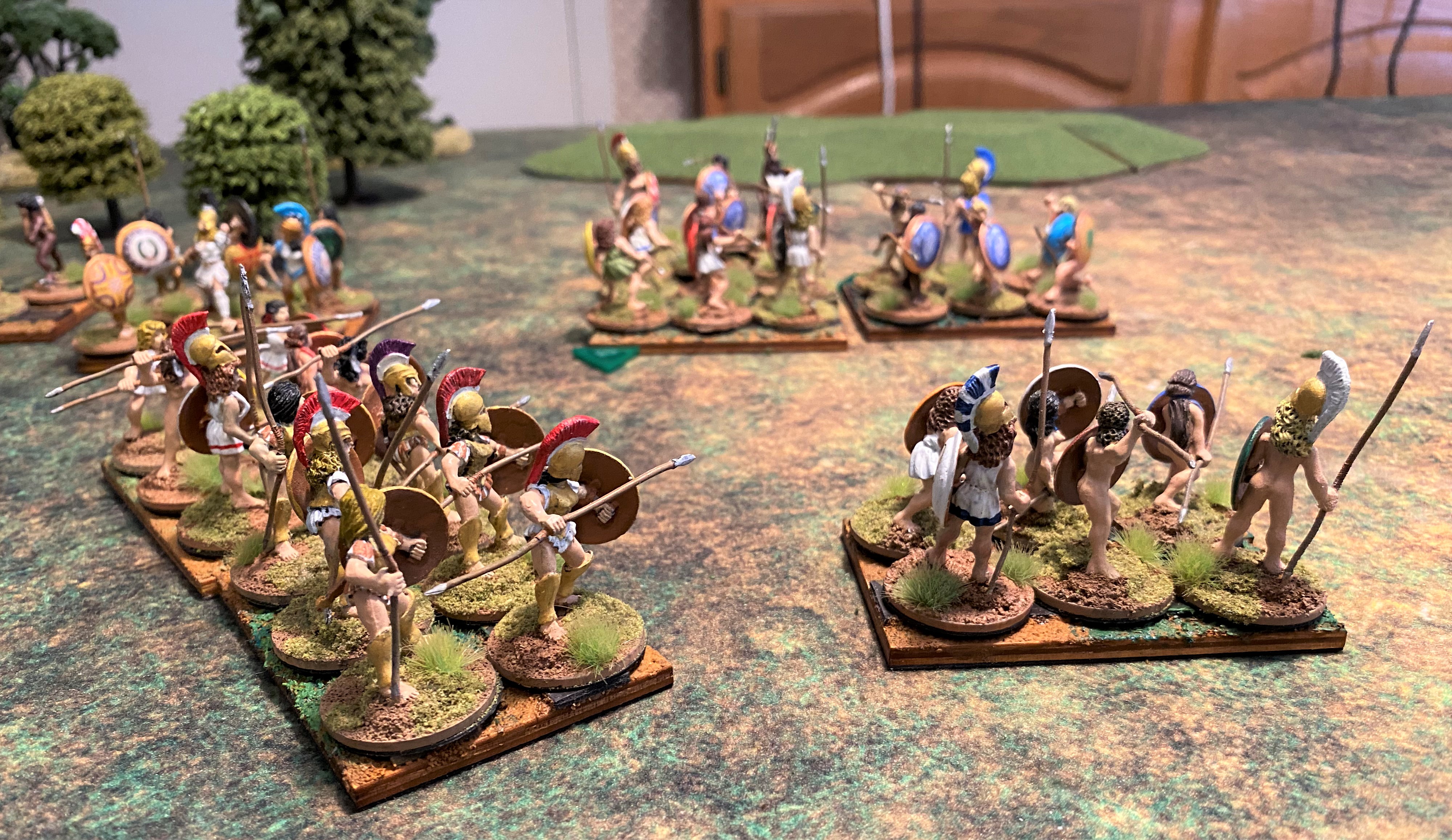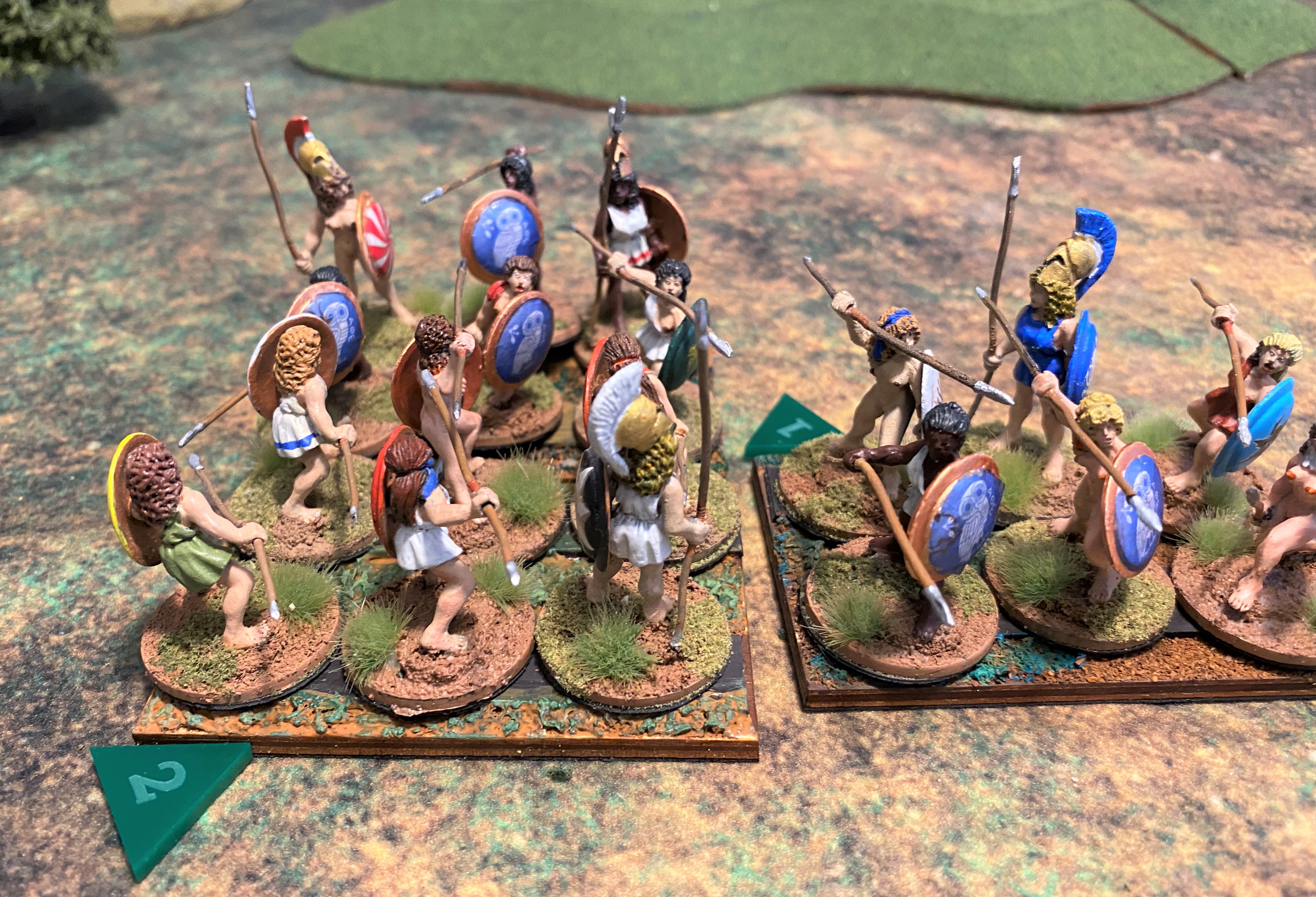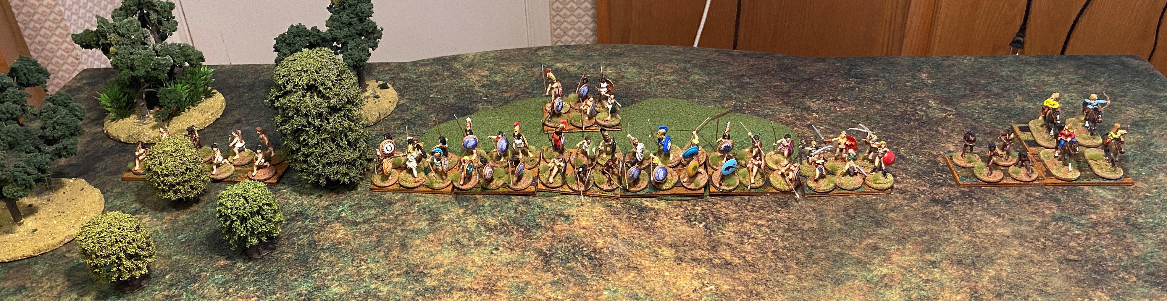 The “belos” is the missile fire of a hoplite battle. As the hoplites advance, the skirmishers are doing their best to disrupt the advance with arrows, sling shot, and javelins. It began in turn one, I drew first blood, but the Nycenaean army appeared unfazed. My Robot Wife frowns when she discovers she doesn’t have enough movement to charge, but then smiles when she realizes that I also lack the movement to charge.