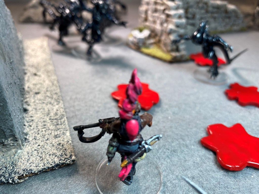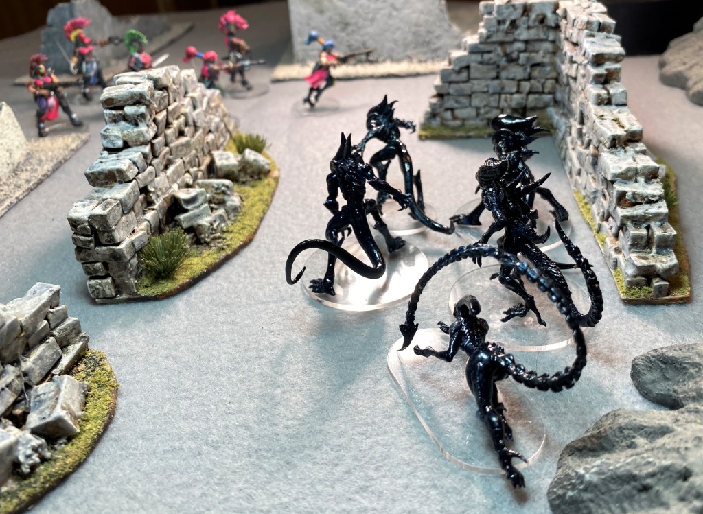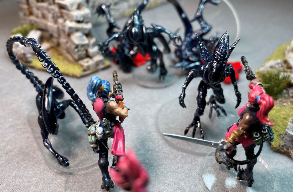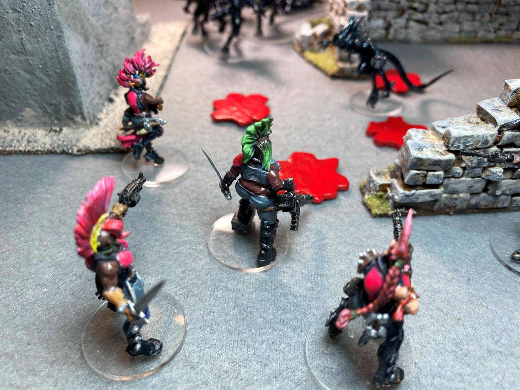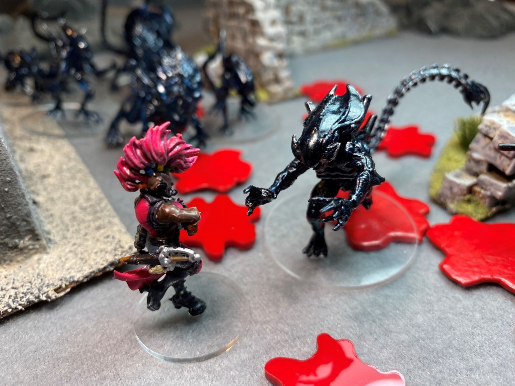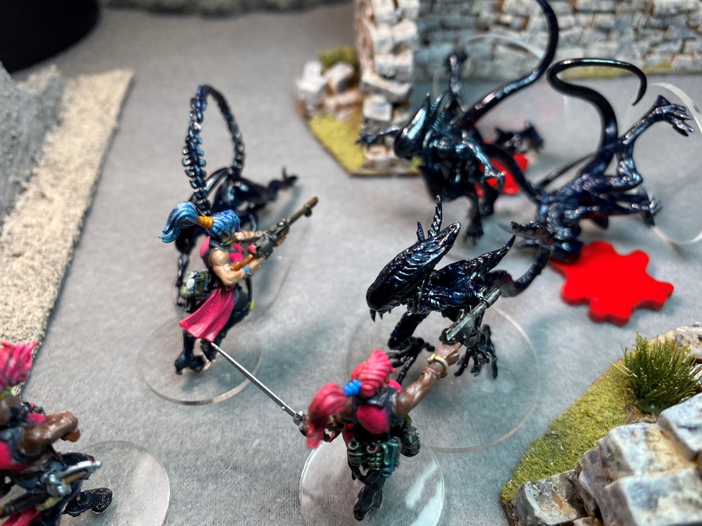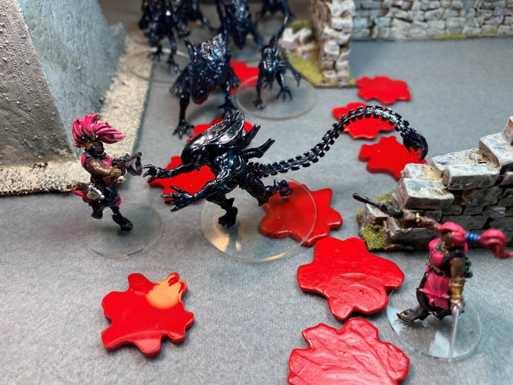 There’s no need to roll for Will to Fight. With half the squad gone and more than twice the number of Xenomorphs in the remaining group, the Pixies leave the table.