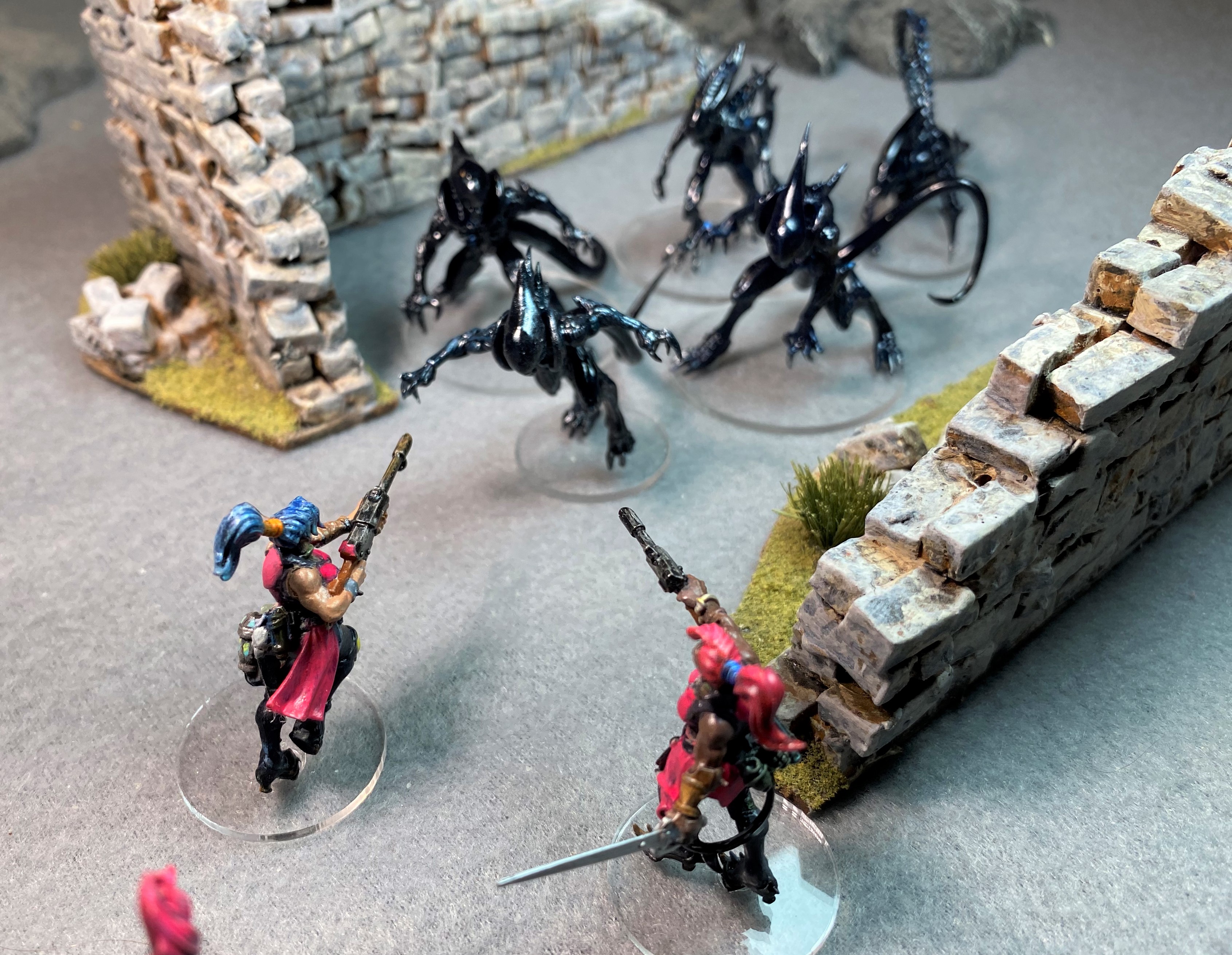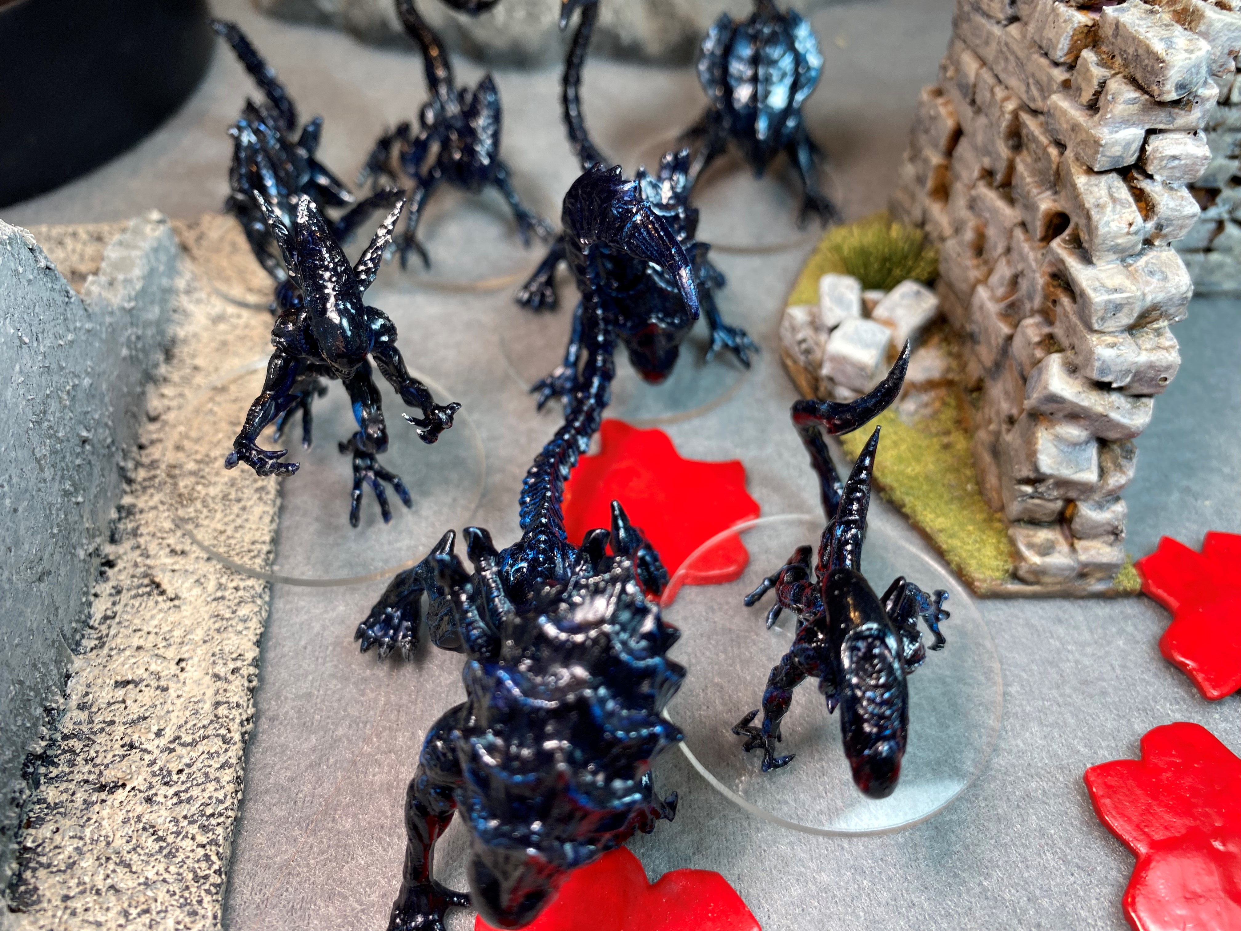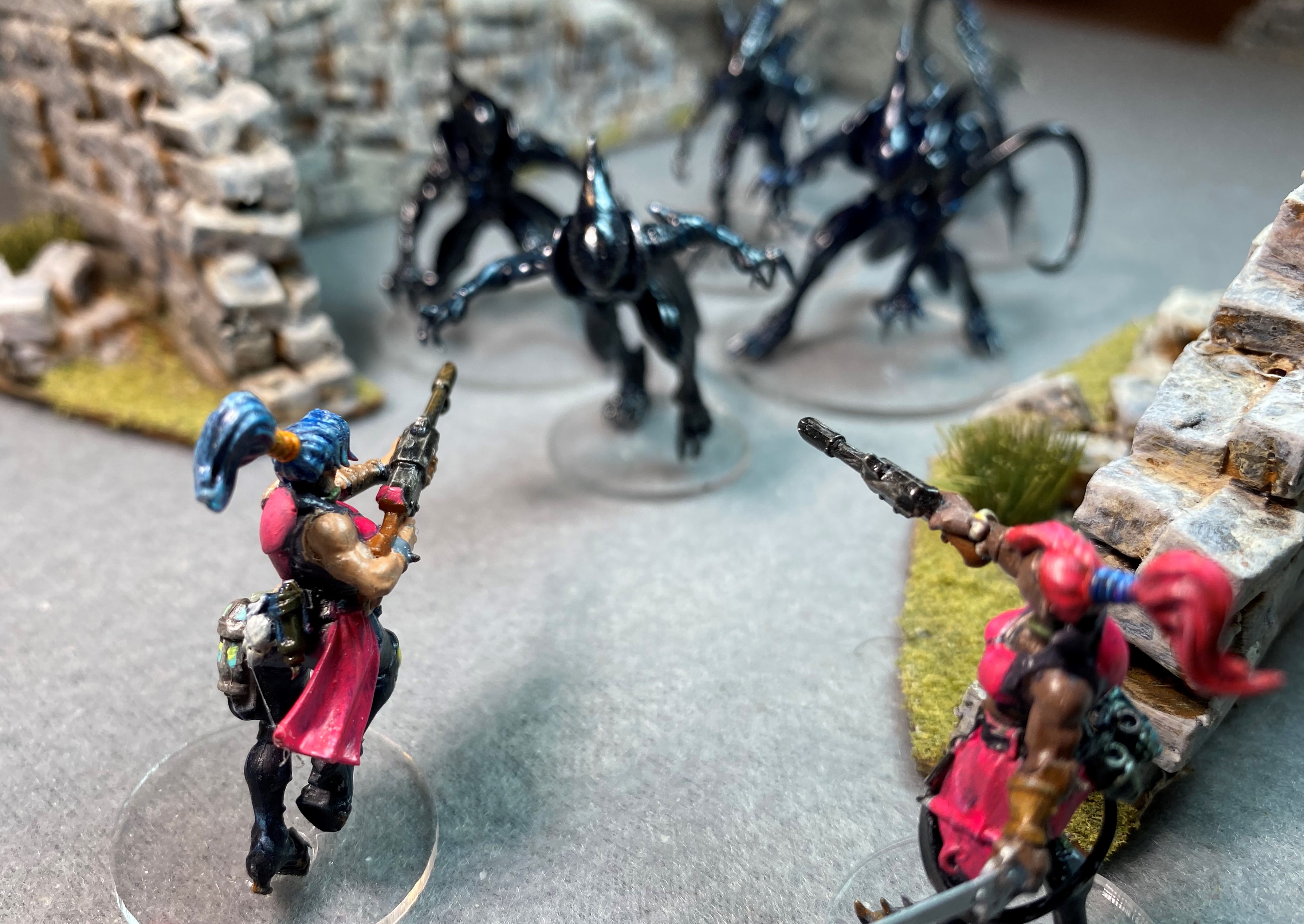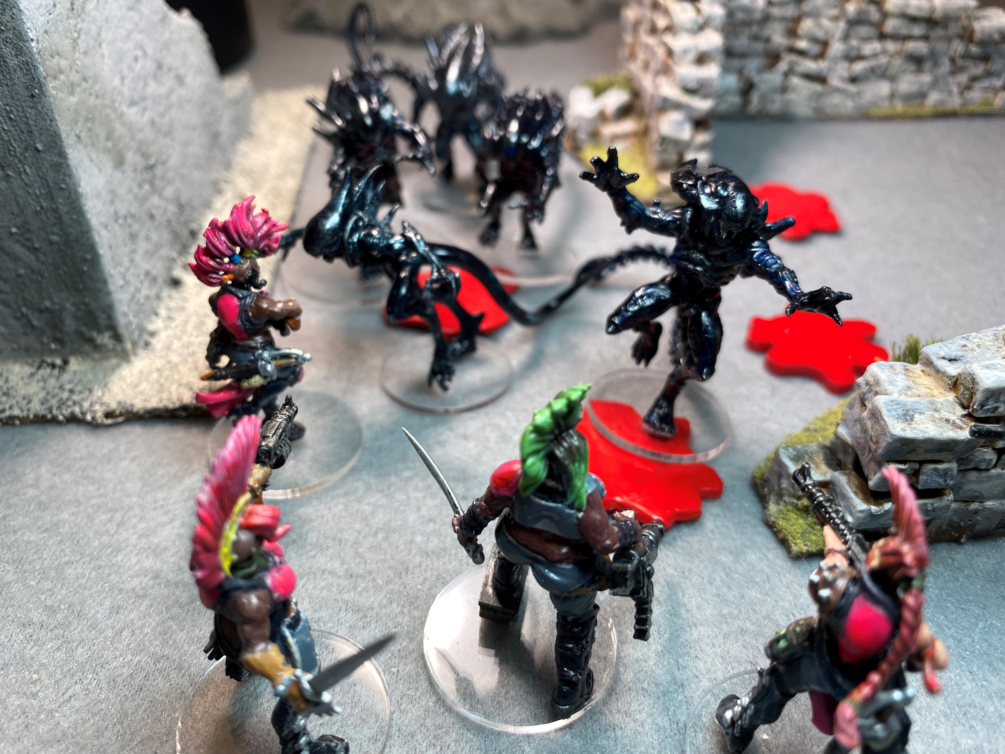 The Xenomorphs charge. Mystic Rhaine fires all three shots at the remaining Stalker from group C. The Stalker died releasing a spray of acid. Robonatrix fired the LMG one Warrior became obviously dead. Neon Siyeon fired next sending one Xeno OOF. Bam Bam Bambini fired, but her pistol shots had no effect.