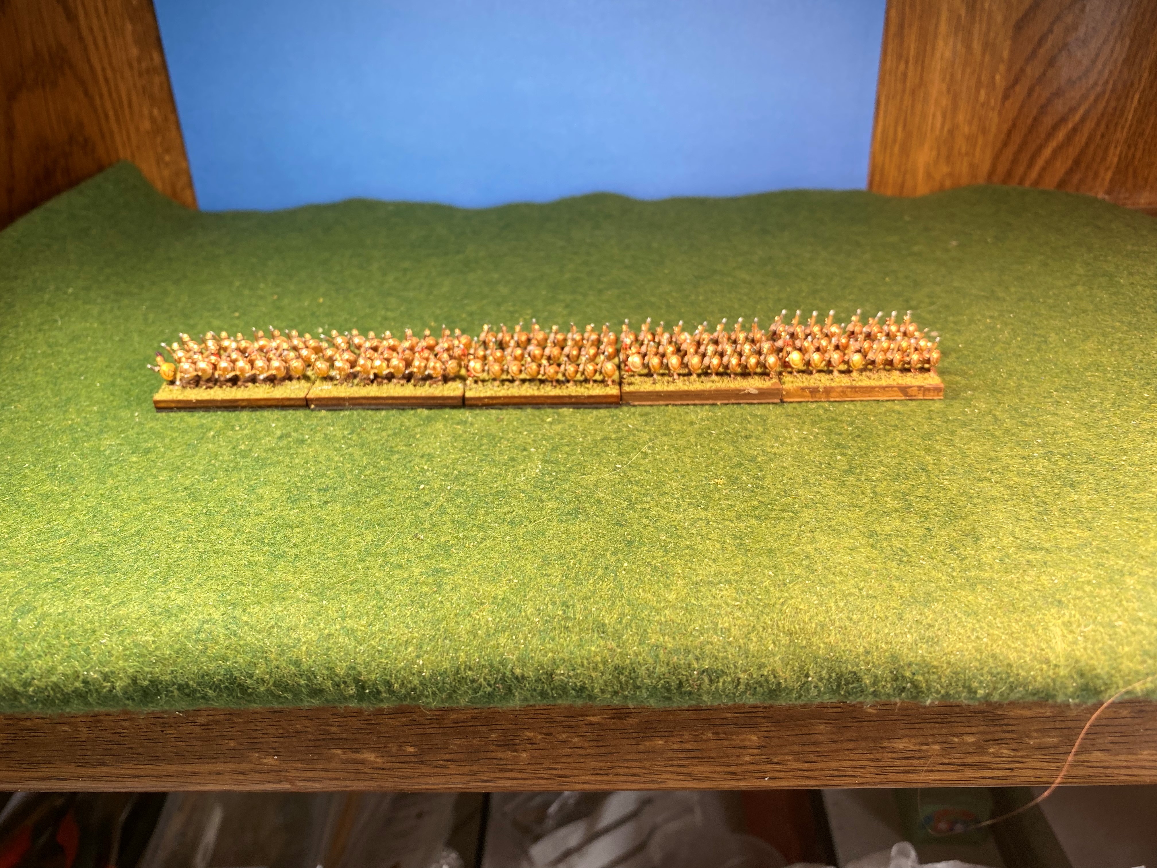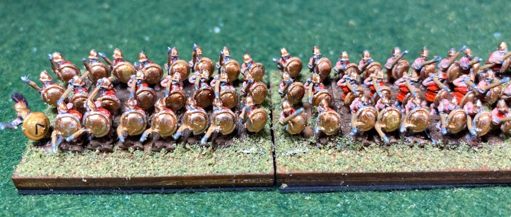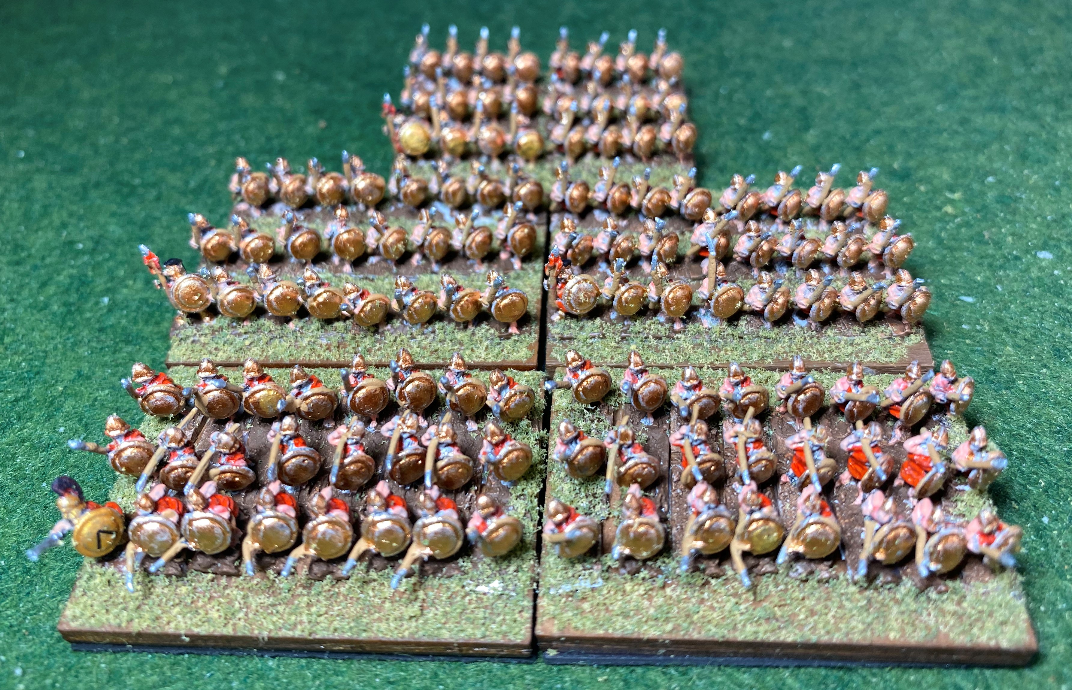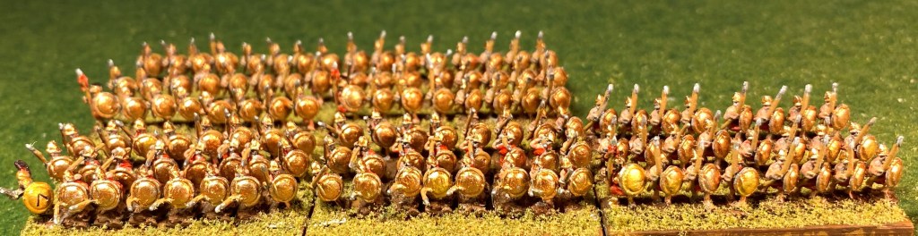 After languishing a couple of years in the paint queue, lead pile, or pile of shame, I’ve finished some 6mm Spartans. It’s 120 figures in 5 units of 24 figures each. The figures are from Baccus Miniatures.