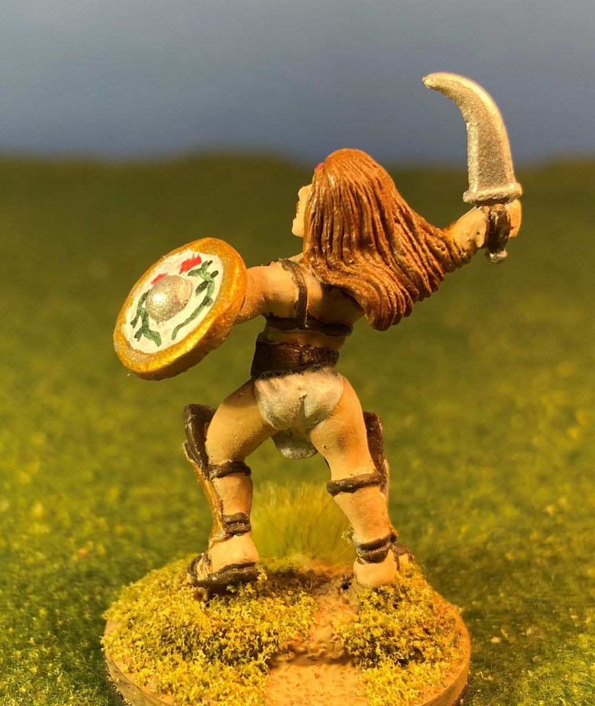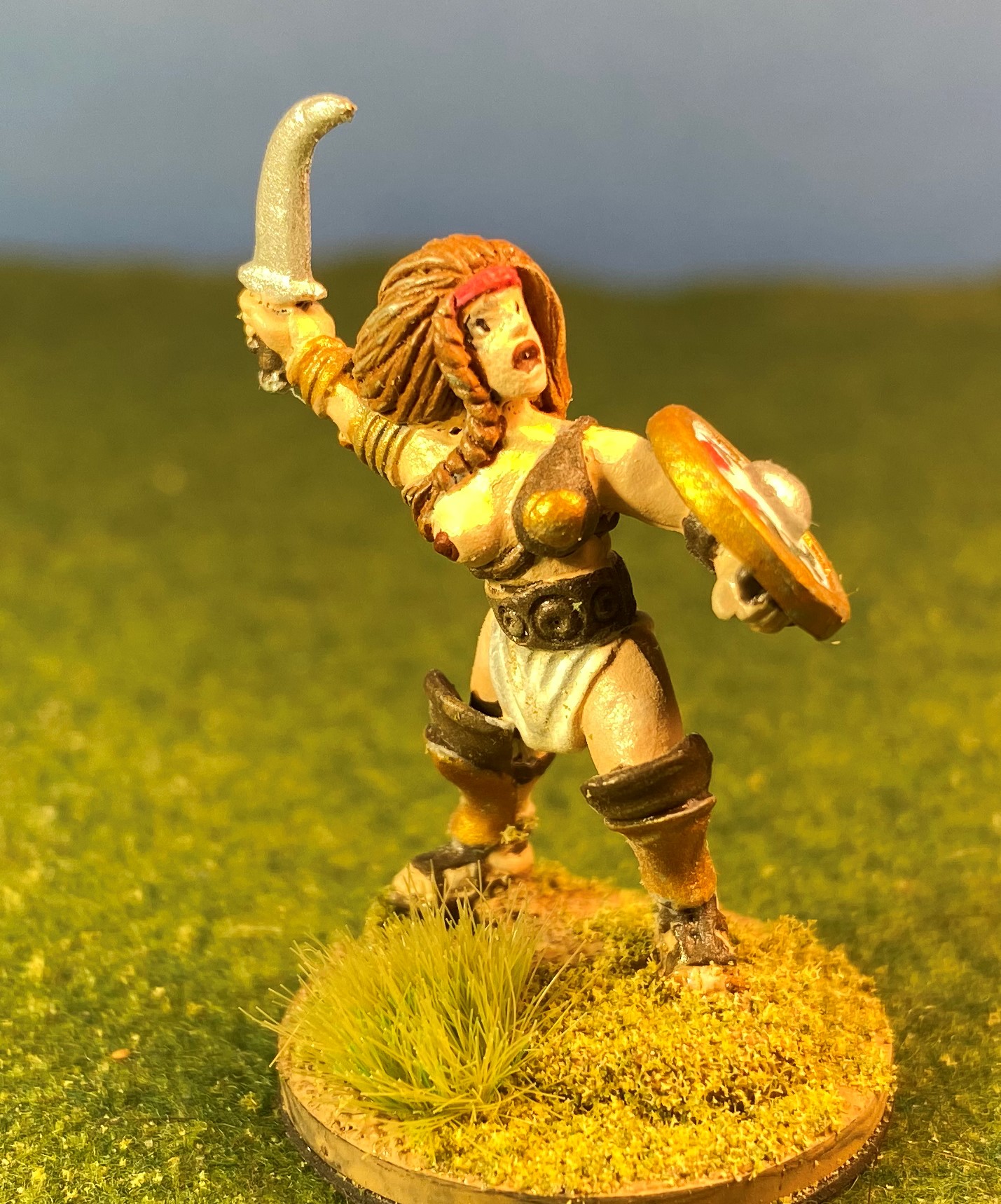 The actual “Amazon” or female warriors faced by the Greeks were from the many Eurasian tribes living around the Black Sea. They were not only clothed, but also wore pants. However, Greek artists like modern artists discovered that sex sells. Why buy a plain vase when you can buy one with a naked warrior woman on it? This particular sorceress is from the Reaper Miniatures Savage Beauty boxed set where the inspiration for the figures is from Keith Parkinson and Larry Elmore paintings.
