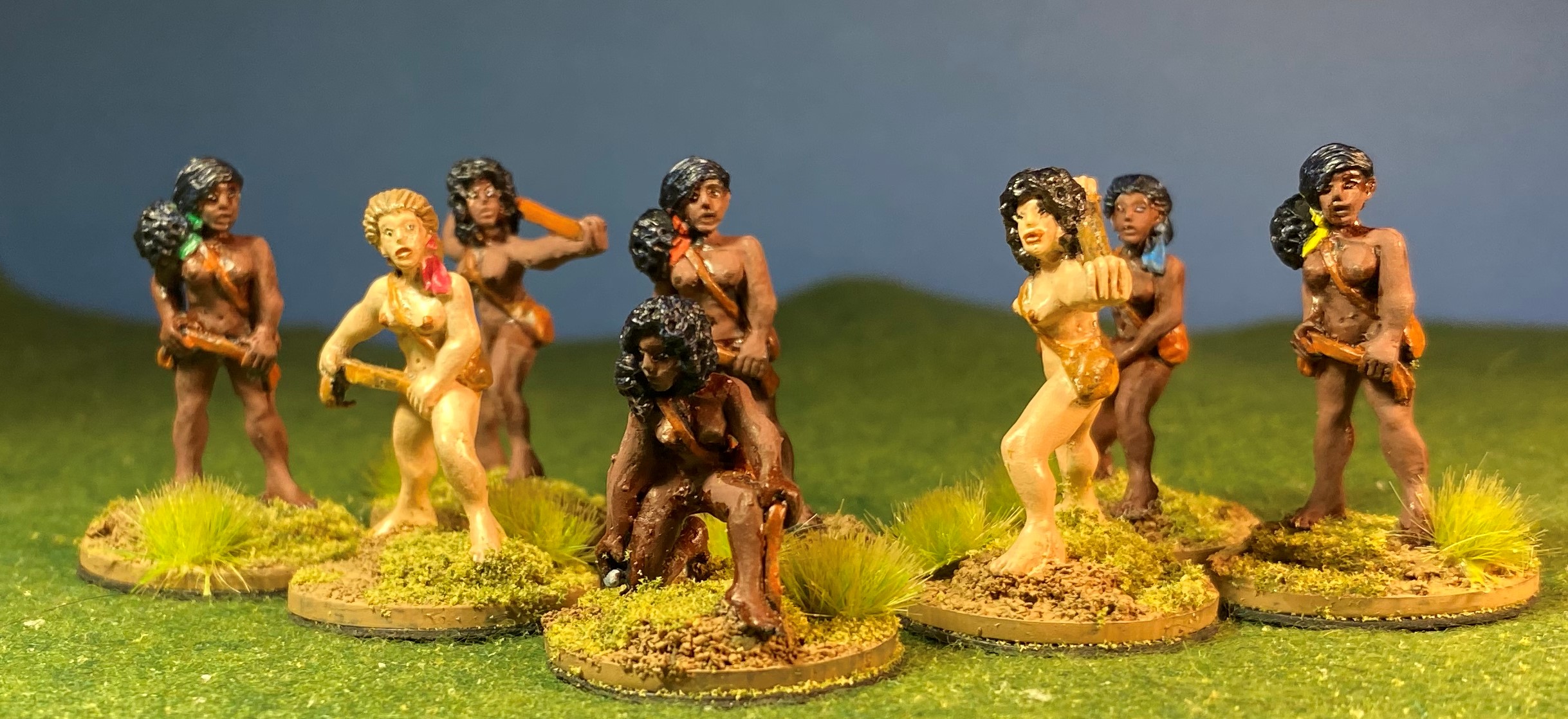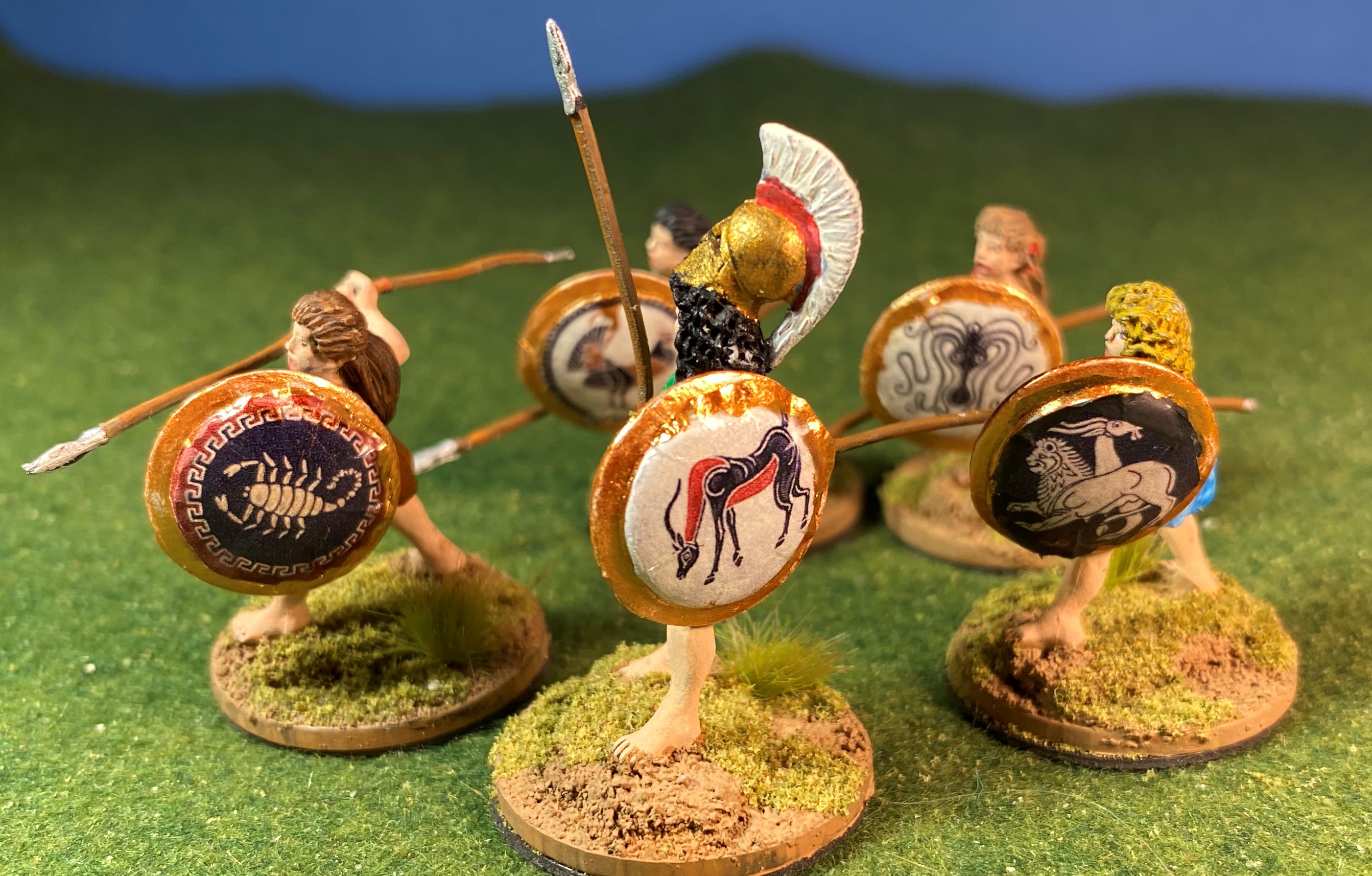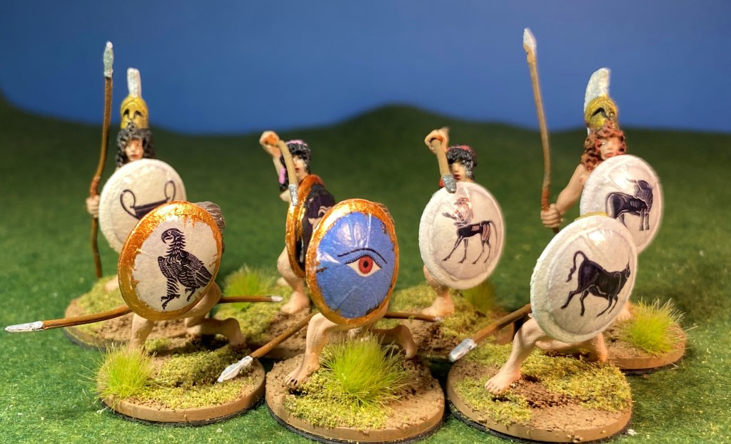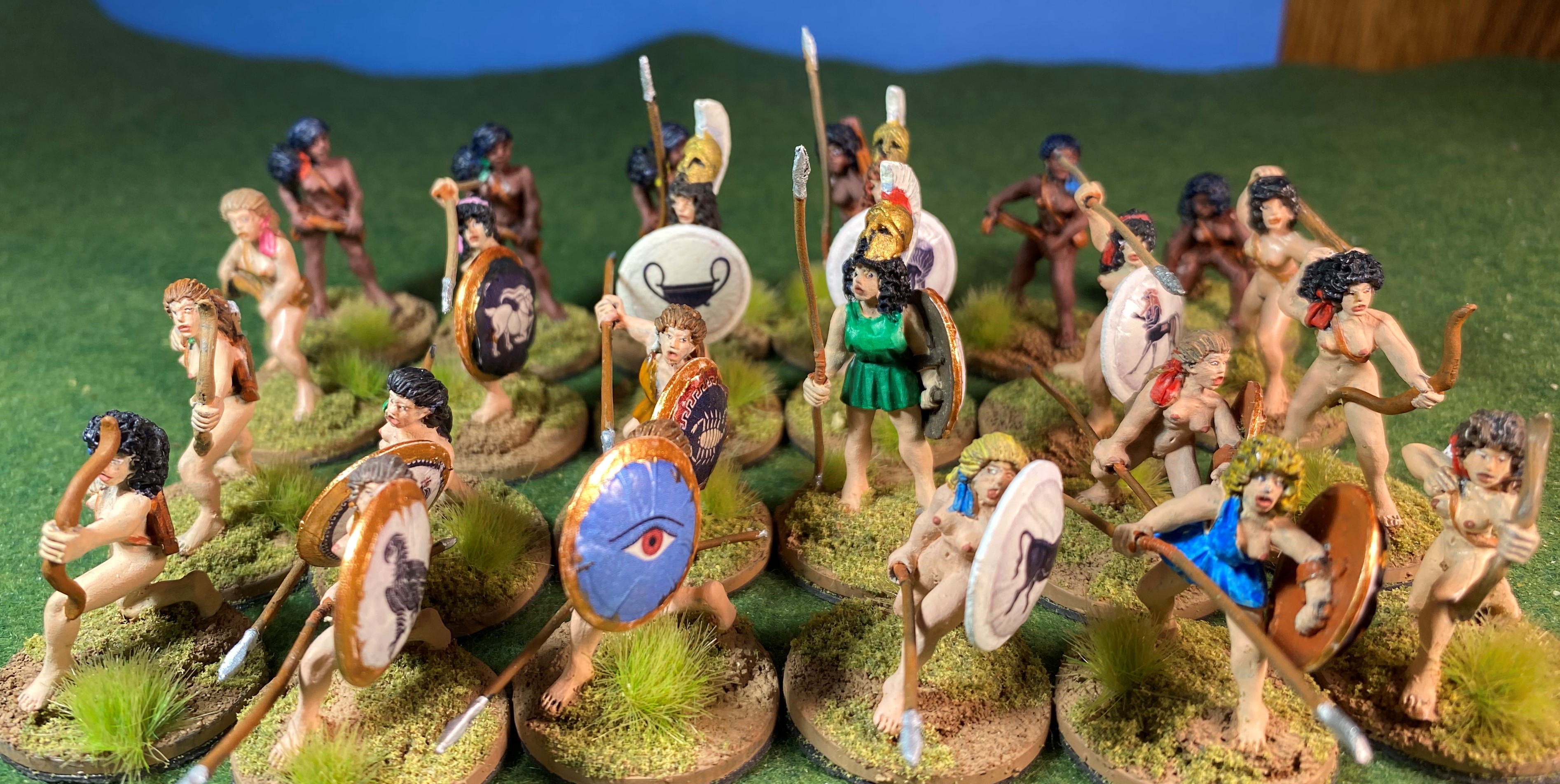 This batch of twenty-four came from the “lead pile” and are freshly painted, whereas the last batch were finished Amazons merely rebased. All of these figures are from Eureka and the shield decals are from Victrix.