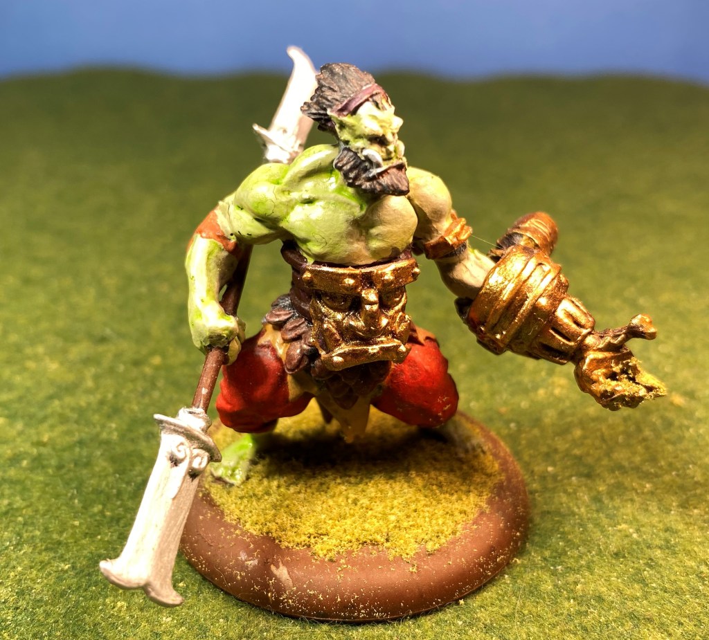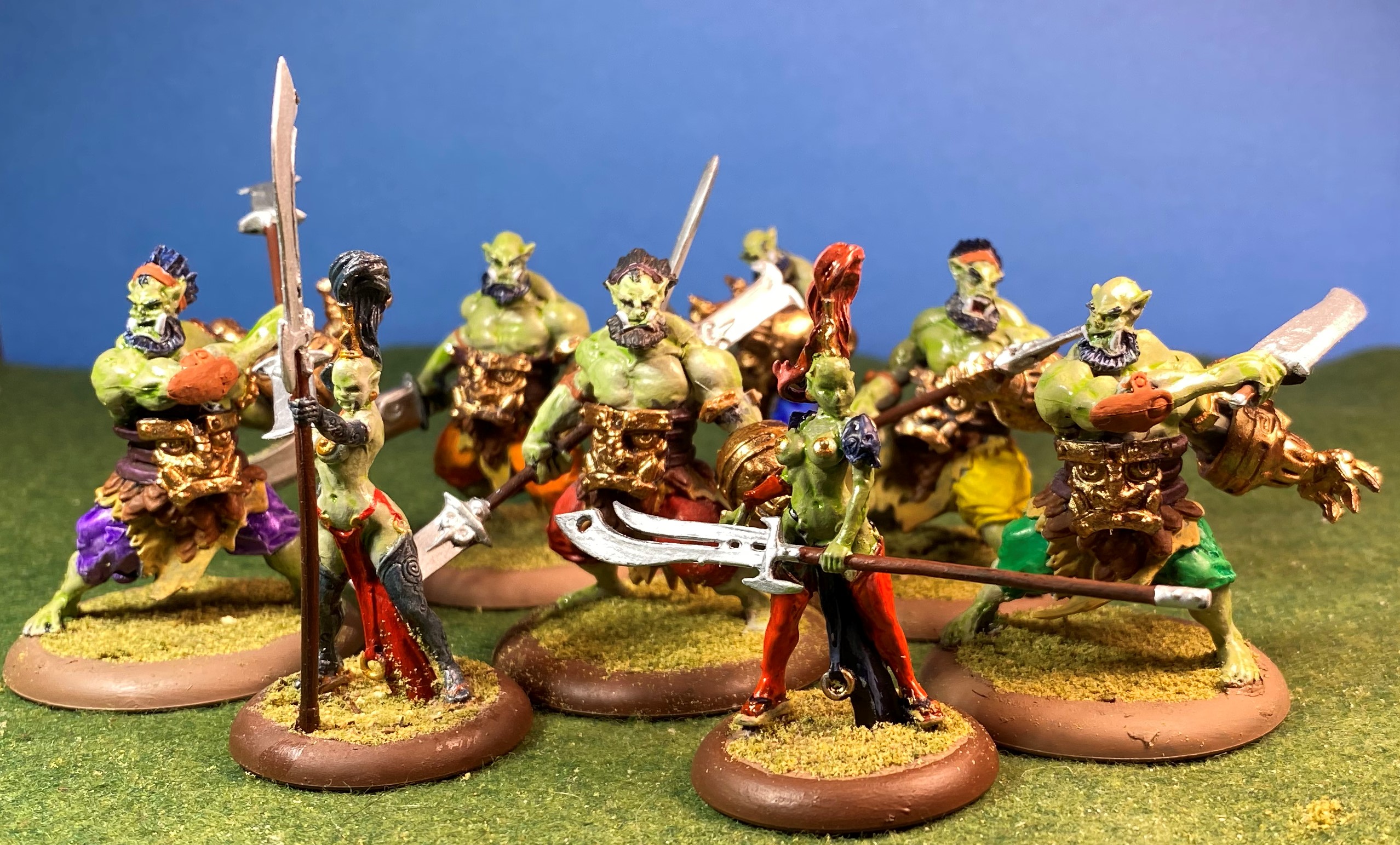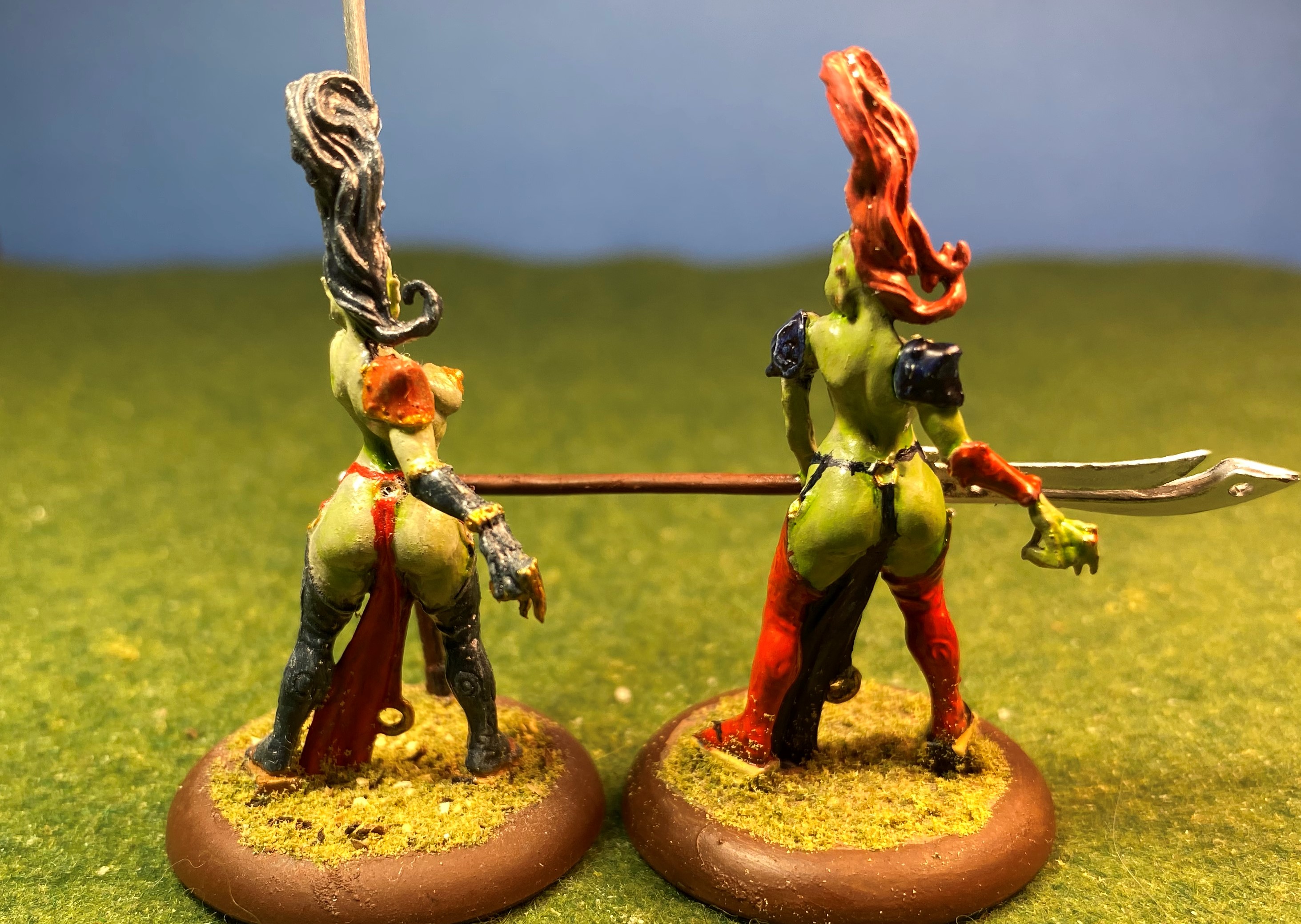 I painted them as Orcs, and they are slightly larger than average Orcs, they are what was called in Warhammer Fantasy, “Big Uns.” I also decided to call them the Wrath Brothers, a band of Orc mercenaries with bronze power fists powered by magic. The magically imbued power fists count as a melee weapon in WHAT and Talomir Tales. The Big Sisters are Orc sorceresses who recharge the power fists with spells as well as dealing damage in battle.