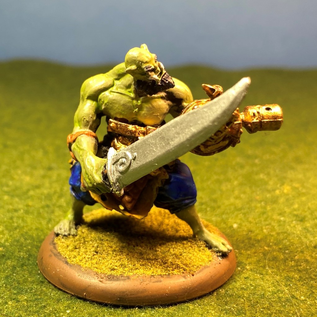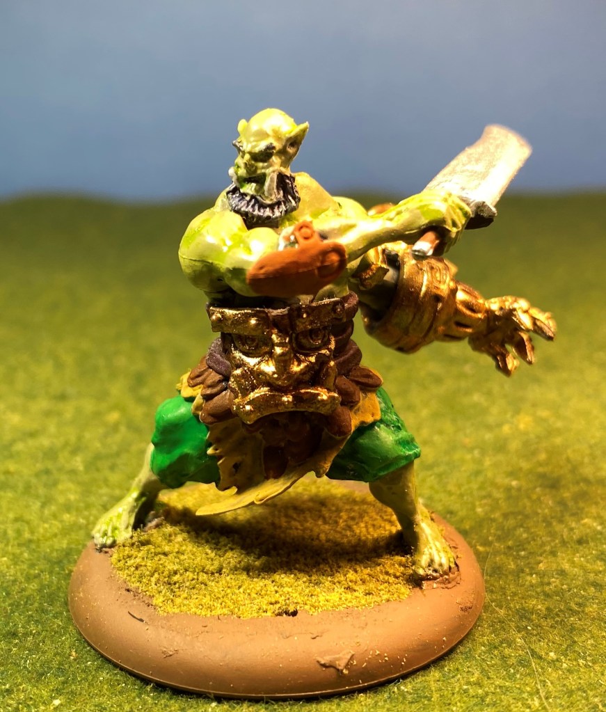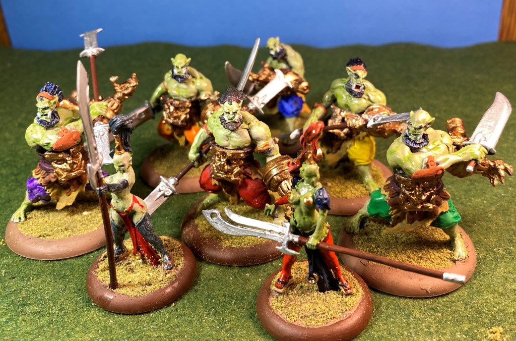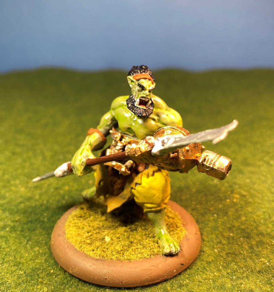 I painted them as Orcs, and they are slightly larger than average Orcs, they are what was called in Warhammer Fantasy, “Big Uns.” I also decided to call them the Wrath Brothers, a band of Orc mercenaries with bronze power fists powered by magic. The magically imbued power fists count as a melee weapon in WHAT and Talomir Tales. The Big Sisters are Orc sorceresses who recharge the power fists with spells as well as dealing damage in battle.