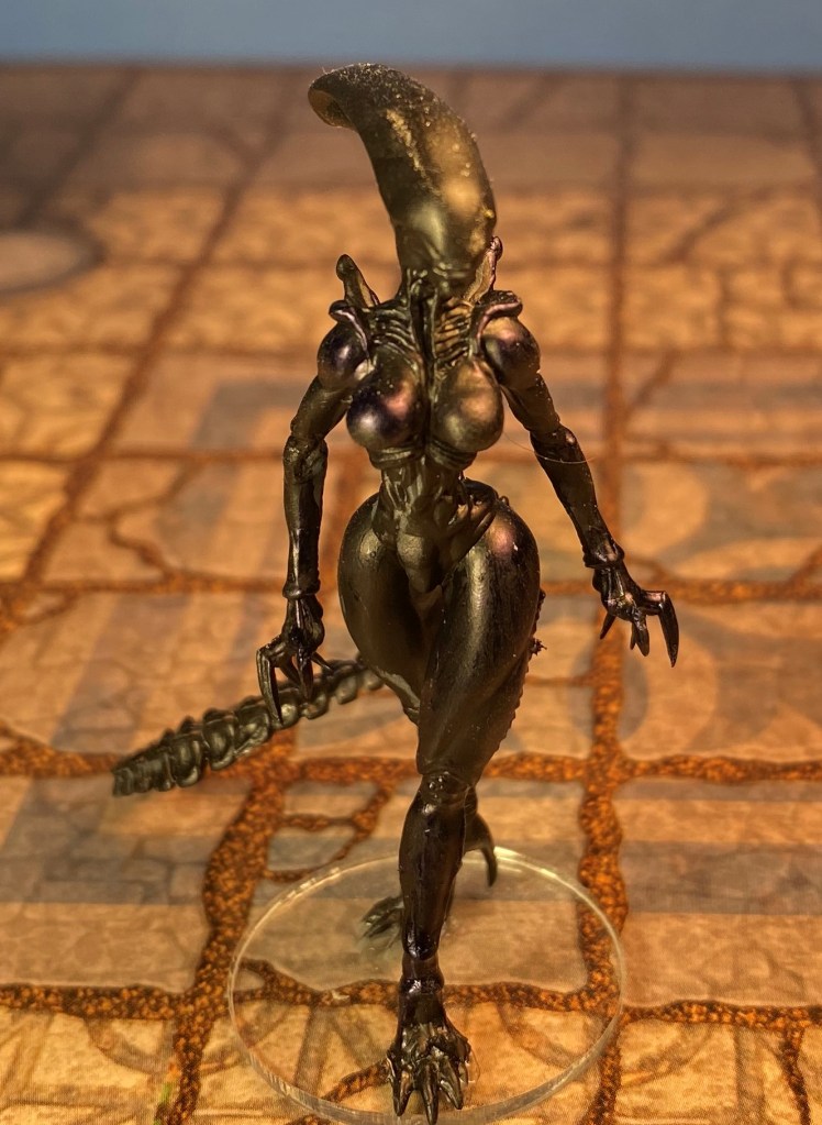 Her integral stiletto heels are reminiscent of Angelina Jolie’s version of Grendel’s Mother in the 2007 film Beowulf. After some thought, I don’t think she’d make a good Grendel’s Mother to go with my Vikings, though. Too science fiction-ish.
