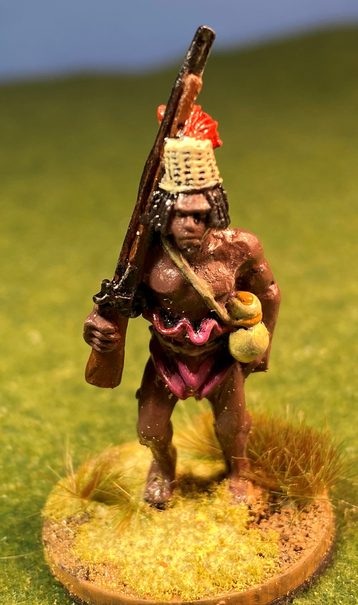 In between writing sessions for NaNoWriMo, I’ve been painting miniatures for a small commission and figures for my Zandeland project. Here’s a photo of my first finished Azande warrior: