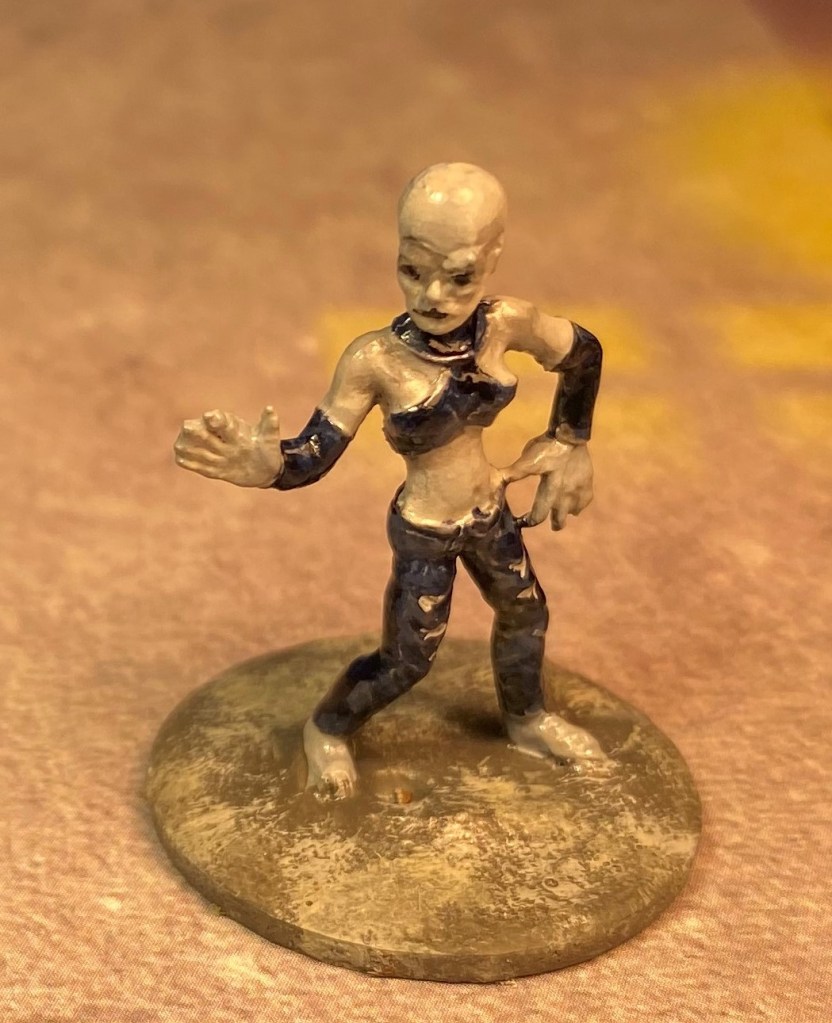 The figure is both easy and difficult to paint. She’s gray wearing dark gray clothing. For the clothing, I chose to use Payne’s Grey, a gray that is almost black with a slightly blue tint. Her gray skin was given a highlight of gray mixed with Reaper’s Maiden Flesh, a very light Caucasian skin tone.