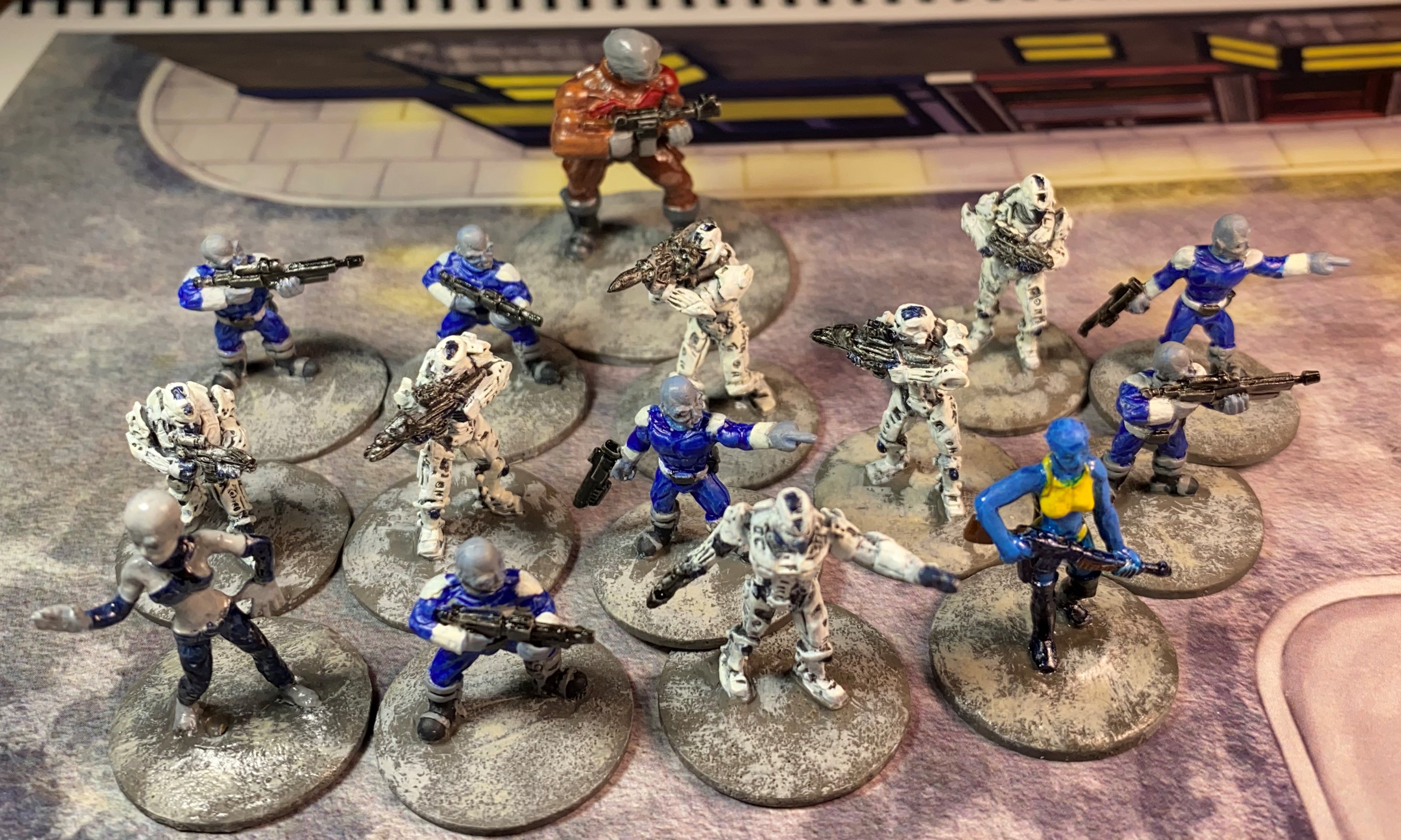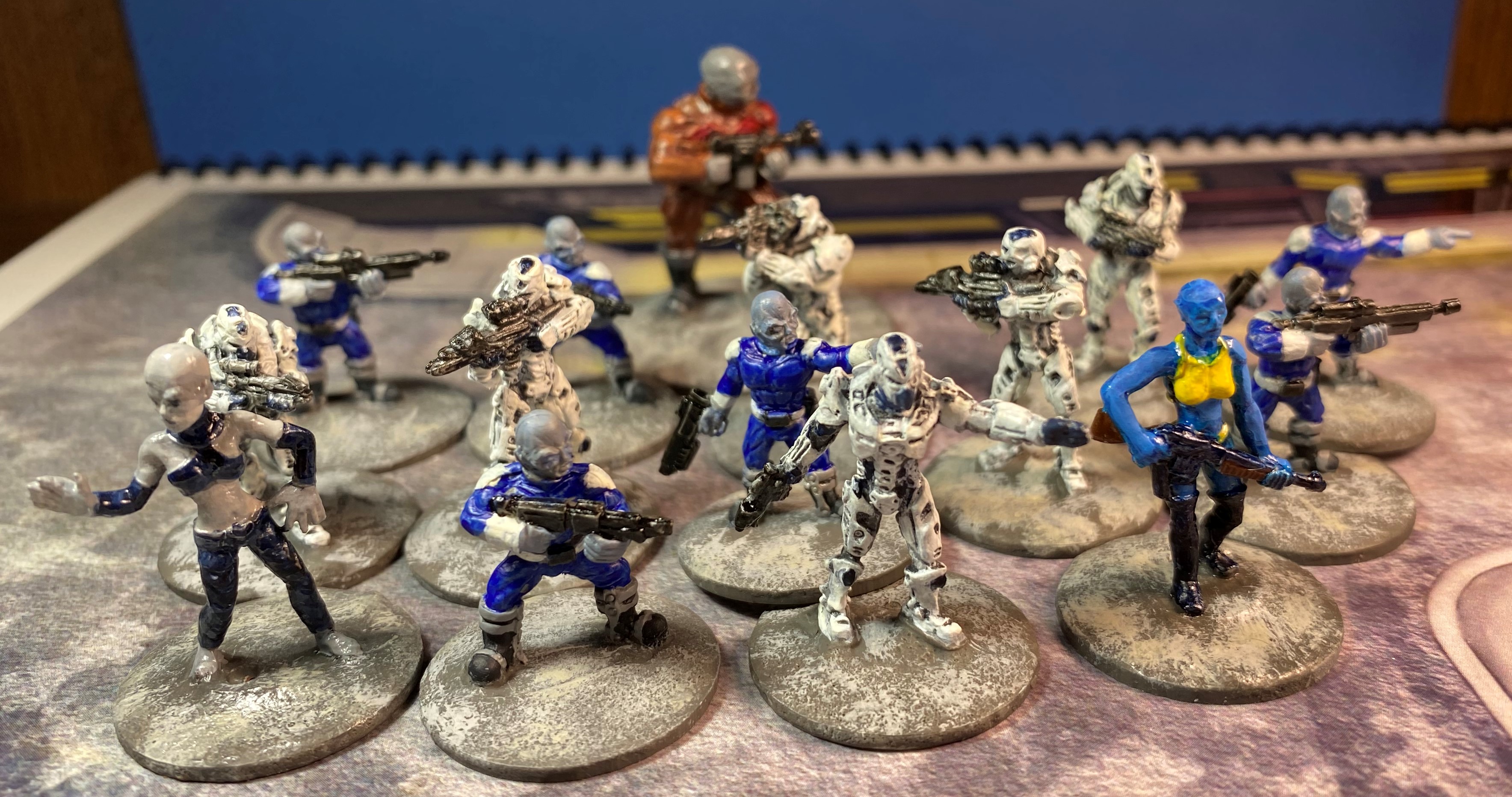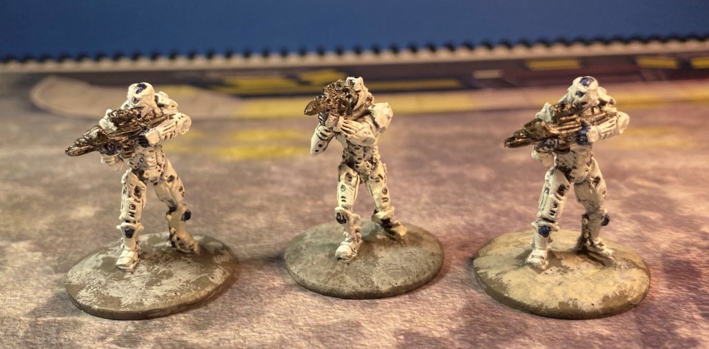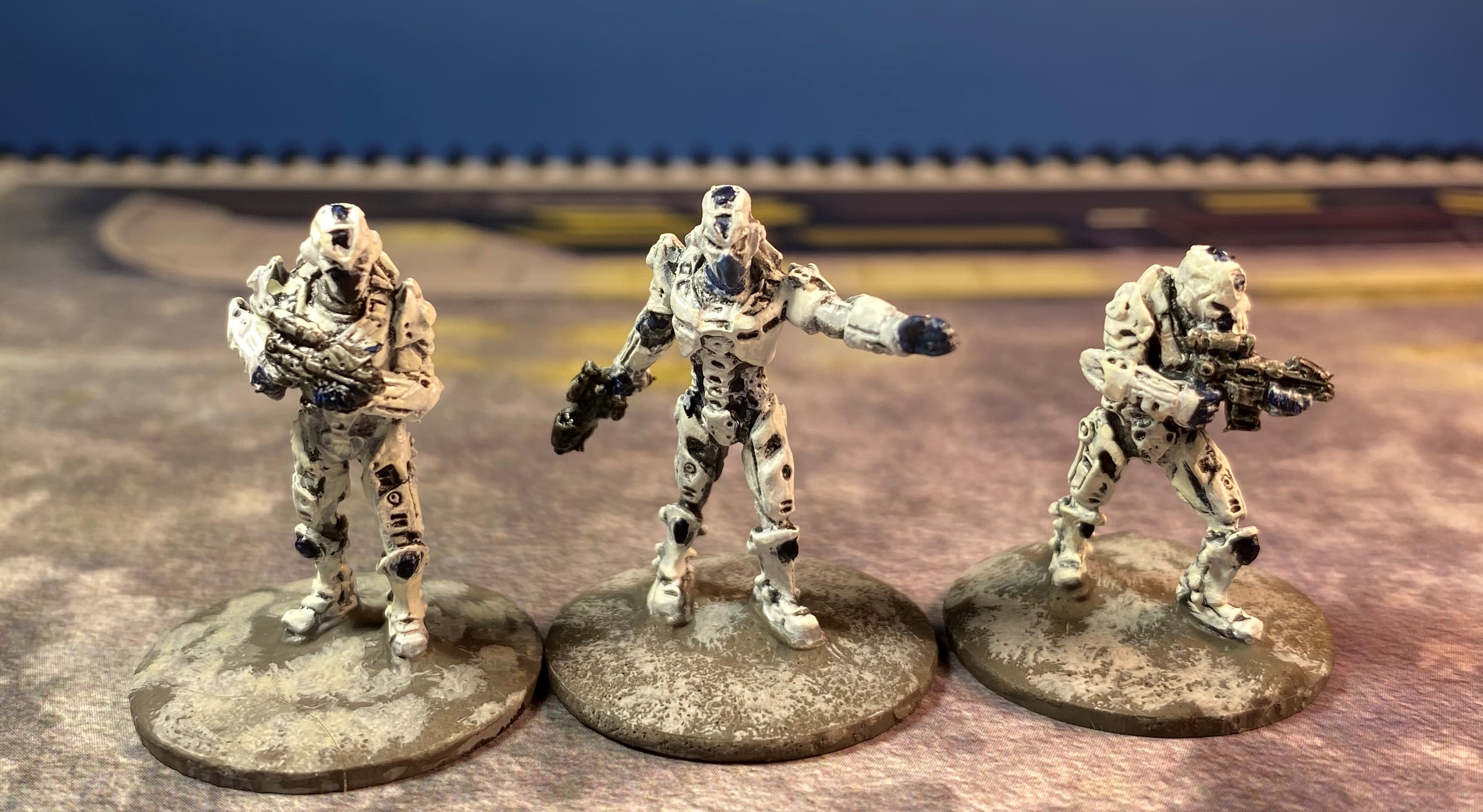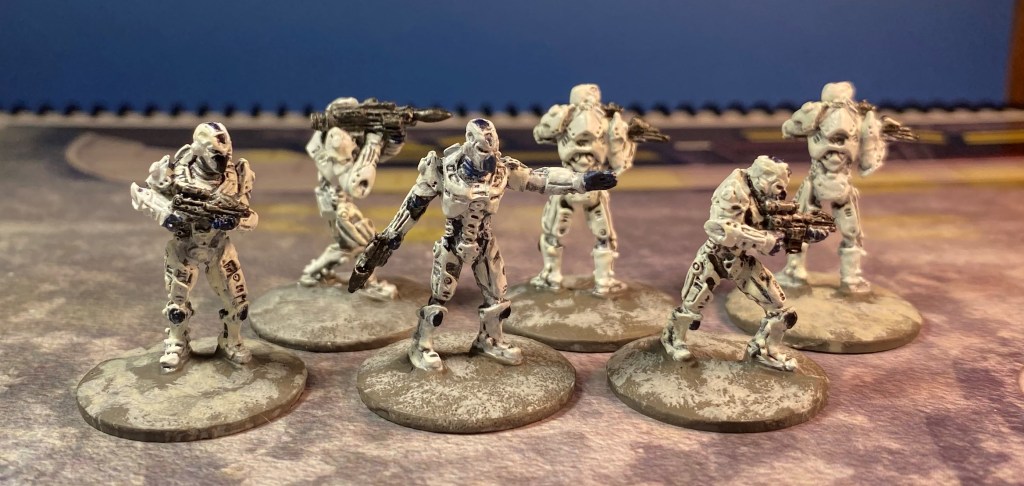 I finished painting a small commission with a squad of Star Army figures from the 5150 series of Two Hour Wargames. In typical fashion, I saved the hardest to paint for last. “Wait, what?” I hear you; they are white with black accents. Even though where I live, white is the predominant color of nearly everything, white can be tricky to paint. I mean, it’s sometimes hard to make the color white look right on a miniature. Don’t get me started on black, which is also another tricky color to paint.