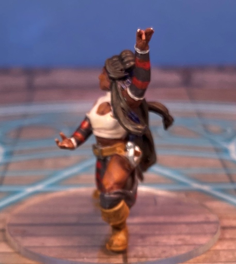 I do understand folk who play games using only the “theater of the mind” and counters as these are rewarding in playing a game. But we are living in a renaissance of game miniatures. I continue to be impressed by the variety and quality of many of the new sculpts. For my miniature of Taji Mbutzi, I wanted a dynamic pose like the central figure on the cover of Paizo’s Lost Omens the Mwangi Expanse for Pathfinder.