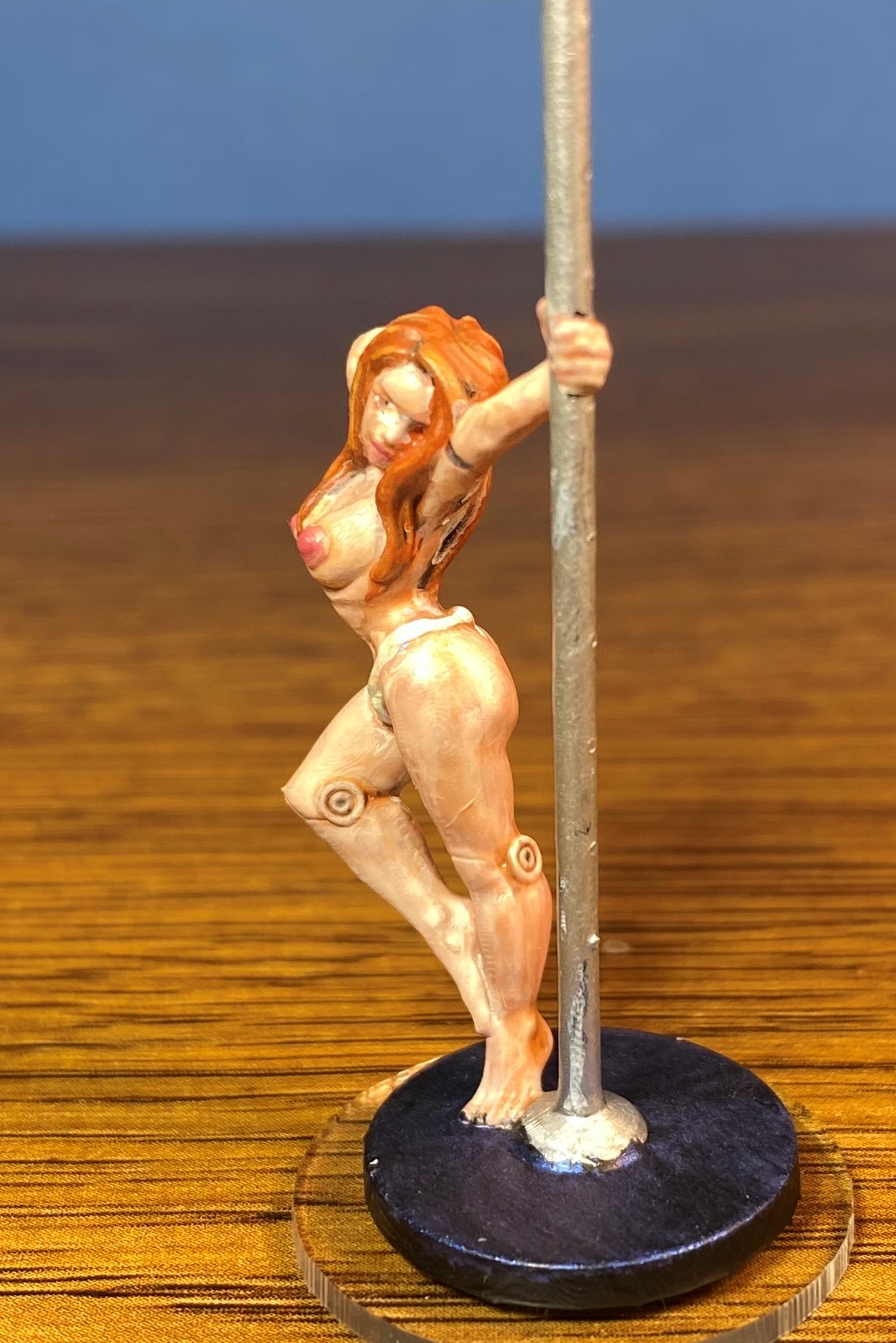 The figure is from Patrick Miniatures in a set called “Stripclub Females”, available in both 32mm and 28mm.