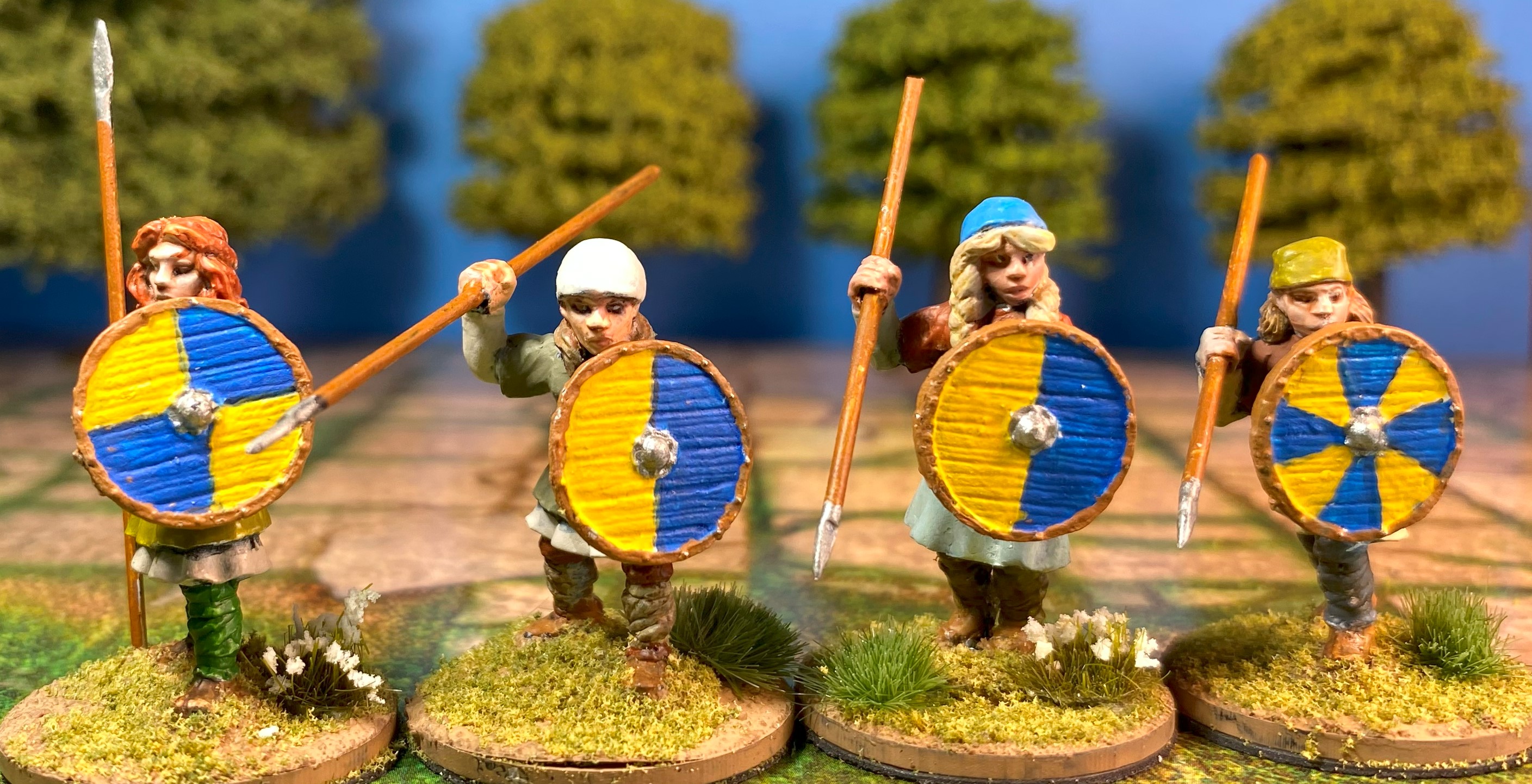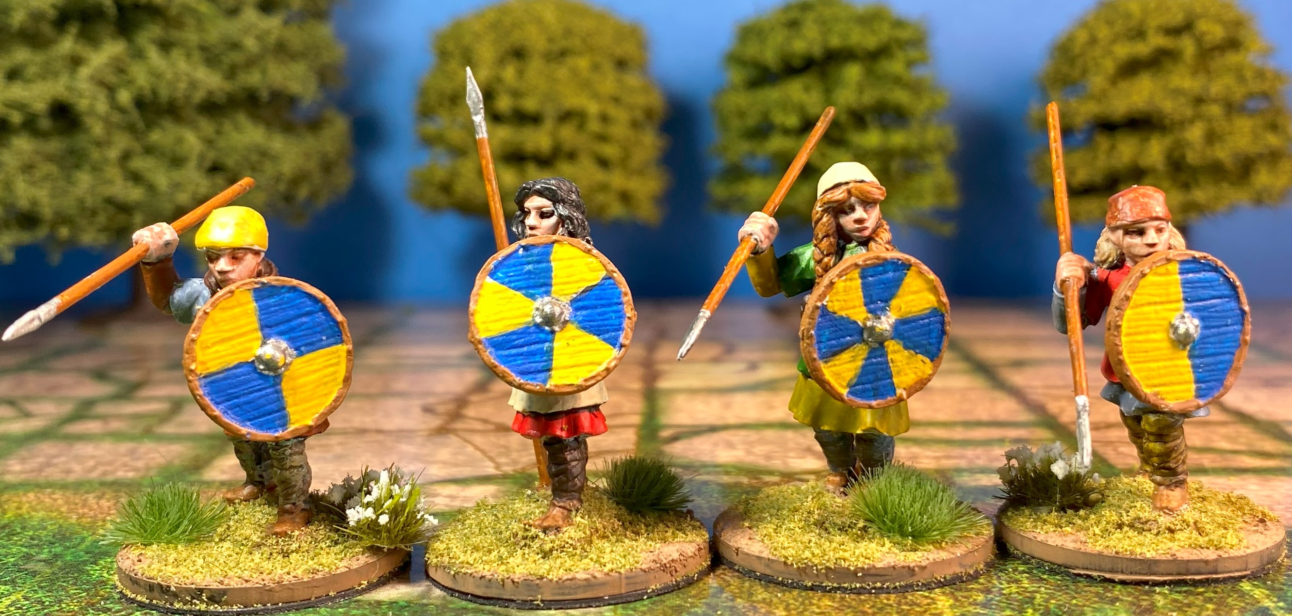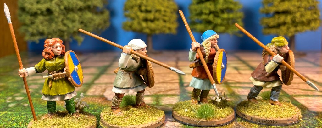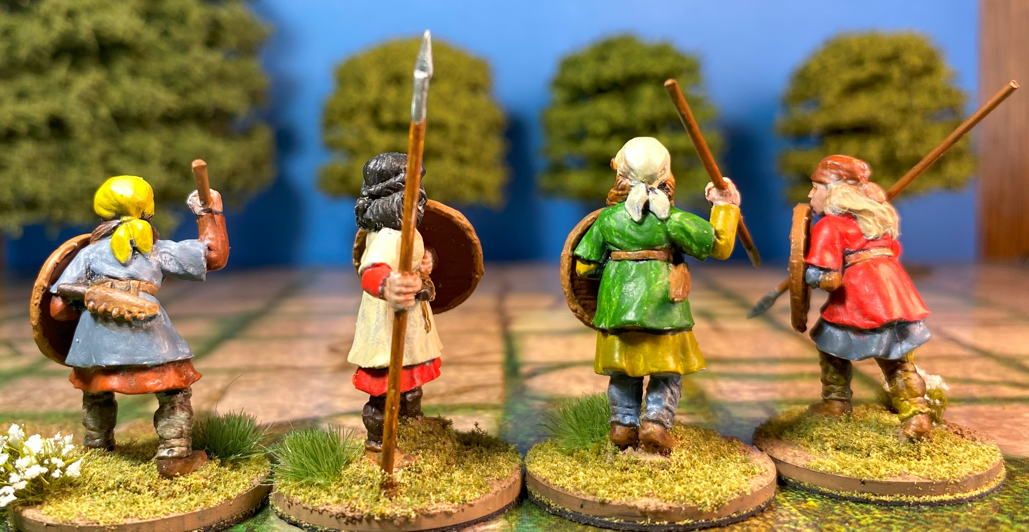 Months ago, I purchased the Shieldmaiden Warband bundle and a few extra figures from Bad Squiddo games. I just finished painting the two packs of Warriors with Spears. I really like the way they turned out and fit well with figures from Wargames Foundry and Artizan Designs.