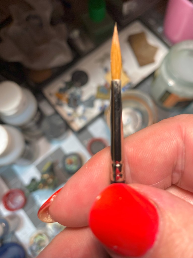 I own brushes in different sizes and conditions. My workhorse, the brush I use most, is a Winsor & Newton Series 7, size 2. It is a sable brush that holds a good sharp tip. I paint nearly every day and I get 12 to 16 months out of the brush before it has to be replaced. Once replaced, I use the older brushes mostly for terrain, washes, metallic paints, and priming.