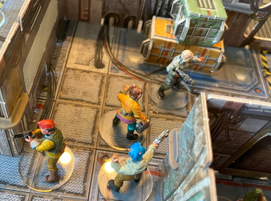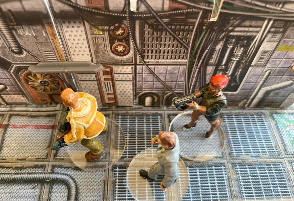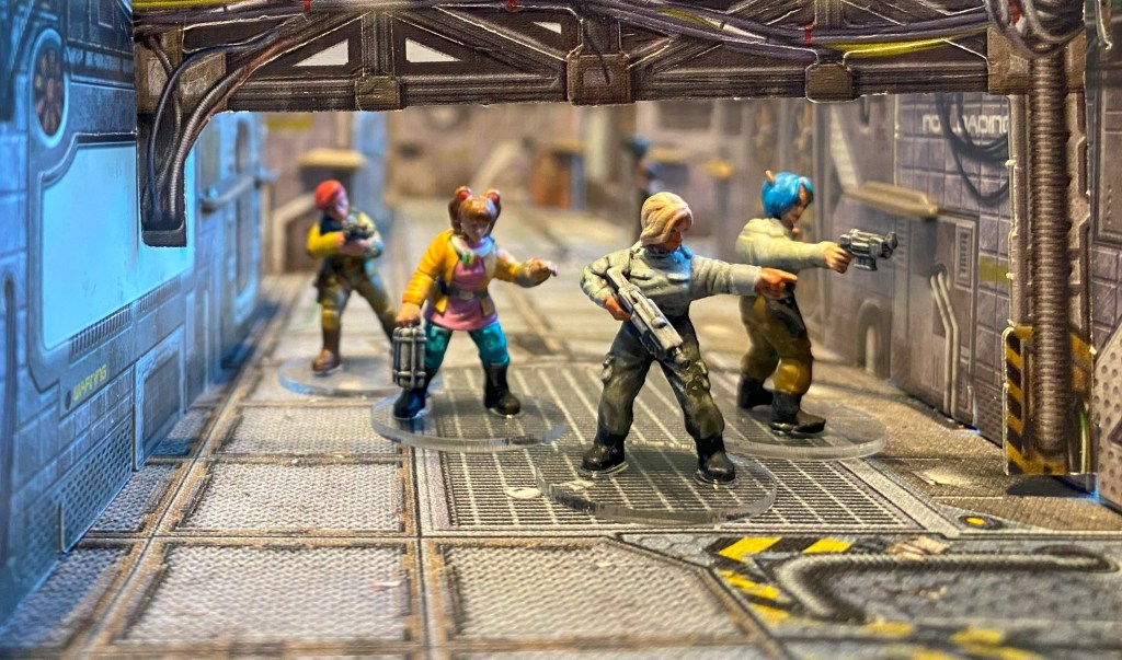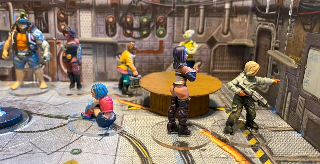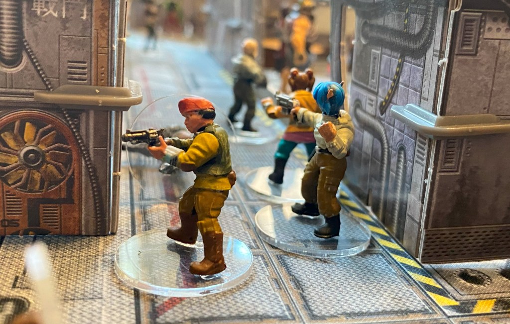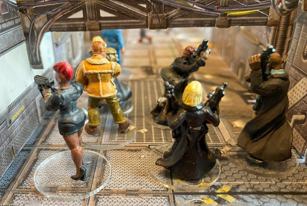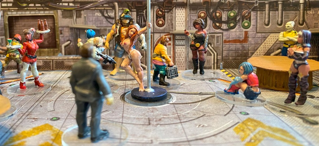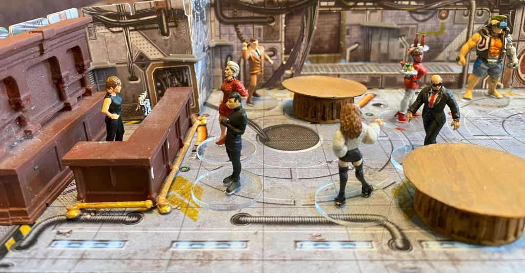 The game takes place in the space port of Phorix 3, represented on a 2-foot x 2-foot board with enough scenery to break up lines of fire. All civilians are Grunts, Rep 3, and are unarmed, well the bartender does have an ice pick. The exception is Cricket, who is Rep 4.