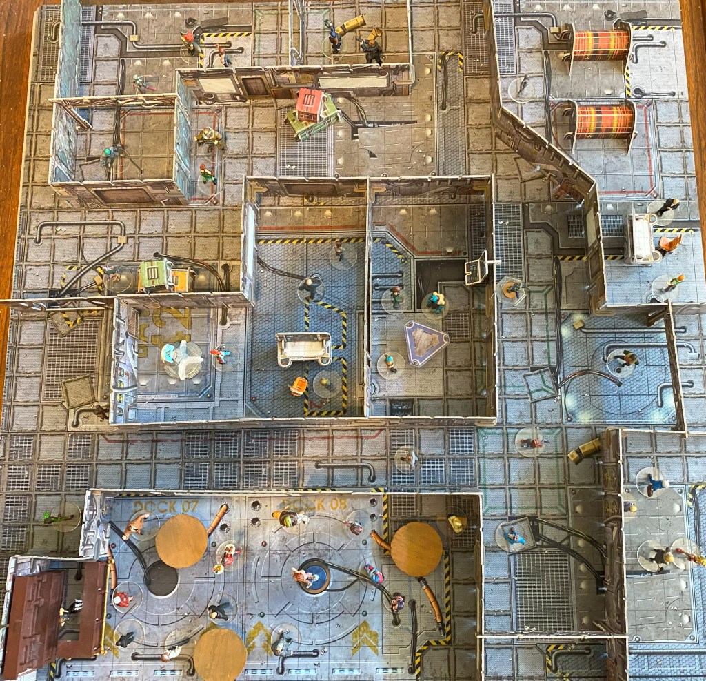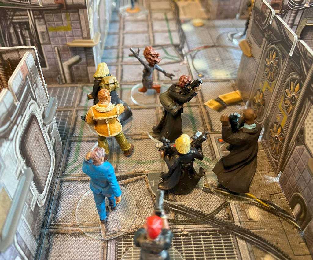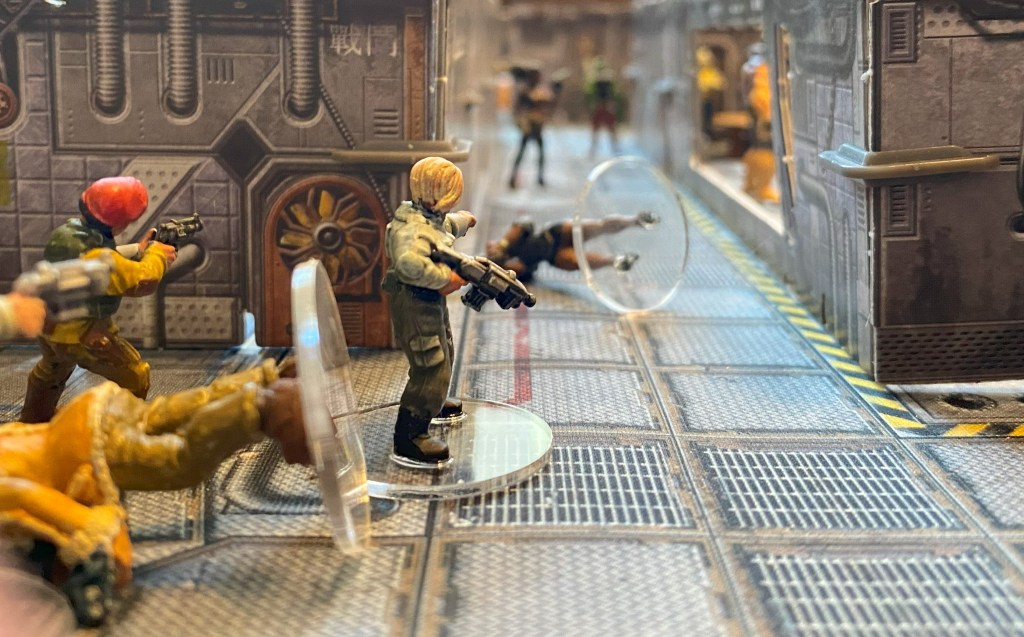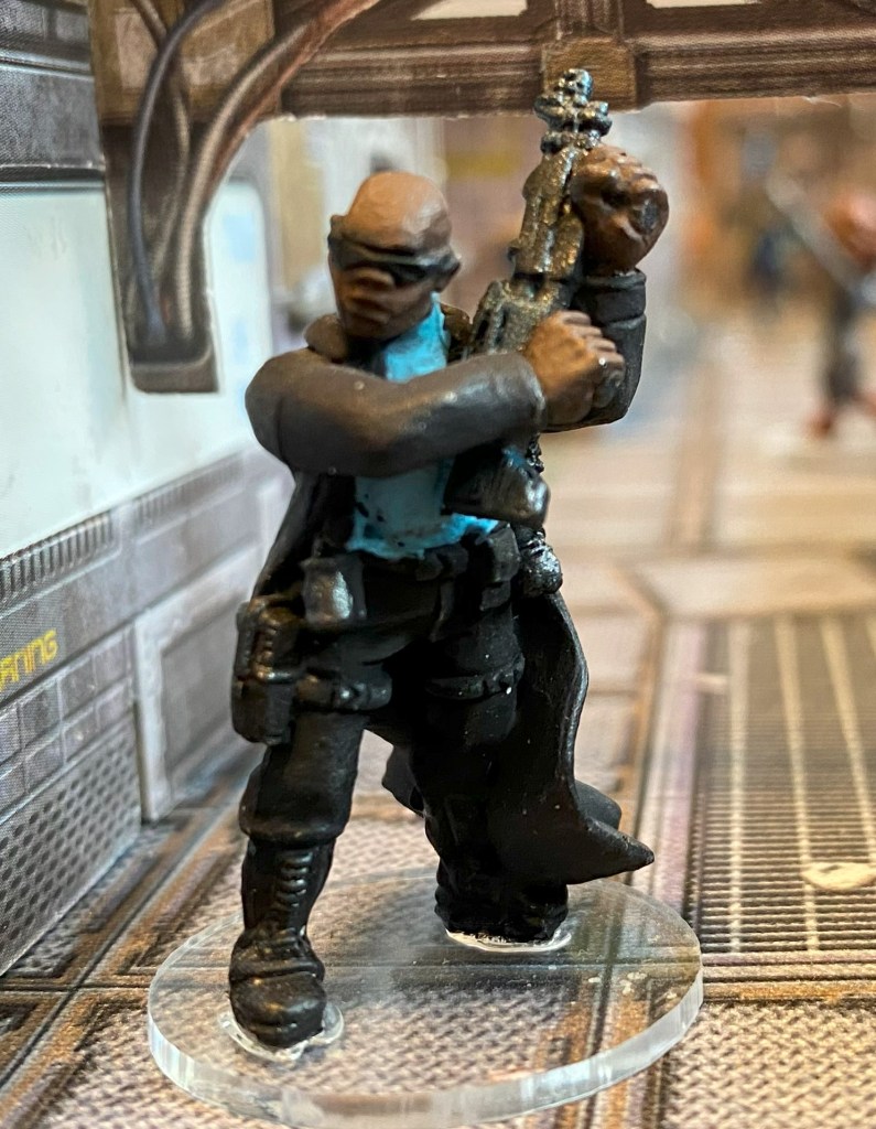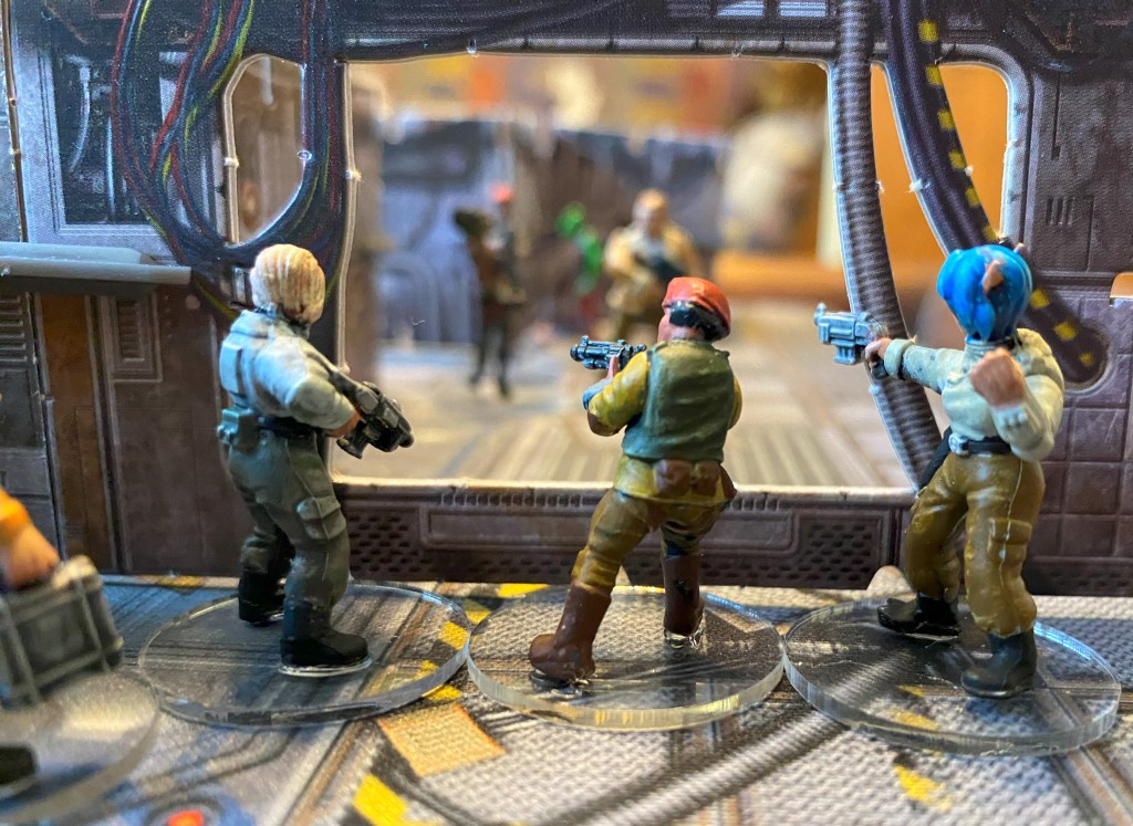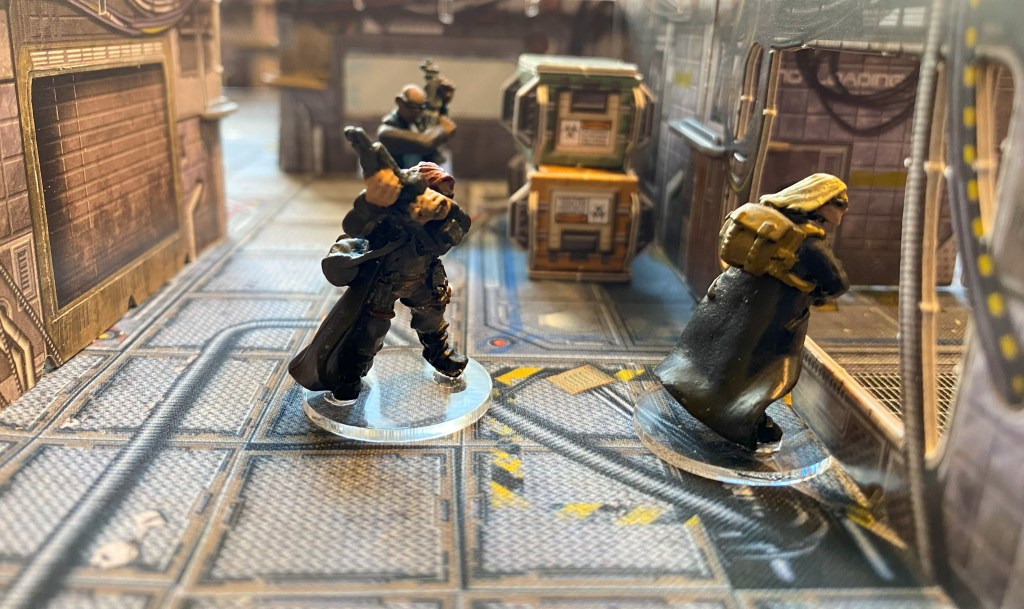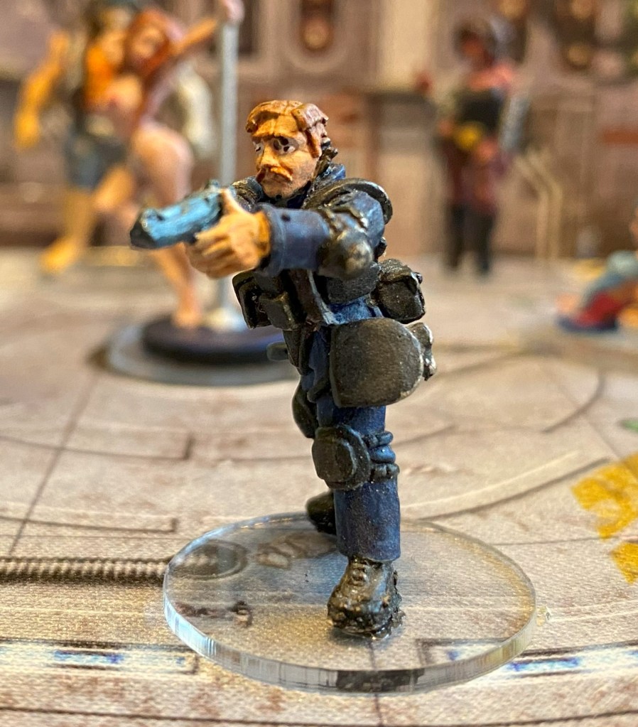 The game takes place in the space port of Phorix 3, represented on a 2-foot x 2-foot board with enough scenery to break up lines of fire. All civilians are Grunts, Rep 3, and are unarmed, well the bartender does have an ice pick. The exception is Cricket, who is Rep 4.