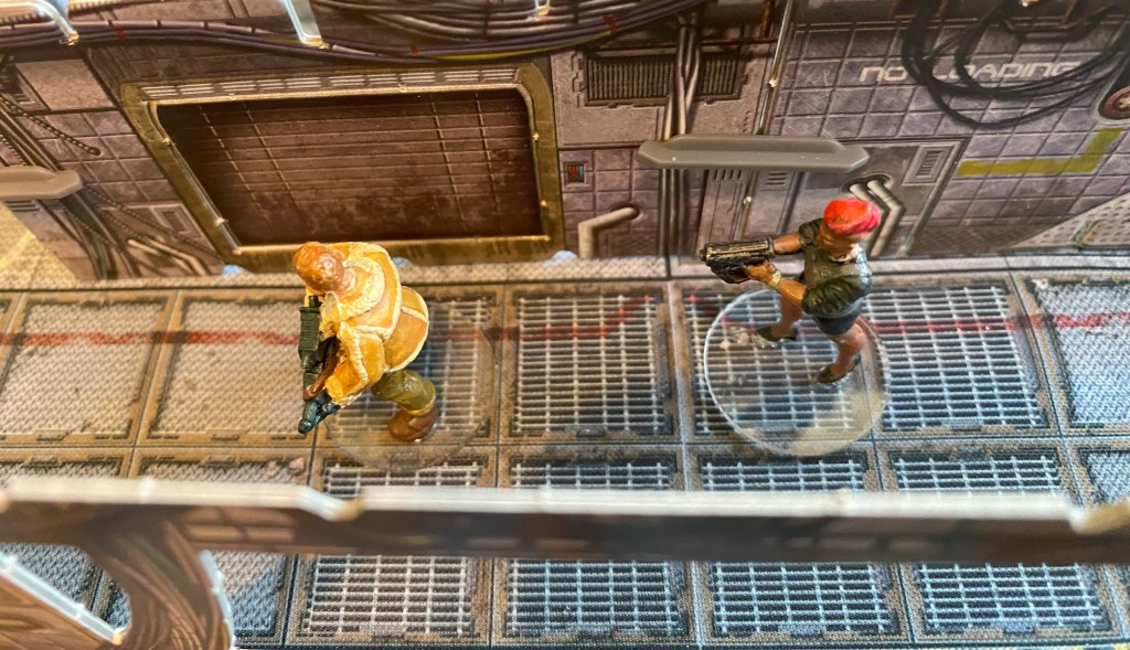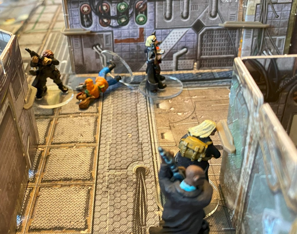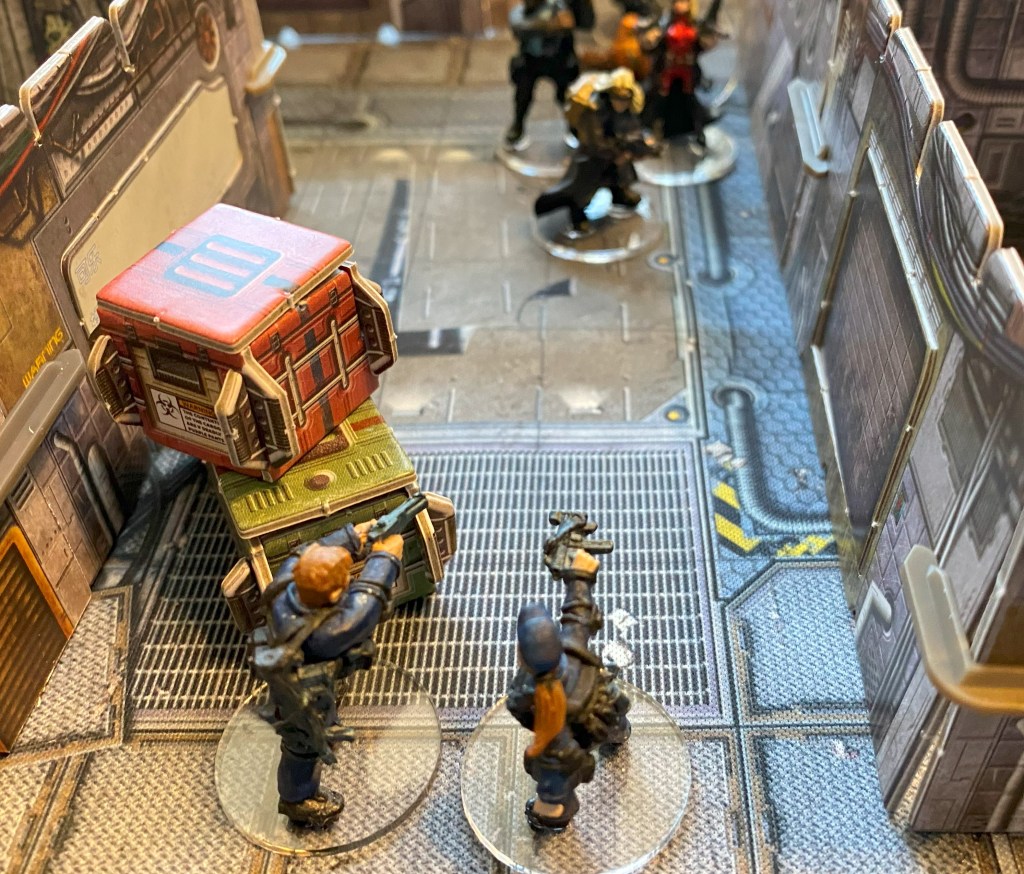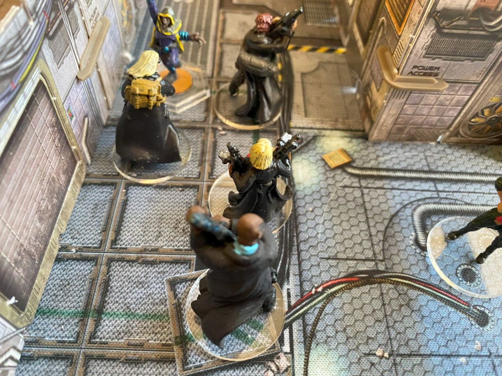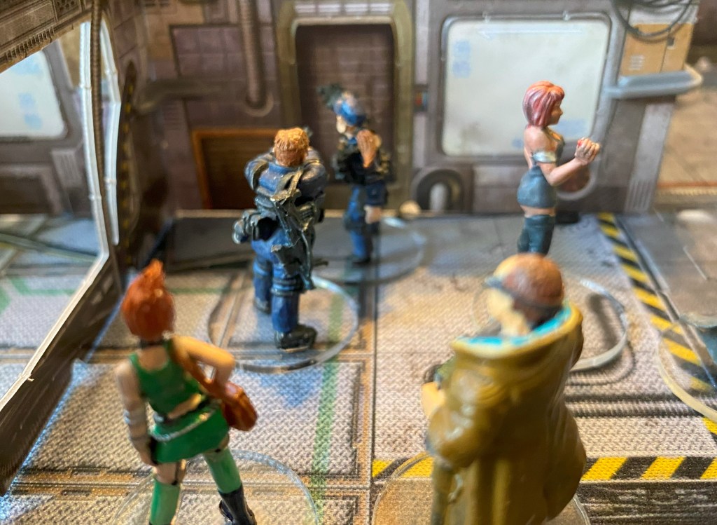 Paisely Bliss steps in sight of the Hired Muscle, to avoid an early fire fight, Valerie’s group dash away down a side corridor leaving Paisely Bliss in cover to await the mercenaries.