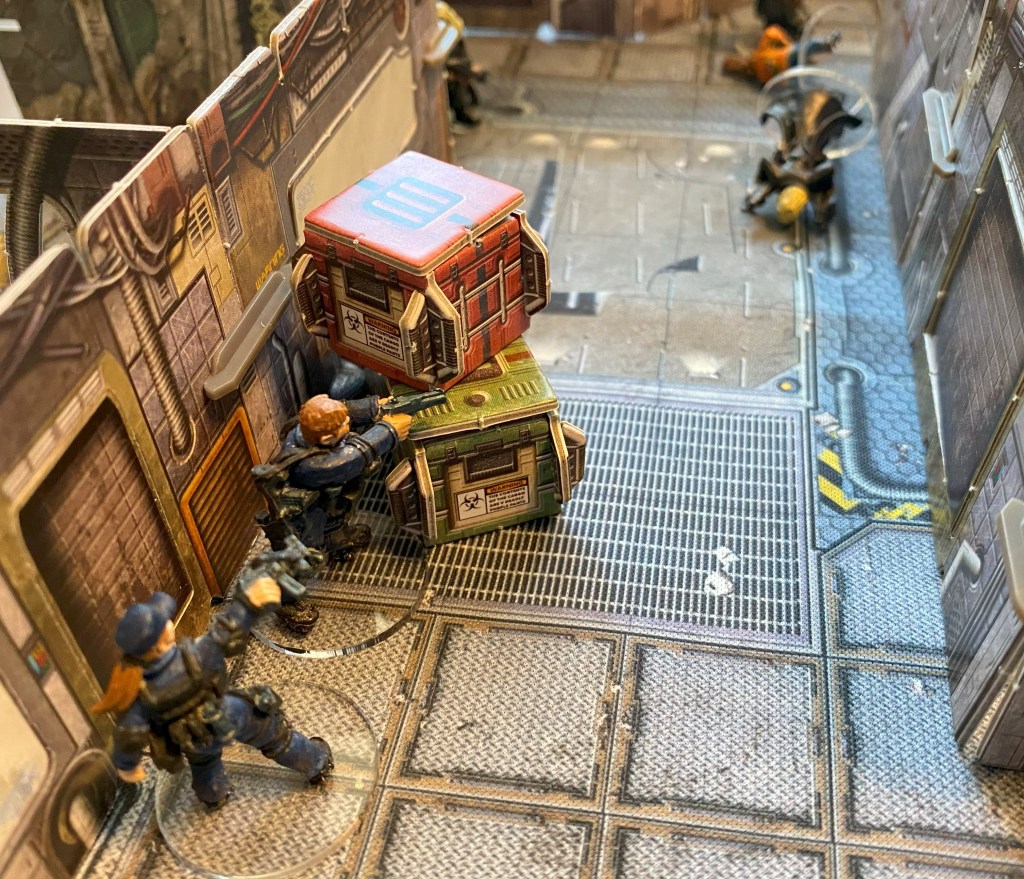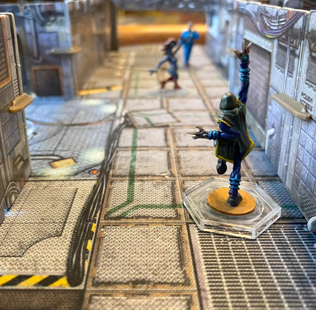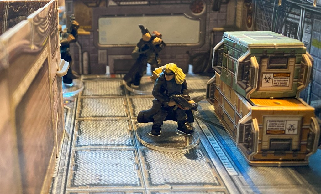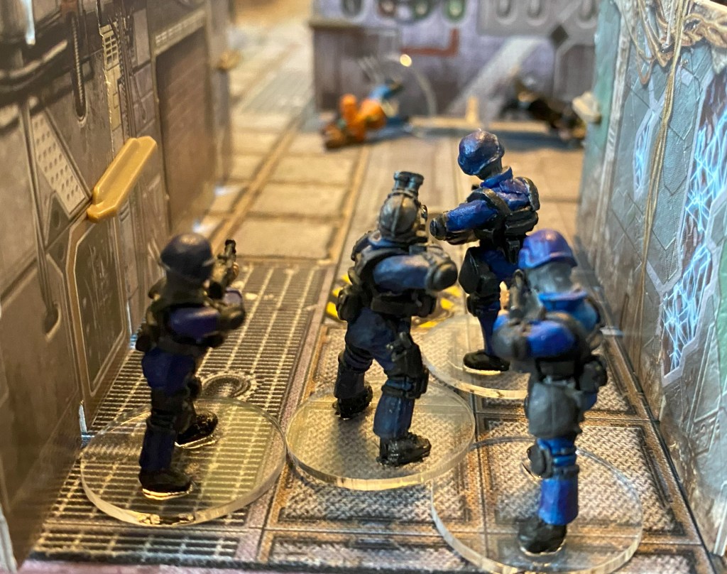 Paisely Bliss steps in sight of the Hired Muscle, to avoid an early fire fight, Valerie’s group dash away down a side corridor leaving Paisely Bliss in cover to await the mercenaries.