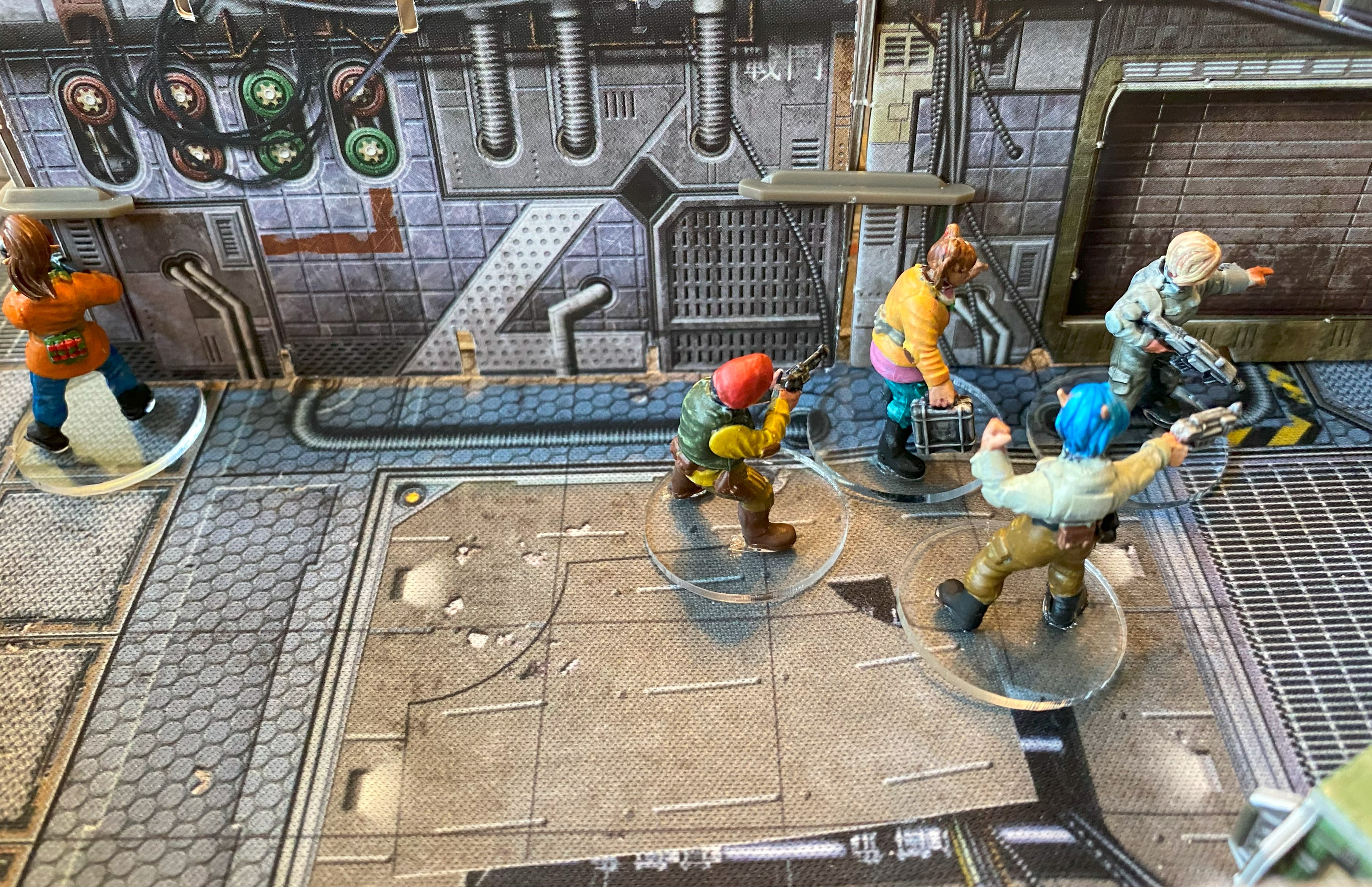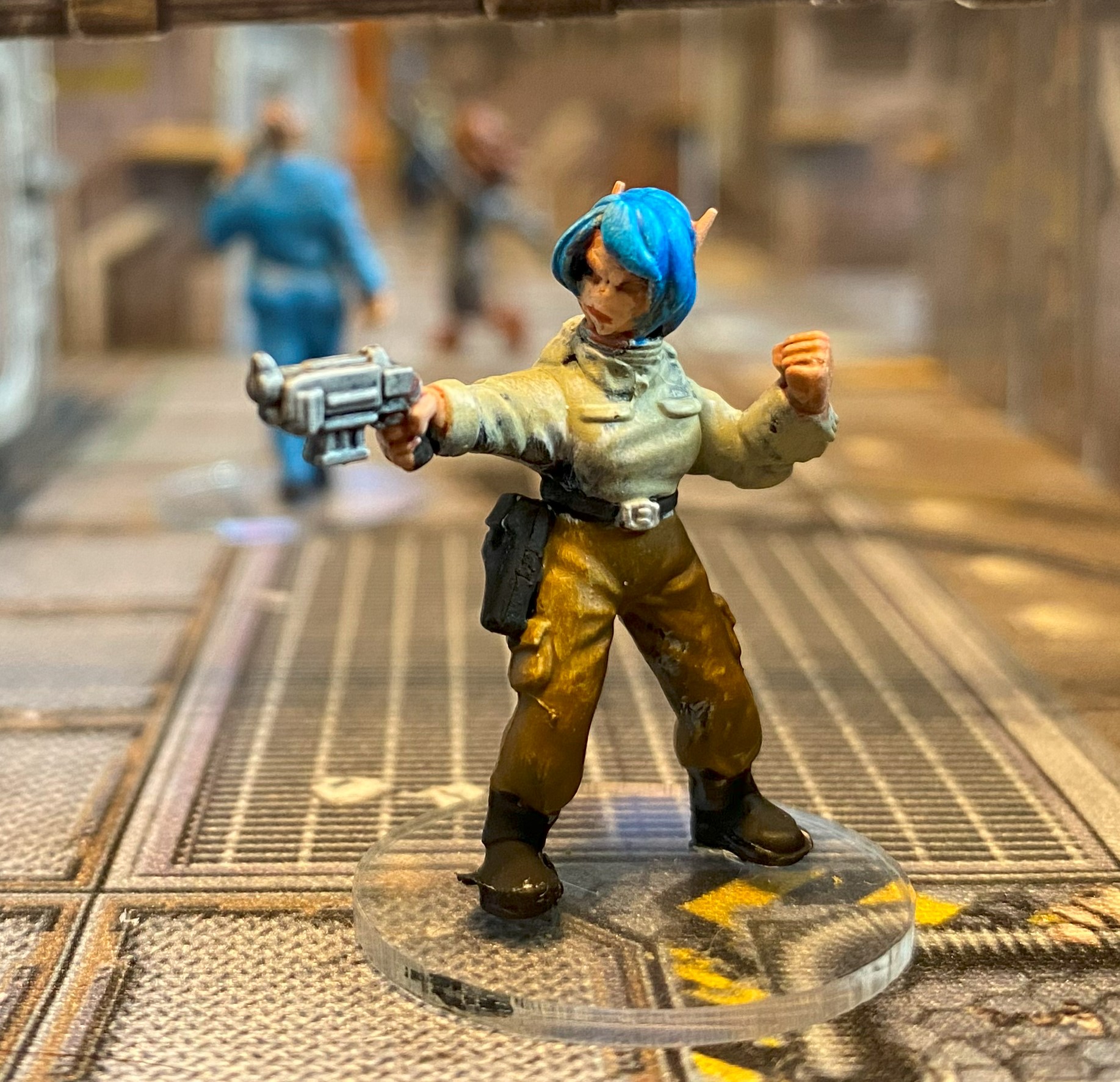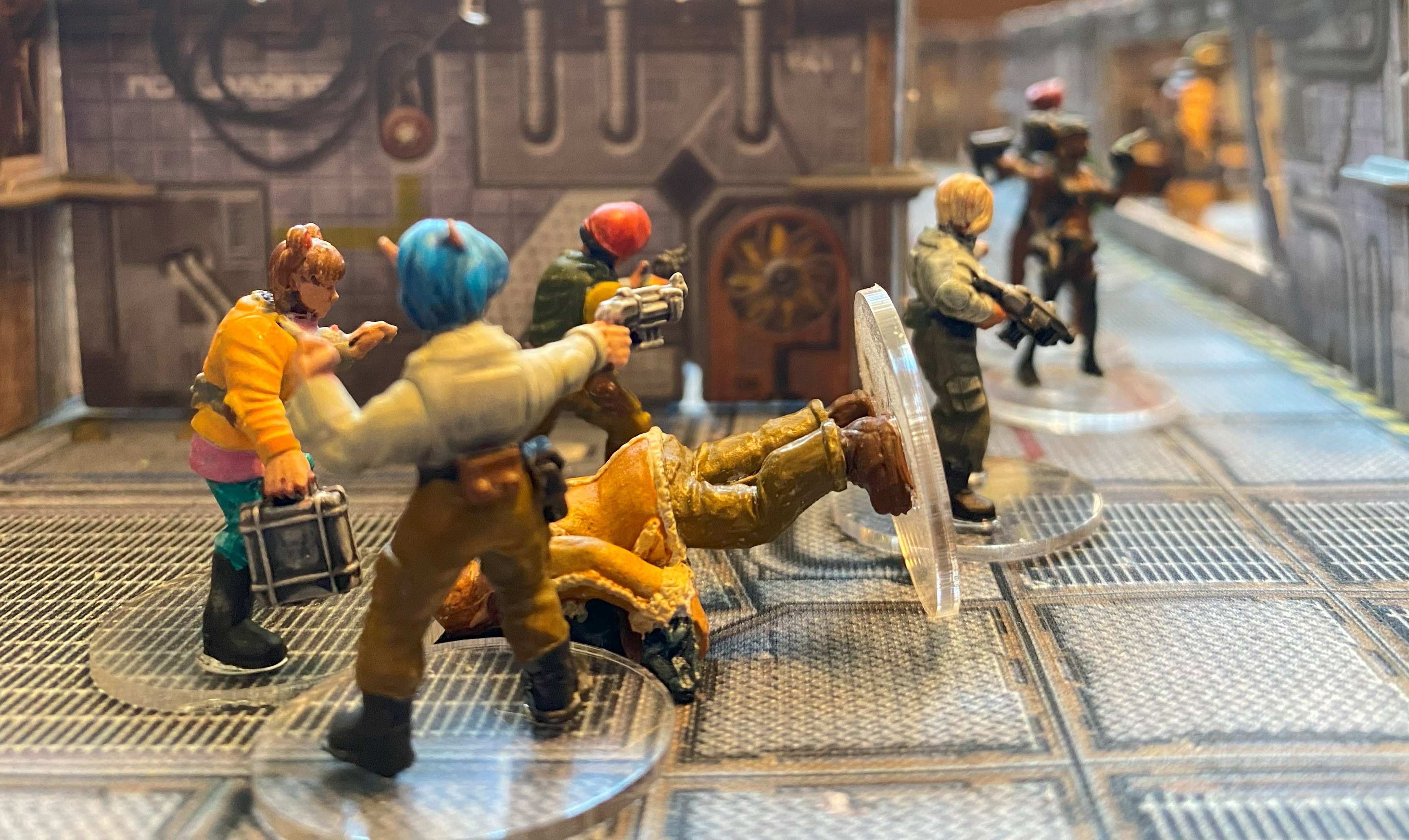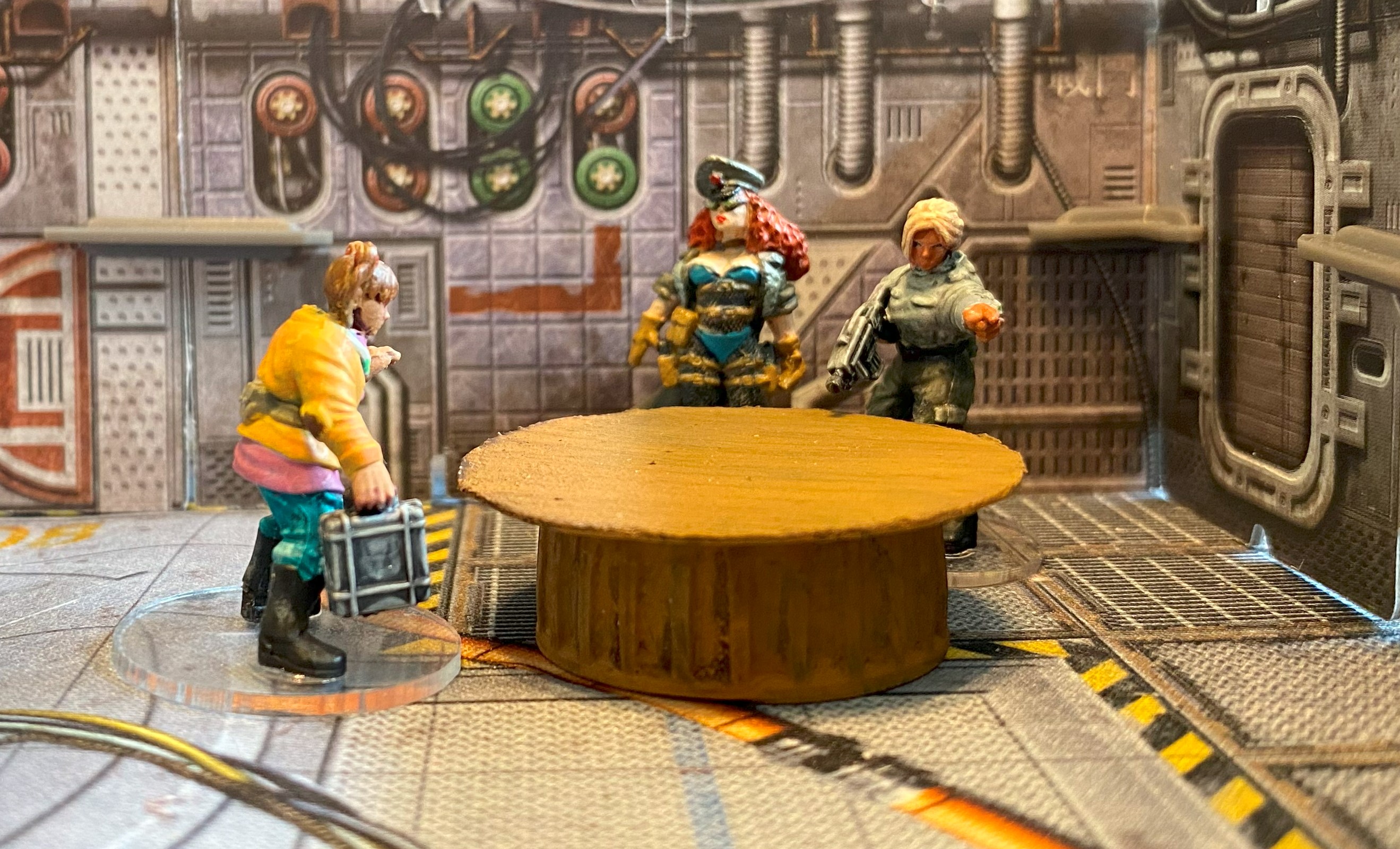 The game takes place in the space port of Phorix 3, represented on a 2-foot x 2-foot board with enough scenery to break up lines of fire. All civilians are Grunts, Rep 3, and are unarmed, well the bartender does have an ice pick. The exception is Cricket, who is Rep 4.