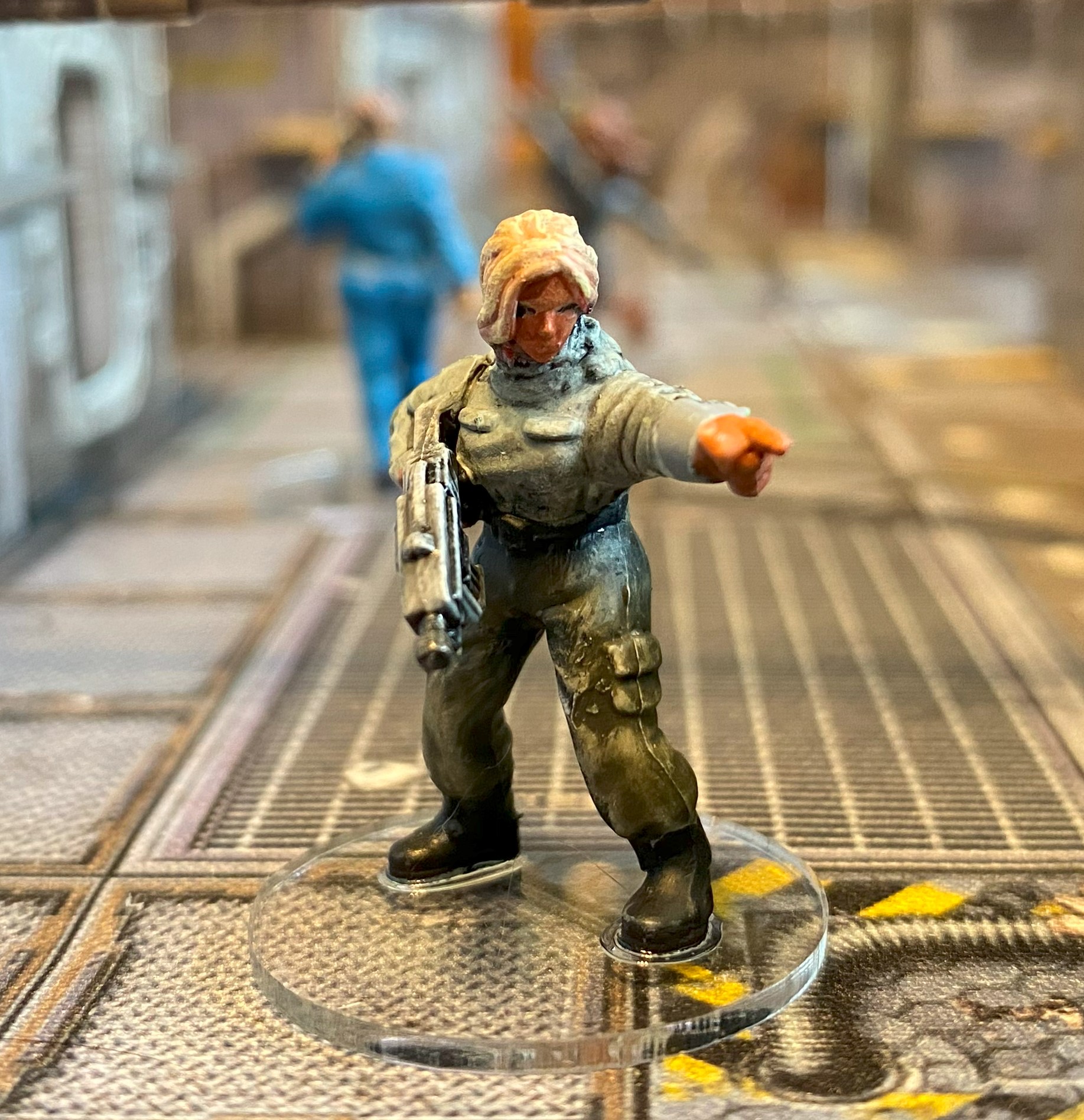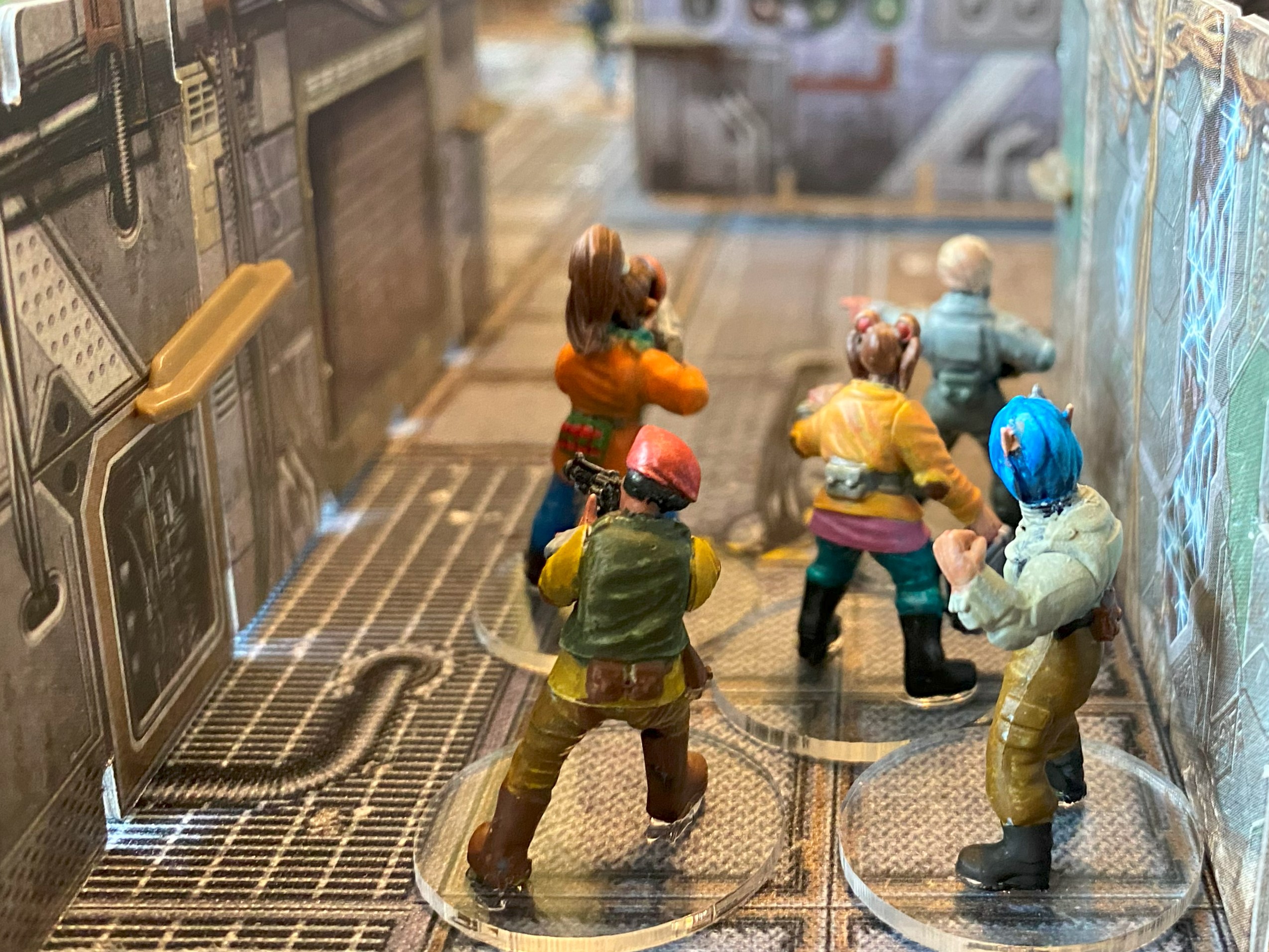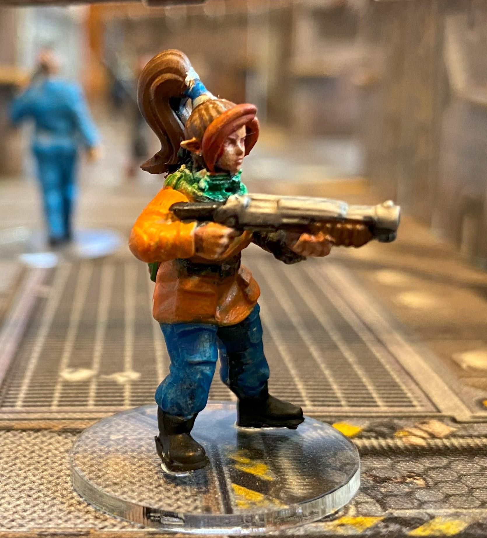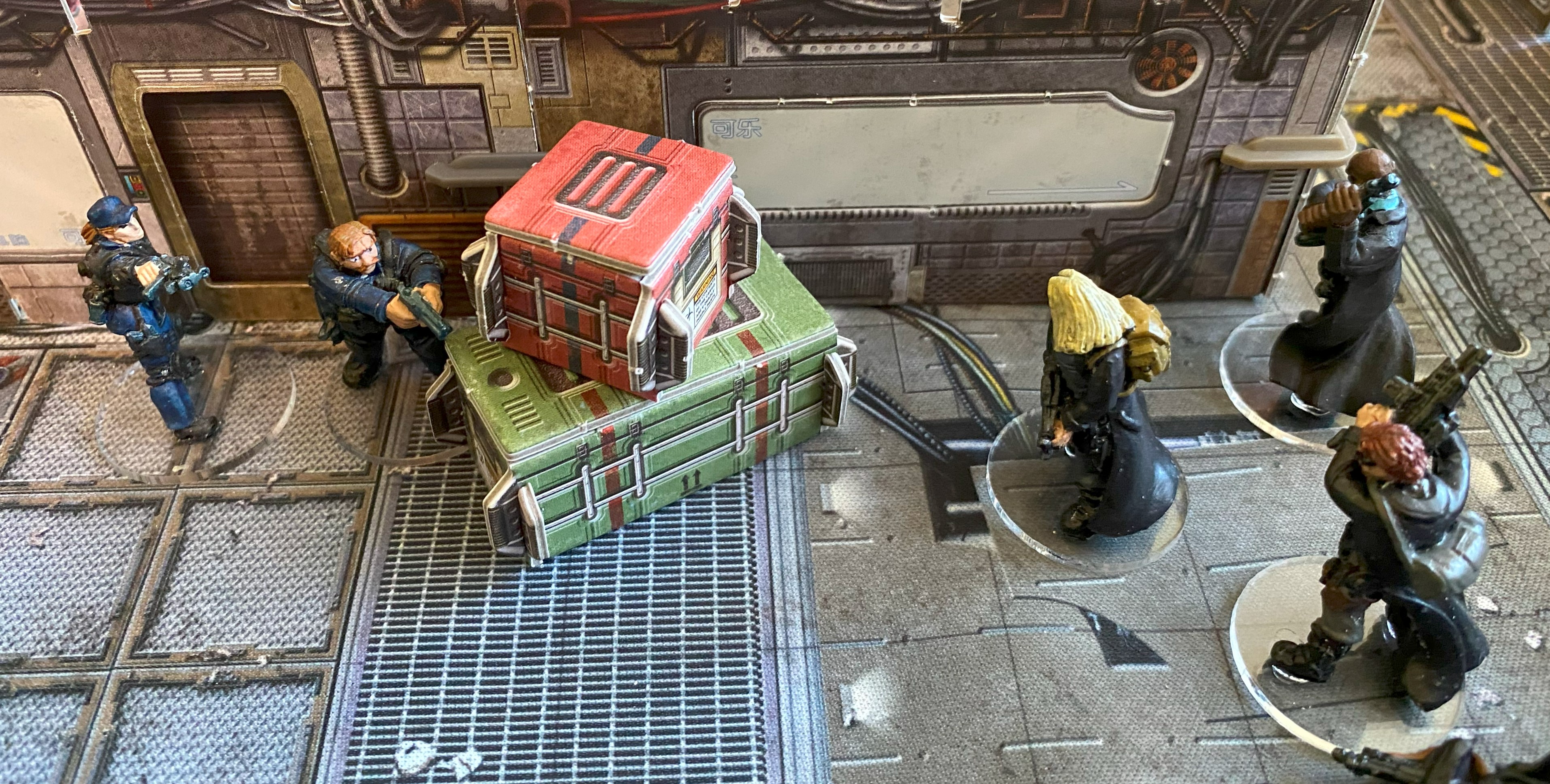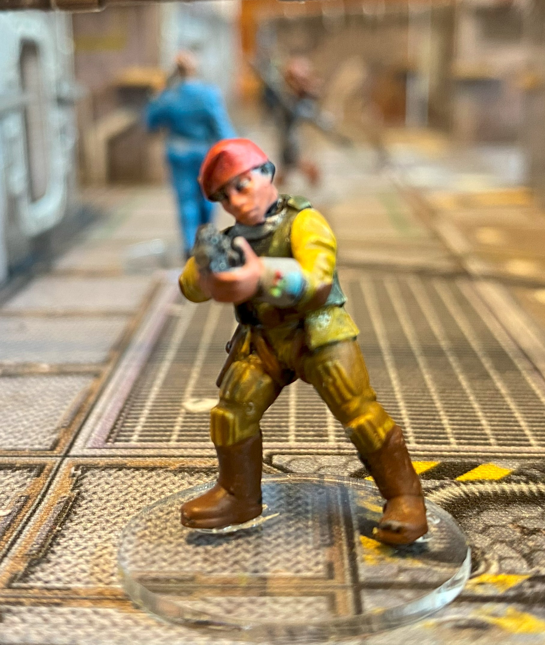 The game takes place in the space port of Phorix 3, represented on a 2-foot x 2-foot board with enough scenery to break up lines of fire. All civilians are Grunts, Rep 3, and are unarmed, well the bartender does have an ice pick. The exception is Cricket, who is Rep 4.