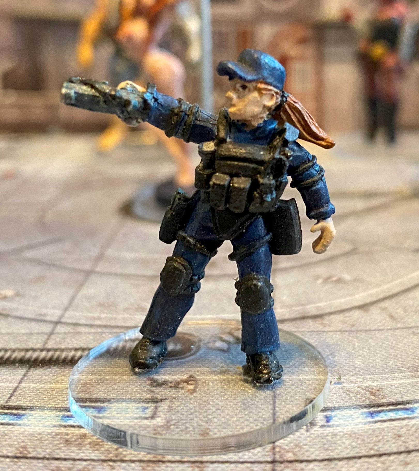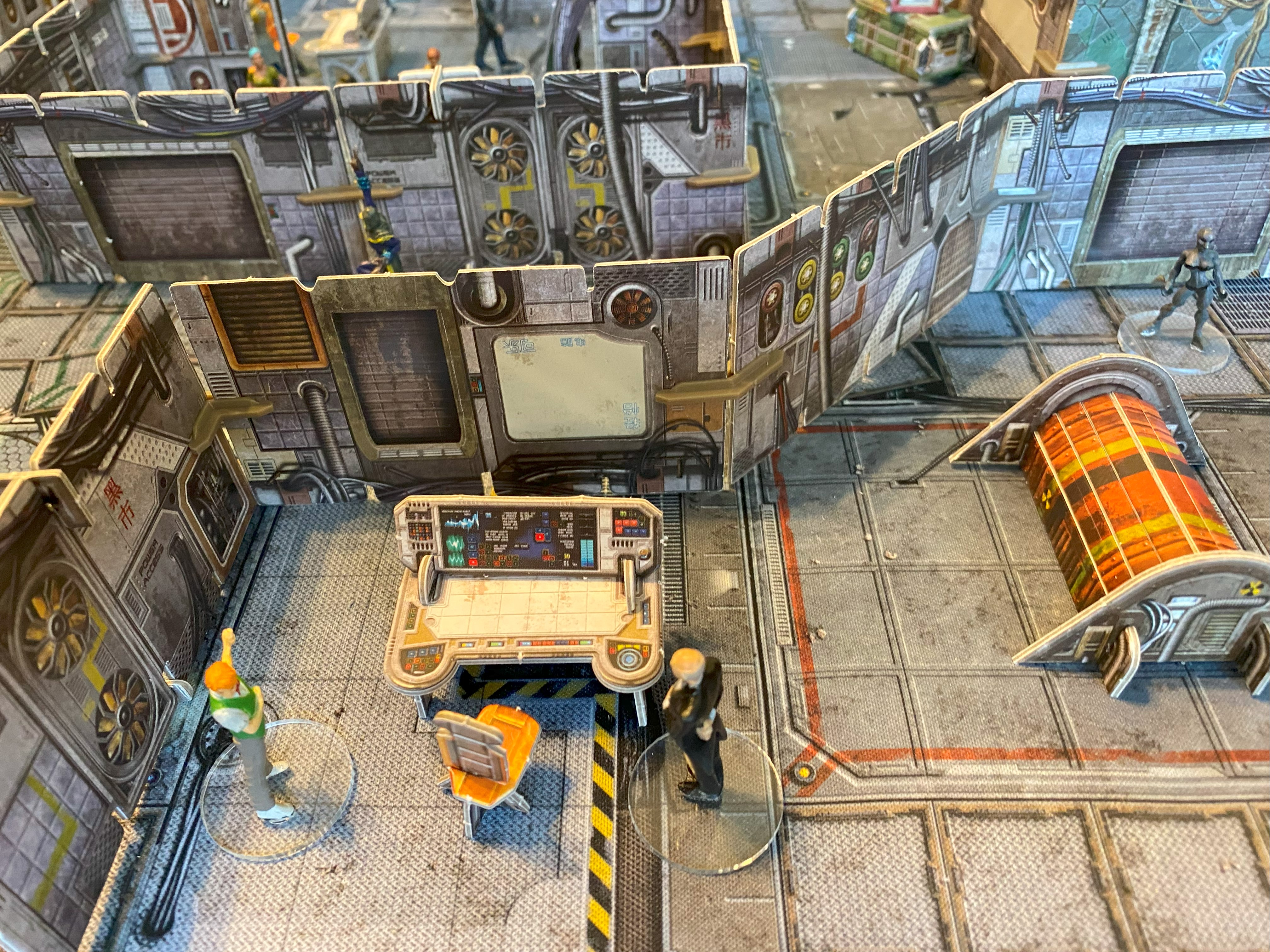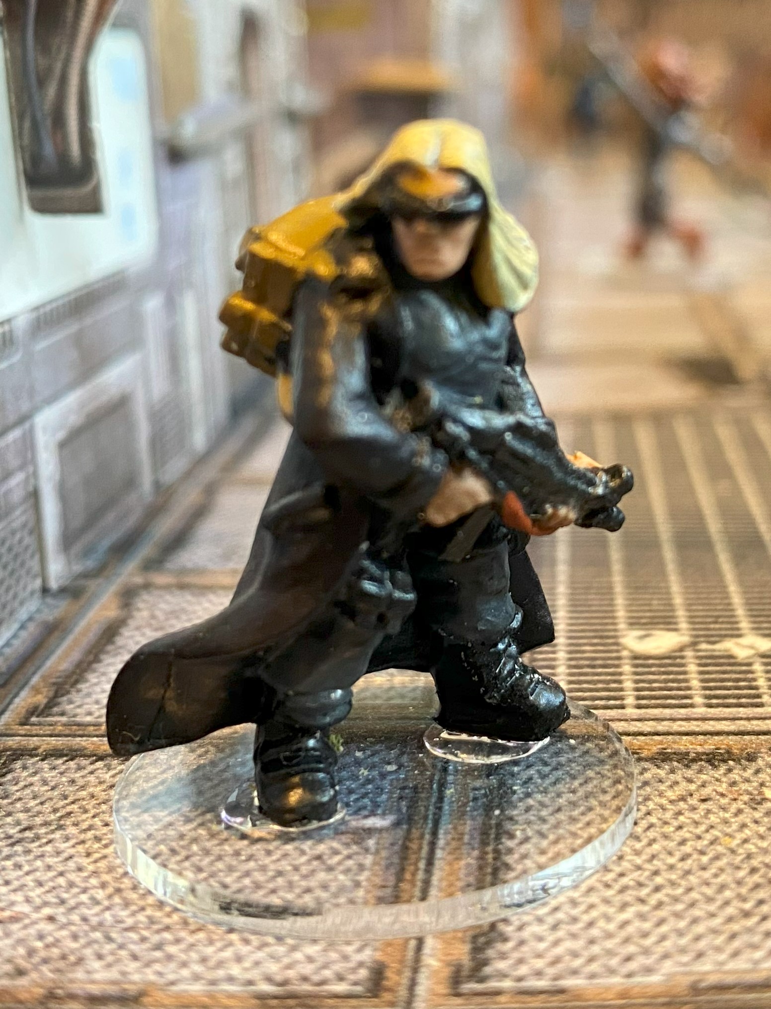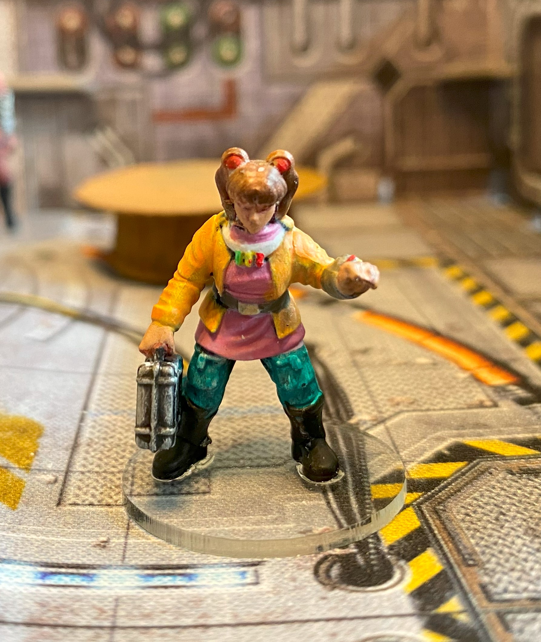 The game takes place in the space port of Phorix 3, represented on a 2-foot x 2-foot board with enough scenery to break up lines of fire. All civilians are Grunts, Rep 3, and are unarmed, well the bartender does have an ice pick. The exception is Cricket, who is Rep 4.