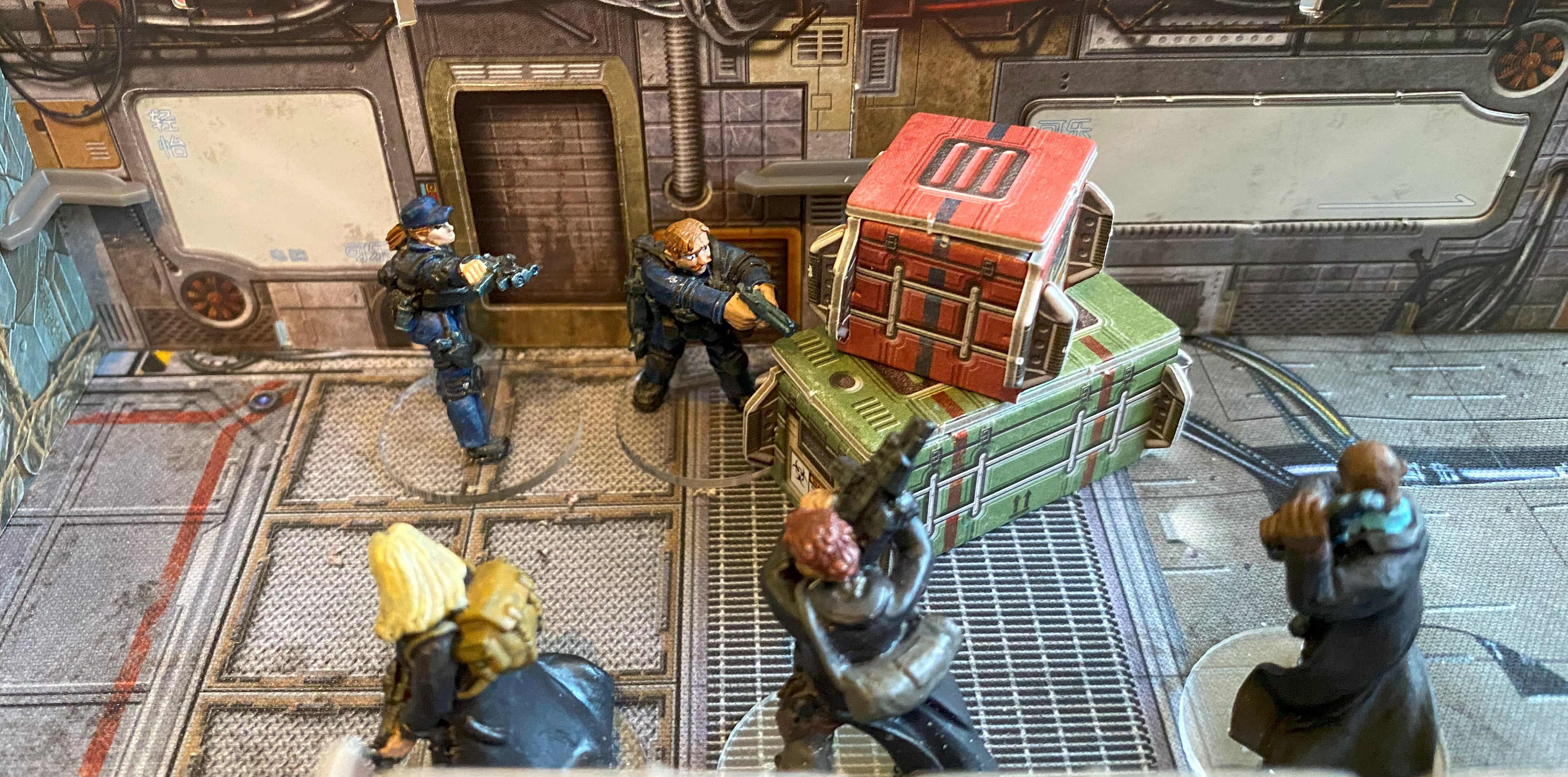 Paisely Bliss steps in sight of the Hired Muscle, to avoid an early fire fight, Valerie’s group dash away down a side corridor leaving Paisely Bliss in cover to await the mercenaries.