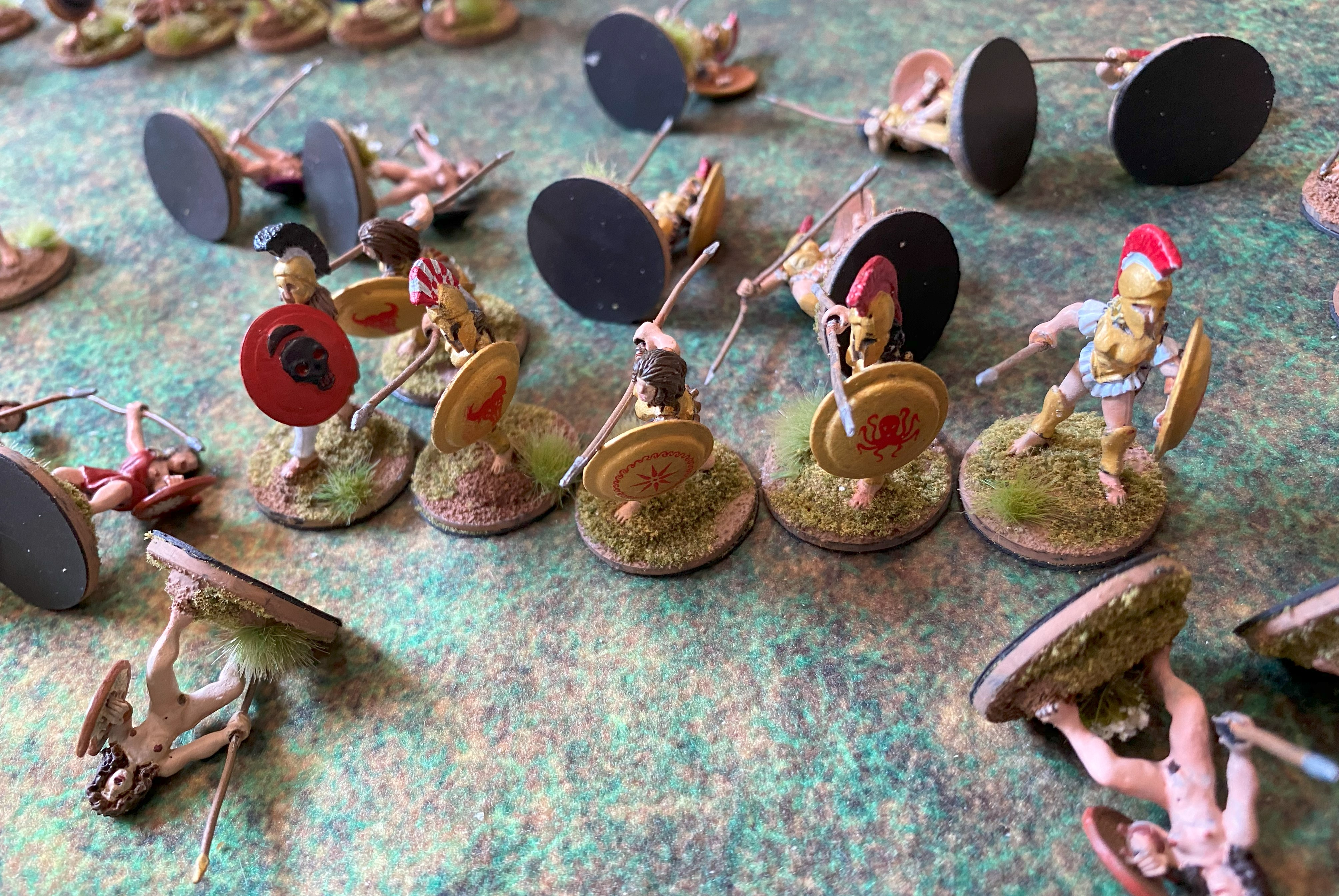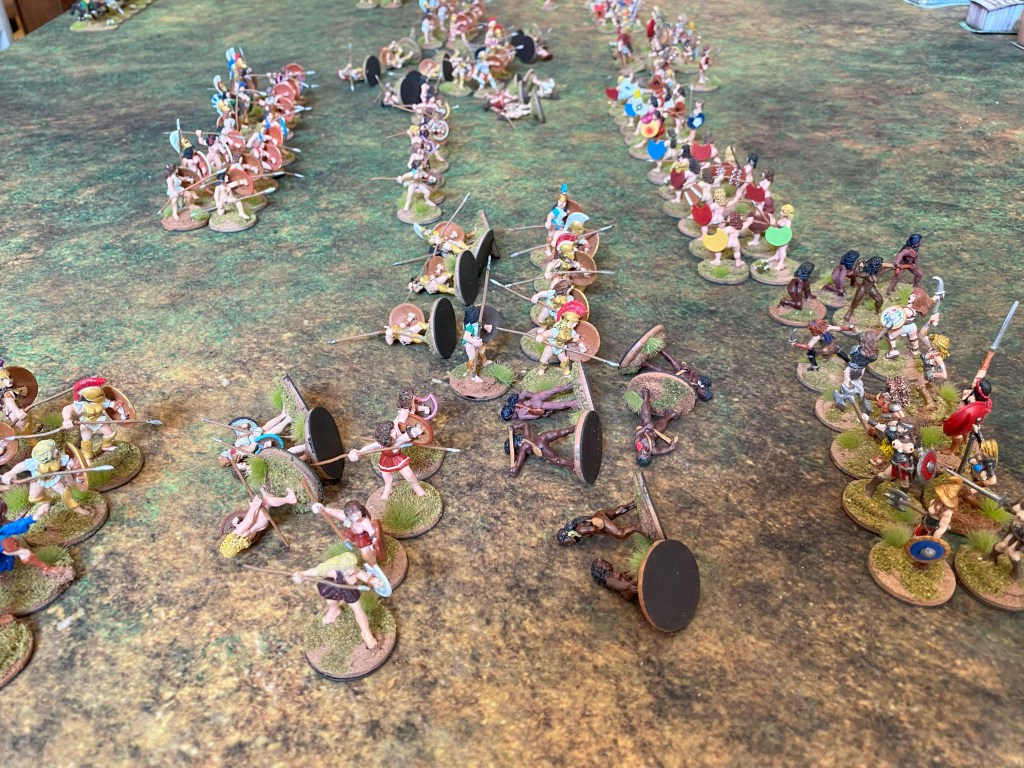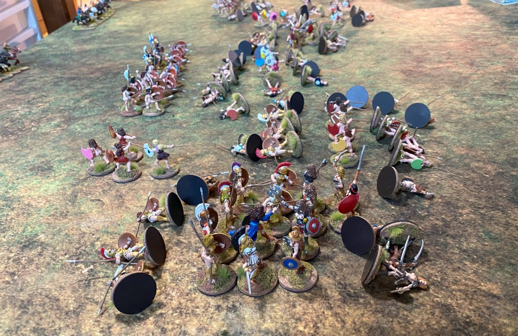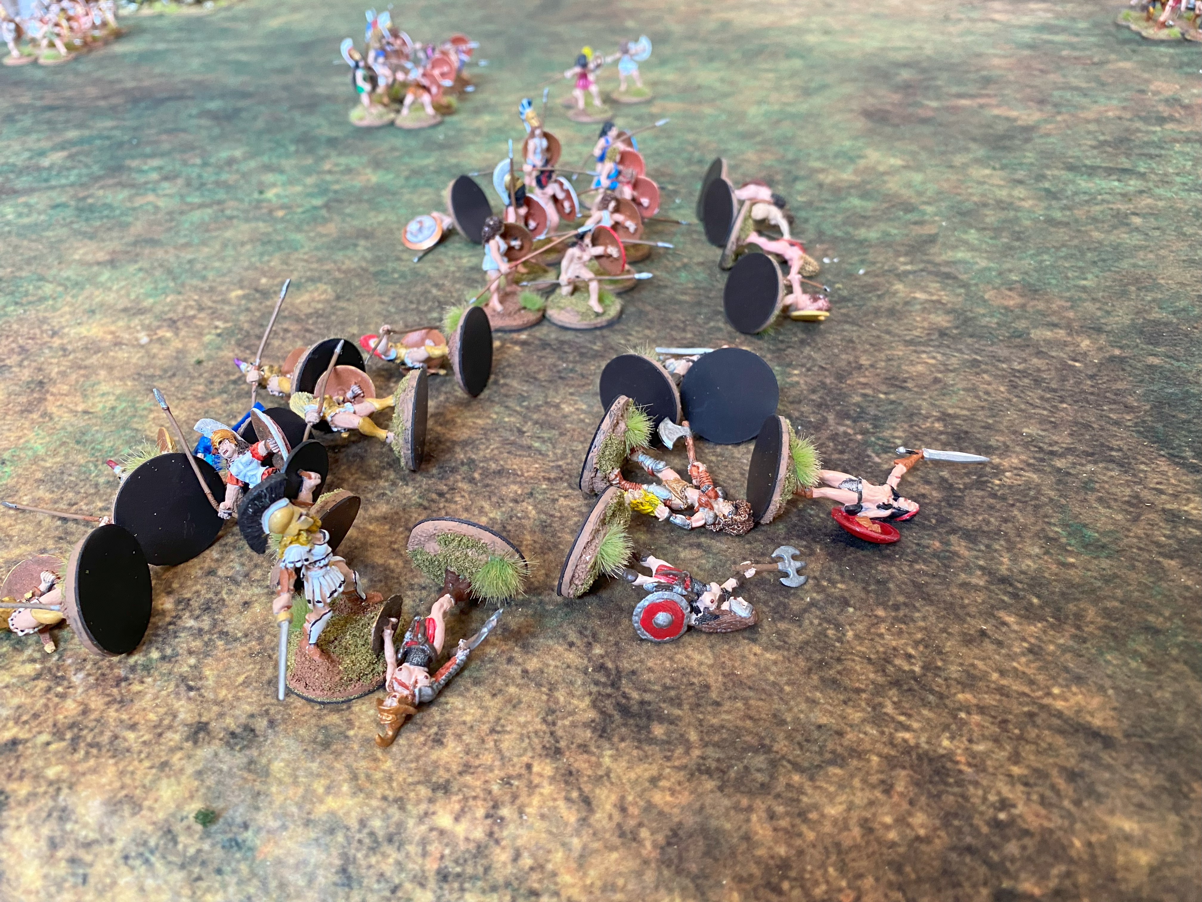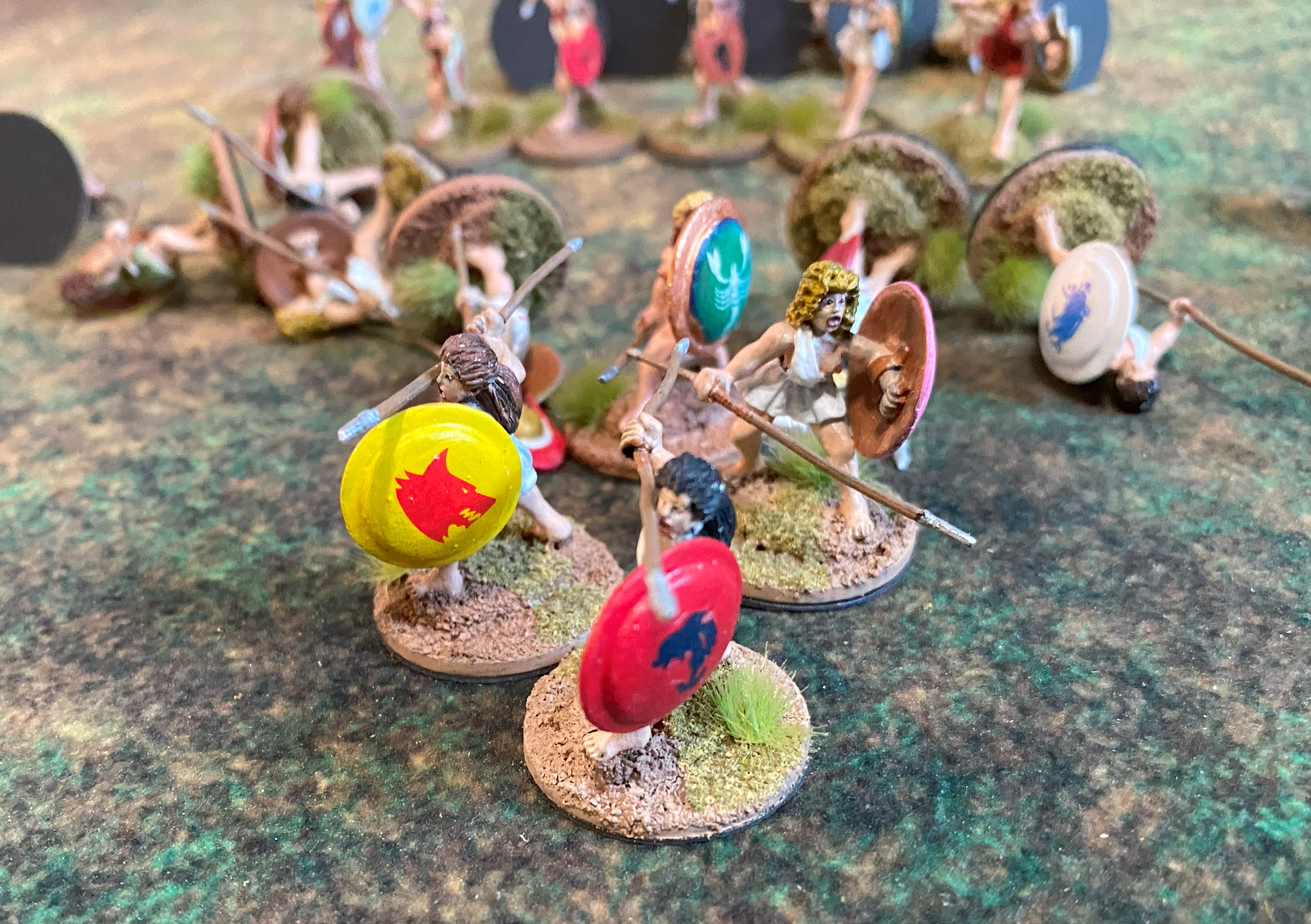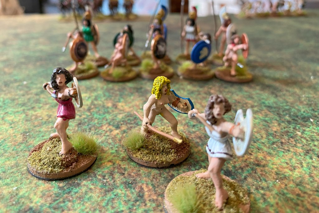 The Anysia militia peltasts charge Electra’s peltasts. After the first round of melee, Electra is the last woman standing of her unit.