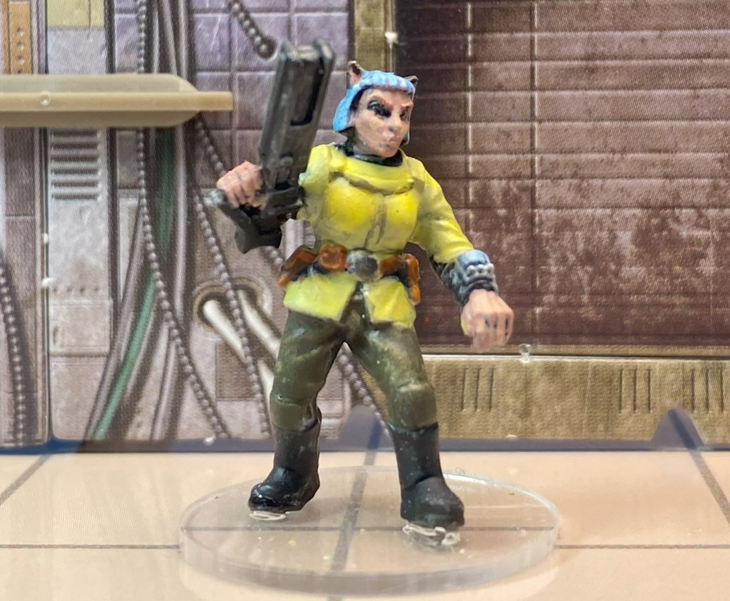 In Five Parsecs from Home, one of the crew options is a Feral. Ferals are “humanoid-animal hybrids, typically patterned on Earth predators such as wolves or large cats. Originally engineered for military purposes, they are considered an independent species in United Space.” The Stargrave Female Crew set from North Star Military Figures has a cat girl head on the sprue, so I made a Feral to use in my Five Parsecs from Home crew.