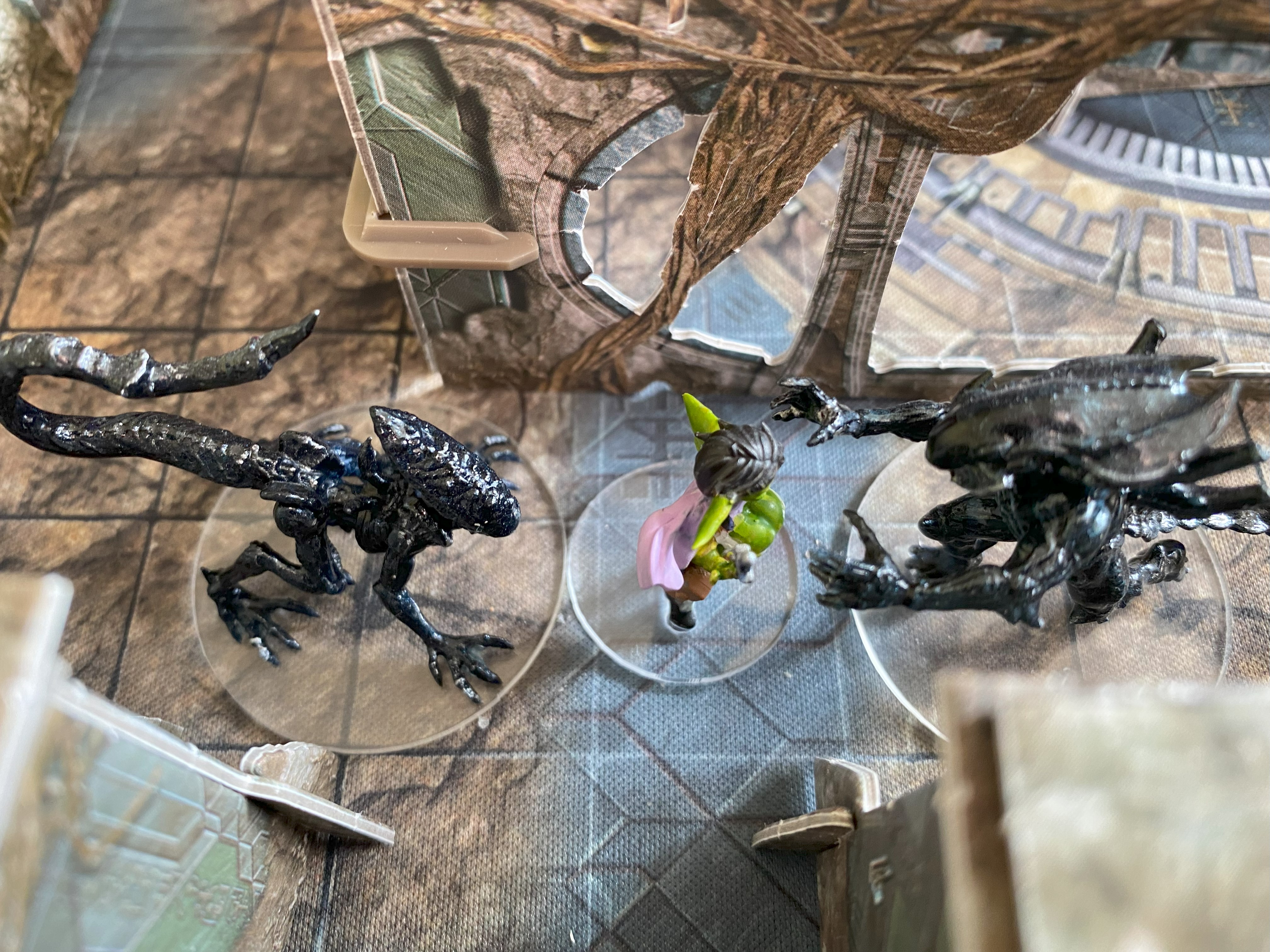 Meanwhile, Rachel was rushed by two beasts. The beasts had sharp claws, but Rachel had one of her own in a finely honed boarding saber. The stunned beasts backed away from the flashing saber, Rachel fired twice and the creature in front of her was dead.