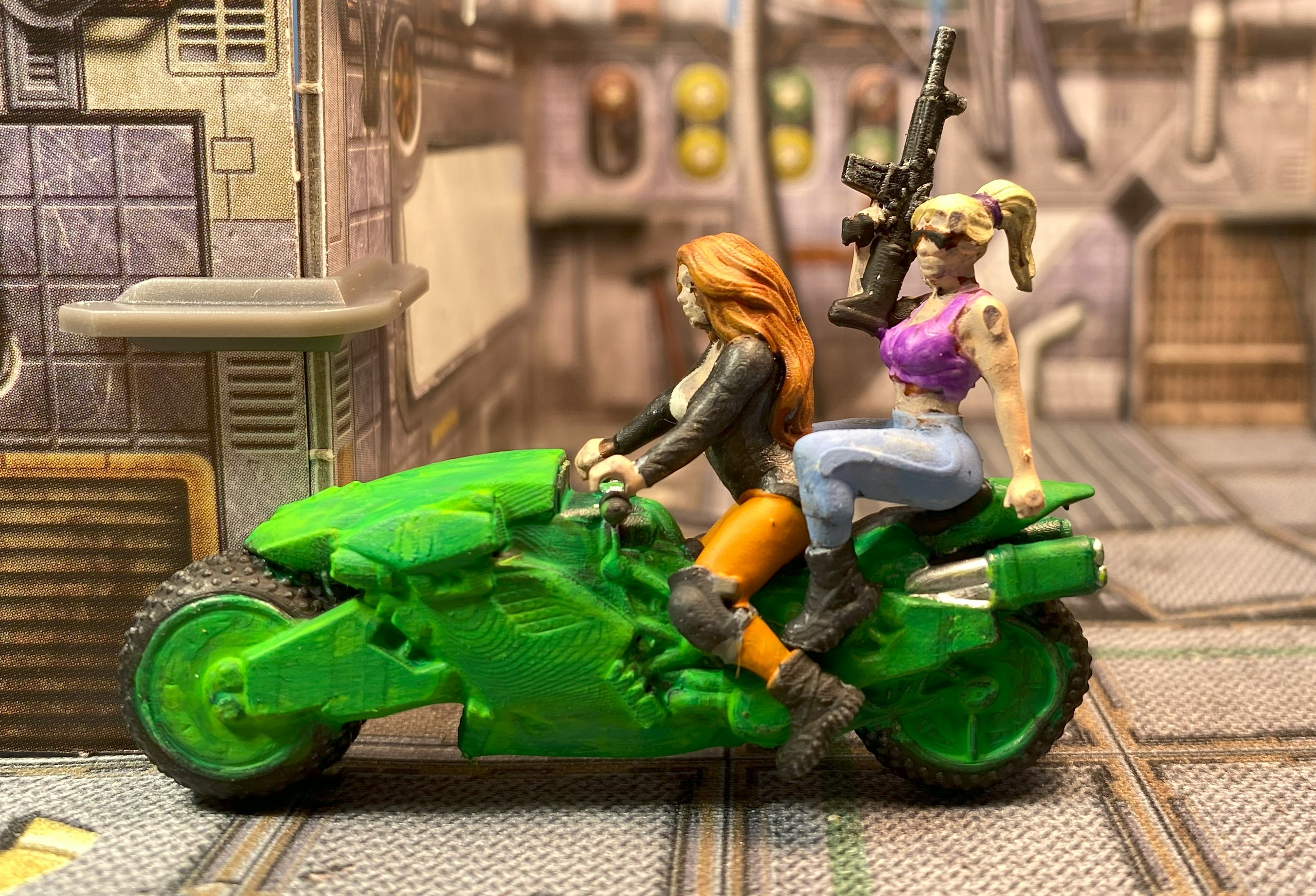 The bike & riders are from Patrick Miniatures, listed as “Sexy Bikers”. The company is in Germany & from what I understand, he ships very quickly. It was a part of a small commission, and the client has purchased several of these in both 28mm & 30mm. The 28mm are true 28mm while the 30mm are the size of current figures from companies like Reaper, GW, North Star, and others.