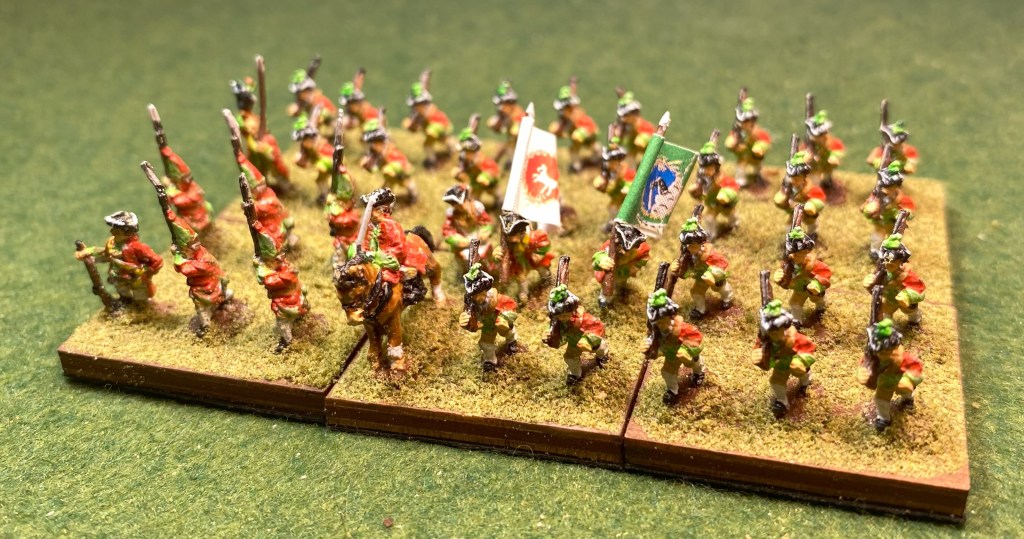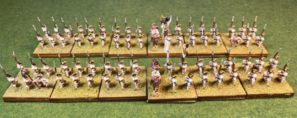 Some years ago, I painted the Piquet companies and Grenadier companies of the Bretagne infantry regiment for the Seven Years War. I’ve finally gotten around to painting the rest of the regiment consisting of two battalions. All figures are 10mm Pendraken.