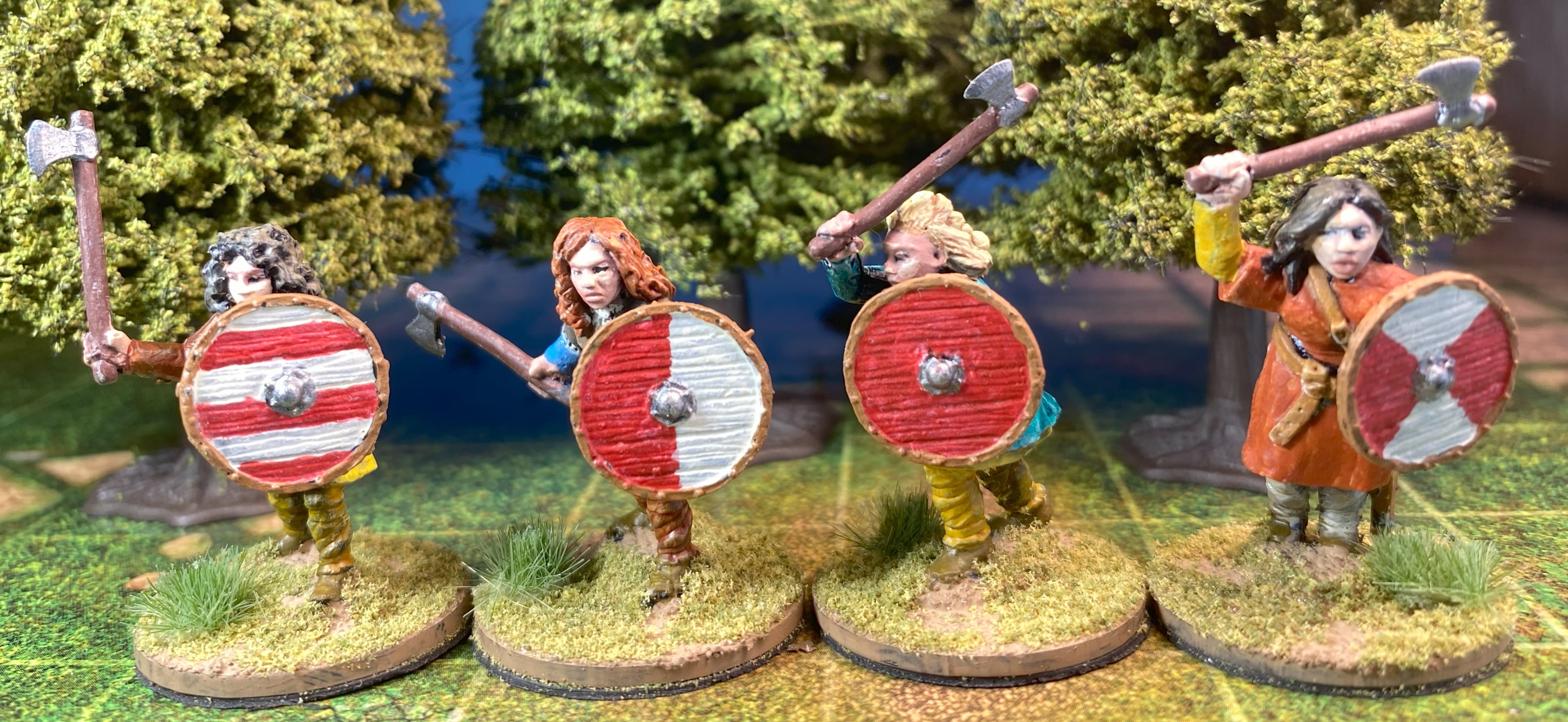 Finished four more of the wonderful shieldmaiden miniatures from Bad Squiddo Games. English is the only language I can speak somewhat reliably, but there are times it confuses me. The old Norse word for a female warrior is “skjaldmaer” which is translated into English as “shield maiden”, “shield-maiden”, and “shieldmaiden”. I’m not sure which is the correct form, but all three are shorter than “crazy-assed bitch who’s going to cut you”.